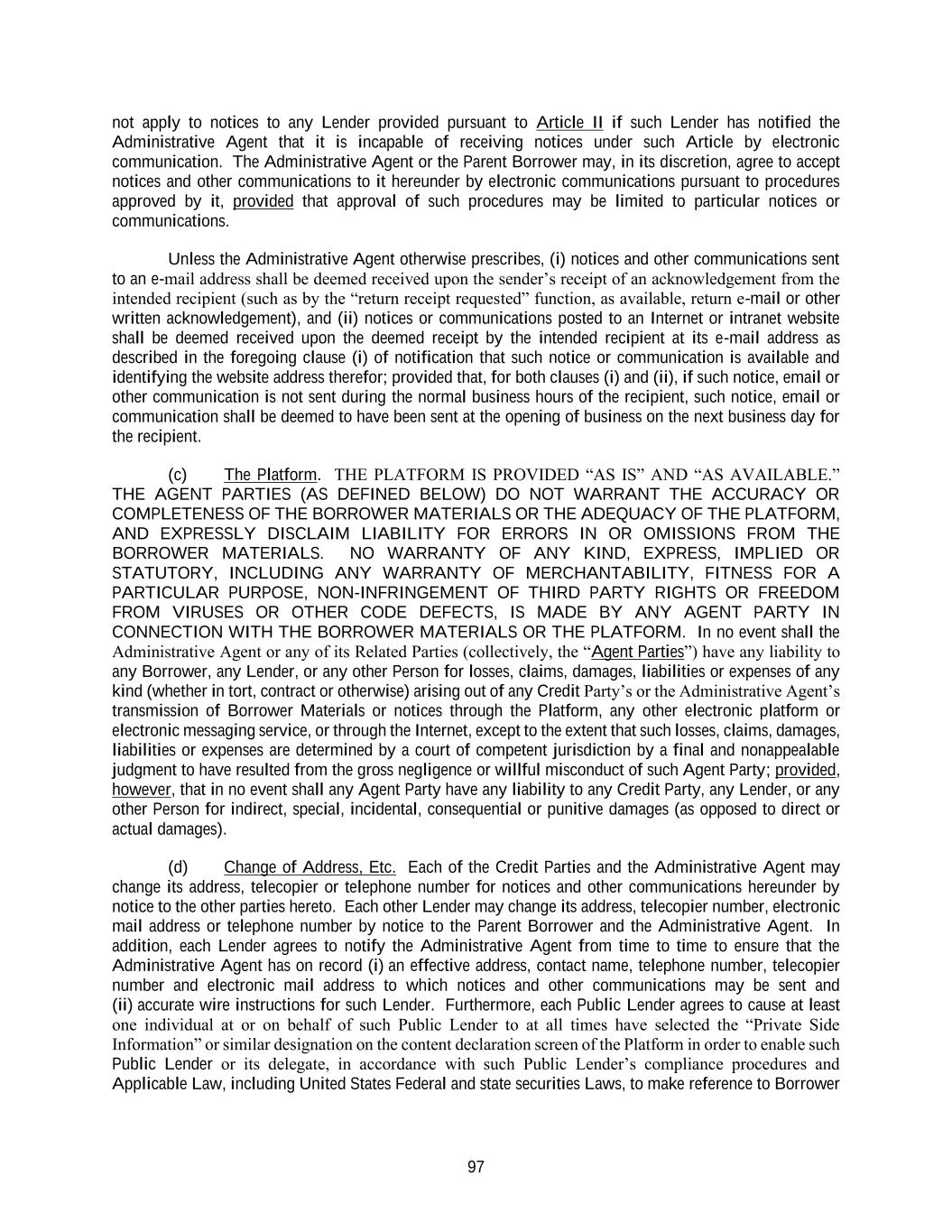 97 not apply to notices to any Lender provided pursuant to Article II if such Lender has notified the Administrative Agent that it is incapable of receiving notices under such Article by electronic communication. The Administrative Agent or the Parent Borrower may, in its discretion, agree to accept notices and other communications to it hereunder by electronic communications pursuant to procedures approved by it, provided that approval of such procedures may be limited to particular notices or communications. Unless the Administrative Agent otherwise prescribes, (i) notices and other communications sent to an e-mail address shall be deemed received upon the sender’s receipt of an acknowledgement from the intended recipient (such as by the “return receipt requested” function, as available, return e-mail or other written acknowledgement), and (ii) notices or communications posted to an Internet or intranet website shall be deemed received upon the deemed receipt by the intended recipient at its e-mail address as described in the foregoing clause (i) of notification that such notice or communication is available and identifying the website address therefor; provided that, for both clauses (i) and (ii), if such notice, email or other communication is not sent during the normal business hours of the recipient, such notice, email or communication shall be deemed to have been sent at the opening of business on the next business day for the recipient. (c) The Platform. THE PLATFORM IS PROVIDED “AS IS” AND “AS AVAILABLE.” THE AGENT PARTIES (AS DEFINED BELOW) DO NOT WARRANT THE ACCURACY OR COMPLETENESS OF THE BORROWER MATERIALS OR THE ADEQUACY OF THE PLATFORM, AND EXPRESSLY DISCLAIM LIABILITY FOR ERRORS IN OR OMISSIONS FROM THE BORROWER MATERIALS. NO WARRANTY OF ANY KIND, EXPRESS, IMPLIED OR STATUTORY, INCLUDING ANY WARRANTY OF MERCHANTABILITY, FITNESS FOR A PARTICULAR PURPOSE, NON-INFRINGEMENT OF THIRD PARTY RIGHTS OR FREEDOM FROM VIRUSES OR OTHER CODE DEFECTS, IS MADE BY ANY AGENT PARTY IN CONNECTION WITH THE BORROWER MATERIALS OR THE PLATFORM. In no event shall the Administrative Agent or any of its Related Parties (collectively, the “Agent Parties”) have any liability to any Borrower, any Lender, or any other Person for losses, claims, damages, liabilities or expenses of any kind (whether in tort, contract or otherwise) arising out of any Credit Party’s or the Administrative Agent’s transmission of Borrower Materials or notices through the Platform, any other electronic platform or electronic messaging service, or through the Internet, except to the extent that such losses, claims, damages, liabilities or expenses are determined by a court of competent jurisdiction by a final and nonappealable judgment to have resulted from the gross negligence or willful misconduct of such Agent Party; provided, however, that in no event shall any Agent Party have any liability to any Credit Party, any Lender, or any other Person for indirect, special, incidental, consequential or punitive damages (as opposed to direct or actual damages). (d) Change of Address, Etc. Each of the Credit Parties and the Administrative Agent may change its address, telecopier or telephone number for notices and other communications hereunder by notice to the other parties hereto. Each other Lender may change its address, telecopier number, electronic mail address or telephone number by notice to the Parent Borrower and the Administrative Agent. In addition, each Lender agrees to notify the Administrative Agent from time to time to ensure that the Administrative Agent has on record (i) an effective address, contact name, telephone number, telecopier number and electronic mail address to which notices and other communications may be sent and (ii) accurate wire instructions for such Lender. Furthermore, each Public Lender agrees to cause at least one individual at or on behalf of such Public Lender to at all times have selected the “Private Side Information” or similar designation on the content declaration screen of the Platform in order to enable such Public Lender or its delegate, in accordance with such Public Lender’s compliance procedures and Applicable Law, including United States Federal and state securities Laws, to make reference to Borrower