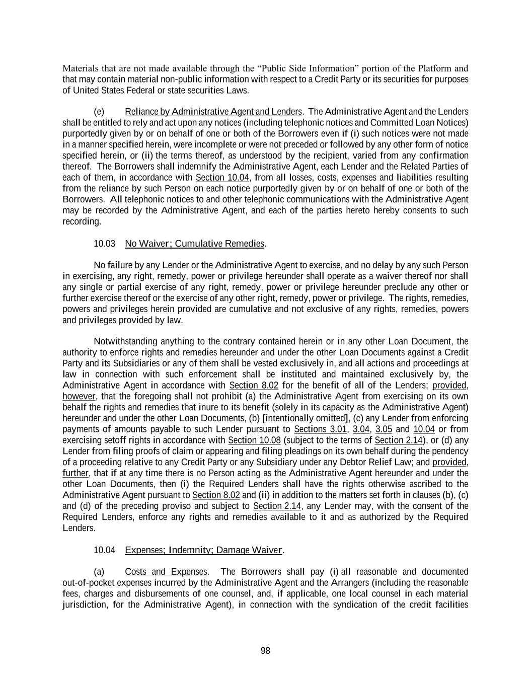 98 Materials that are not made available through the “Public Side Information” portion of the Platform and that may contain material non-public information with respect to a Credit Party or its securities for purposes of United States Federal or state securities Laws. (e) Reliance by Administrative Agent and Lenders. The Administrative Agent and the Lenders shall be entitled to rely and act upon any notices (including telephonic notices and Committed Loan Notices) purportedly given by or on behalf of one or both of the Borrowers even if (i) such notices were not made in a manner specified herein, were incomplete or were not preceded or followed by any other form of notice specified herein, or (ii) the terms thereof, as understood by the recipient, varied from any confirmation thereof. The Borrowers shall indemnify the Administrative Agent, each Lender and the Related Parties of each of them, in accordance with Section 10.04, from all losses, costs, expenses and liabilities resulting from the reliance by such Person on each notice purportedly given by or on behalf of one or both of the Borrowers. All telephonic notices to and other telephonic communications with the Administrative Agent may be recorded by the Administrative Agent, and each of the parties hereto hereby consents to such recording. 10.03 No Waiver; Cumulative Remedies. No failure by any Lender or the Administrative Agent to exercise, and no delay by any such Person in exercising, any right, remedy, power or privilege hereunder shall operate as a waiver thereof nor shall any single or partial exercise of any right, remedy, power or privilege hereunder preclude any other or further exercise thereof or the exercise of any other right, remedy, power or privilege. The rights, remedies, powers and privileges herein provided are cumulative and not exclusive of any rights, remedies, powers and privileges provided by law. Notwithstanding anything to the contrary contained herein or in any other Loan Document, the authority to enforce rights and remedies hereunder and under the other Loan Documents against a Credit Party and its Subsidiaries or any of them shall be vested exclusively in, and all actions and proceedings at law in connection with such enforcement shall be instituted and maintained exclusively by, the Administrative Agent in accordance with Section 8.02 for the benefit of all of the Lenders; provided, however, that the foregoing shall not prohibit (a) the Administrative Agent from exercising on its own behalf the rights and remedies that inure to its benefit (solely in its capacity as the Administrative Agent) hereunder and under the other Loan Documents, (b) [intentionally omitted], (c) any Lender from enforcing payments of amounts payable to such Lender pursuant to Sections 3.01, 3.04, 3.05 and 10.04 or from exercising setoff rights in accordance with Section 10.08 (subject to the terms of Section 2.14), or (d) any Lender from filing proofs of claim or appearing and filing pleadings on its own behalf during the pendency of a proceeding relative to any Credit Party or any Subsidiary under any Debtor Relief Law; and provided, further, that if at any time there is no Person acting as the Administrative Agent hereunder and under the other Loan Documents, then (i) the Required Lenders shall have the rights otherwise ascribed to the Administrative Agent pursuant to Section 8.02 and (ii) in addition to the matters set forth in clauses (b), (c) and (d) of the preceding proviso and subject to Section 2.14, any Lender may, with the consent of the Required Lenders, enforce any rights and remedies available to it and as authorized by the Required Lenders. 10.04 Expenses; Indemnity; Damage Waiver. (a) Costs and Expenses. The Borrowers shall pay (i) all reasonable and documented out-of-pocket expenses incurred by the Administrative Agent and the Arrangers (including the reasonable fees, charges and disbursements of one counsel, and, if applicable, one local counsel in each material jurisdiction, for the Administrative Agent), in connection with the syndication of the credit facilities