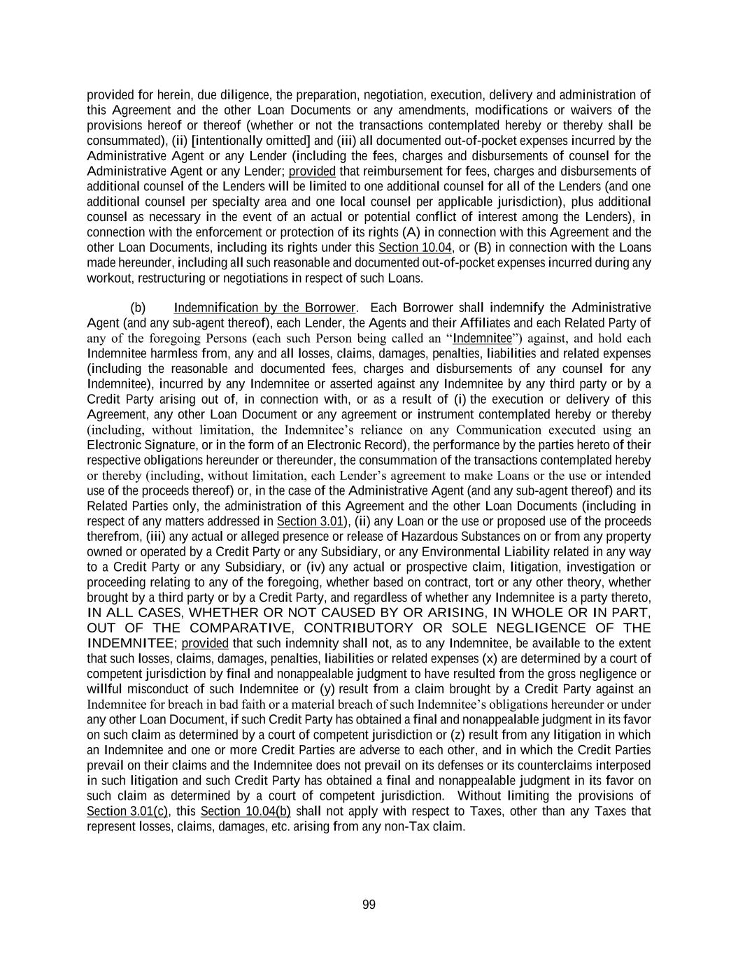 99 provided for herein, due diligence, the preparation, negotiation, execution, delivery and administration of this Agreement and the other Loan Documents or any amendments, modifications or waivers of the provisions hereof or thereof (whether or not the transactions contemplated hereby or thereby shall be consummated), (ii) [intentionally omitted] and (iii) all documented out-of-pocket expenses incurred by the Administrative Agent or any Lender (including the fees, charges and disbursements of counsel for the Administrative Agent or any Lender; provided that reimbursement for fees, charges and disbursements of additional counsel of the Lenders will be limited to one additional counsel for all of the Lenders (and one additional counsel per specialty area and one local counsel per applicable jurisdiction), plus additional counsel as necessary in the event of an actual or potential conflict of interest among the Lenders), in connection with the enforcement or protection of its rights (A) in connection with this Agreement and the other Loan Documents, including its rights under this Section 10.04, or (B) in connection with the Loans made hereunder, including all such reasonable and documented out-of-pocket expenses incurred during any workout, restructuring or negotiations in respect of such Loans. (b) Indemnification by the Borrower. Each Borrower shall indemnify the Administrative Agent (and any sub-agent thereof), each Lender, the Agents and their Affiliates and each Related Party of any of the foregoing Persons (each such Person being called an “Indemnitee”) against, and hold each Indemnitee harmless from, any and all losses, claims, damages, penalties, liabilities and related expenses (including the reasonable and documented fees, charges and disbursements of any counsel for any Indemnitee), incurred by any Indemnitee or asserted against any Indemnitee by any third party or by a Credit Party arising out of, in connection with, or as a result of (i) the execution or delivery of this Agreement, any other Loan Document or any agreement or instrument contemplated hereby or thereby (including, without limitation, the Indemnitee’s reliance on any Communication executed using an Electronic Signature, or in the form of an Electronic Record), the performance by the parties hereto of their respective obligations hereunder or thereunder, the consummation of the transactions contemplated hereby or thereby (including, without limitation, each Lender’s agreement to make Loans or the use or intended use of the proceeds thereof) or, in the case of the Administrative Agent (and any sub-agent thereof) and its Related Parties only, the administration of this Agreement and the other Loan Documents (including in respect of any matters addressed in Section 3.01), (ii) any Loan or the use or proposed use of the proceeds therefrom, (iii) any actual or alleged presence or release of Hazardous Substances on or from any property owned or operated by a Credit Party or any Subsidiary, or any Environmental Liability related in any way to a Credit Party or any Subsidiary, or (iv) any actual or prospective claim, litigation, investigation or proceeding relating to any of the foregoing, whether based on contract, tort or any other theory, whether brought by a third party or by a Credit Party, and regardless of whether any Indemnitee is a party thereto, IN ALL CASES, WHETHER OR NOT CAUSED BY OR ARISING, IN WHOLE OR IN PART, OUT OF THE COMPARATIVE, CONTRIBUTORY OR SOLE NEGLIGENCE OF THE INDEMNITEE; provided that such indemnity shall not, as to any Indemnitee, be available to the extent that such losses, claims, damages, penalties, liabilities or related expenses (x) are determined by a court of competent jurisdiction by final and nonappealable judgment to have resulted from the gross negligence or willful misconduct of such Indemnitee or (y) result from a claim brought by a Credit Party against an Indemnitee for breach in bad faith or a material breach of such Indemnitee’s obligations hereunder or under any other Loan Document, if such Credit Party has obtained a final and nonappealable judgment in its favor on such claim as determined by a court of competent jurisdiction or (z) result from any litigation in which an Indemnitee and one or more Credit Parties are adverse to each other, and in which the Credit Parties prevail on their claims and the Indemnitee does not prevail on its defenses or its counterclaims interposed in such litigation and such Credit Party has obtained a final and nonappealable judgment in its favor on such claim as determined by a court of competent jurisdiction. Without limiting the provisions of Section 3.01(c), this Section 10.04(b) shall not apply with respect to Taxes, other than any Taxes that represent losses, claims, damages, etc. arising from any non-Tax claim.
