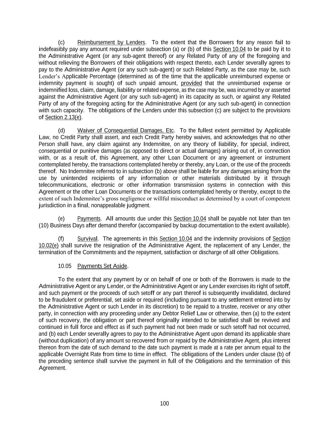 100 (c) Reimbursement by Lenders. To the extent that the Borrowers for any reason fail to indefeasibly pay any amount required under subsection (a) or (b) of this Section 10.04 to be paid by it to the Administrative Agent (or any sub-agent thereof) or any Related Party of any of the foregoing and without relieving the Borrowers of their obligations with respect thereto, each Lender severally agrees to pay to the Administrative Agent (or any such sub-agent) or such Related Party, as the case may be, such Lender’s Applicable Percentage (determined as of the time that the applicable unreimbursed expense or indemnity payment is sought) of such unpaid amount, provided that the unreimbursed expense or indemnified loss, claim, damage, liability or related expense, as the case may be, was incurred by or asserted against the Administrative Agent (or any such sub-agent) in its capacity as such, or against any Related Party of any of the foregoing acting for the Administrative Agent (or any such sub-agent) in connection with such capacity. The obligations of the Lenders under this subsection (c) are subject to the provisions of Section 2.13(e). (d) Waiver of Consequential Damages, Etc. To the fullest extent permitted by Applicable Law, no Credit Party shall assert, and each Credit Party hereby waives, and acknowledges that no other Person shall have, any claim against any Indemnitee, on any theory of liability, for special, indirect, consequential or punitive damages (as opposed to direct or actual damages) arising out of, in connection with, or as a result of, this Agreement, any other Loan Document or any agreement or instrument contemplated hereby, the transactions contemplated hereby or thereby, any Loan, or the use of the proceeds thereof. No Indemnitee referred to in subsection (b) above shall be liable for any damages arising from the use by unintended recipients of any information or other materials distributed by it through telecommunications, electronic or other information transmission systems in connection with this Agreement or the other Loan Documents or the transactions contemplated hereby or thereby, except to the extent of such Indemnitee’s gross negligence or willful misconduct as determined by a court of competent jurisdiction in a final, nonappealable judgment. (e) Payments. All amounts due under this Section 10.04 shall be payable not later than ten (10) Business Days after demand therefor (accompanied by backup documentation to the extent available). (f) Survival. The agreements in this Section 10.04 and the indemnity provisions of Section 10.02(e) shall survive the resignation of the Administrative Agent, the replacement of any Lender, the termination of the Commitments and the repayment, satisfaction or discharge of all other Obligations. 10.05 Payments Set Aside. To the extent that any payment by or on behalf of one or both of the Borrowers is made to the Administrative Agent or any Lender, or the Administrative Agent or any Lender exercises its right of setoff, and such payment or the proceeds of such setoff or any part thereof is subsequently invalidated, declared to be fraudulent or preferential, set aside or required (including pursuant to any settlement entered into by the Administrative Agent or such Lender in its discretion) to be repaid to a trustee, receiver or any other party, in connection with any proceeding under any Debtor Relief Law or otherwise, then (a) to the extent of such recovery, the obligation or part thereof originally intended to be satisfied shall be revived and continued in full force and effect as if such payment had not been made or such setoff had not occurred, and (b) each Lender severally agrees to pay to the Administrative Agent upon demand its applicable share (without duplication) of any amount so recovered from or repaid by the Administrative Agent, plus interest thereon from the date of such demand to the date such payment is made at a rate per annum equal to the applicable Overnight Rate from time to time in effect. The obligations of the Lenders under clause (b) of the preceding sentence shall survive the payment in full of the Obligations and the termination of this Agreement.