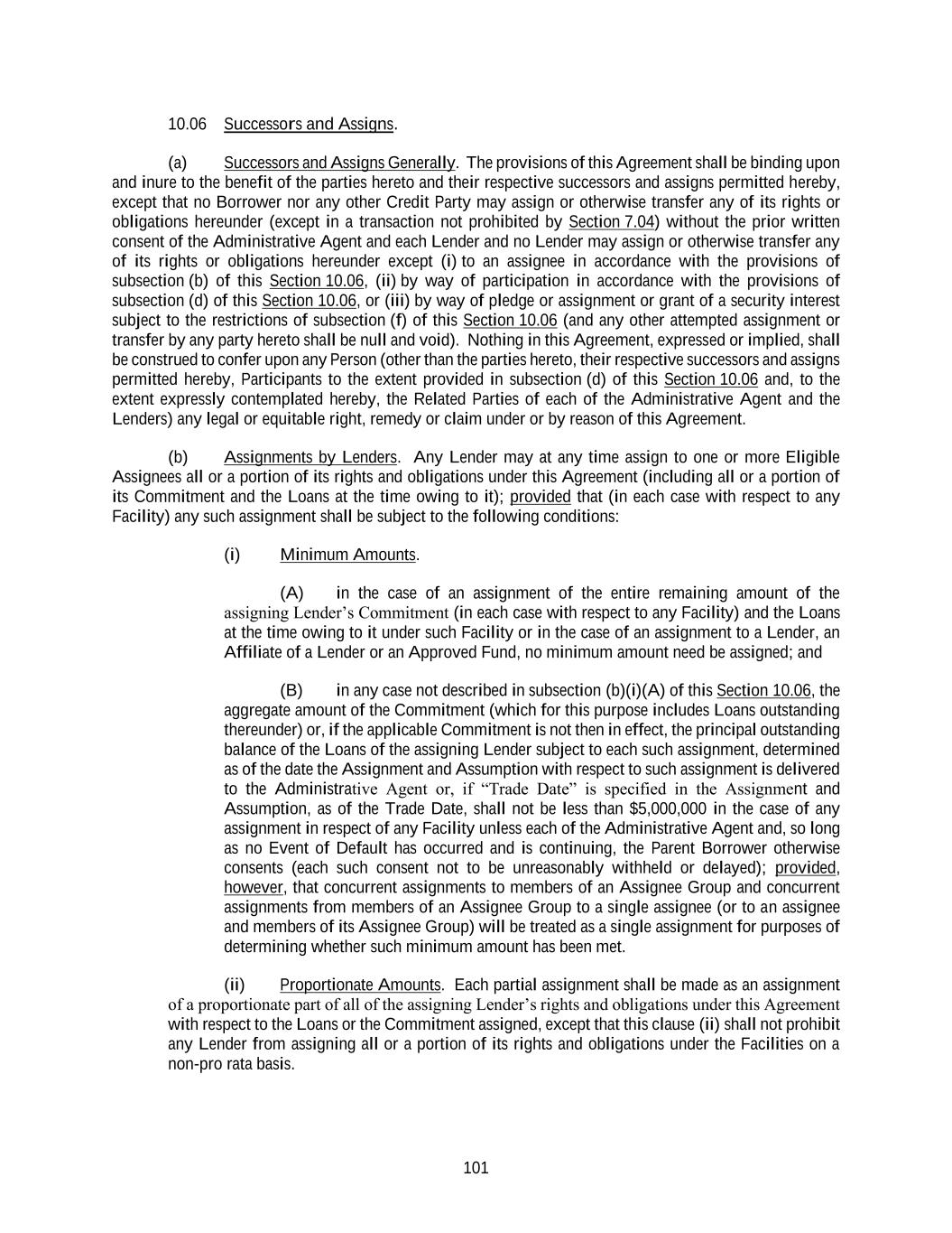 101 10.06 Successors and Assigns. (a) Successors and Assigns Generally. The provisions of this Agreement shall be binding upon and inure to the benefit of the parties hereto and their respective successors and assigns permitted hereby, except that no Borrower nor any other Credit Party may assign or otherwise transfer any of its rights or obligations hereunder (except in a transaction not prohibited by Section 7.04) without the prior written consent of the Administrative Agent and each Lender and no Lender may assign or otherwise transfer any of its rights or obligations hereunder except (i) to an assignee in accordance with the provisions of subsection (b) of this Section 10.06, (ii) by way of participation in accordance with the provisions of subsection (d) of this Section 10.06, or (iii) by way of pledge or assignment or grant of a security interest subject to the restrictions of subsection (f) of this Section 10.06 (and any other attempted assignment or transfer by any party hereto shall be null and void). Nothing in this Agreement, expressed or implied, shall be construed to confer upon any Person (other than the parties hereto, their respective successors and assigns permitted hereby, Participants to the extent provided in subsection (d) of this Section 10.06 and, to the extent expressly contemplated hereby, the Related Parties of each of the Administrative Agent and the Lenders) any legal or equitable right, remedy or claim under or by reason of this Agreement. (b) Assignments by Lenders. Any Lender may at any time assign to one or more Eligible Assignees all or a portion of its rights and obligations under this Agreement (including all or a portion of its Commitment and the Loans at the time owing to it); provided that (in each case with respect to any Facility) any such assignment shall be subject to the following conditions: (i) Minimum Amounts. (A) in the case of an assignment of the entire remaining amount of the assigning Lender’s Commitment (in each case with respect to any Facility) and the Loans at the time owing to it under such Facility or in the case of an assignment to a Lender, an Affiliate of a Lender or an Approved Fund, no minimum amount need be assigned; and (B) in any case not described in subsection (b)(i)(A) of this Section 10.06, the aggregate amount of the Commitment (which for this purpose includes Loans outstanding thereunder) or, if the applicable Commitment is not then in effect, the principal outstanding balance of the Loans of the assigning Lender subject to each such assignment, determined as of the date the Assignment and Assumption with respect to such assignment is delivered to the Administrative Agent or, if “Trade Date” is specified in the Assignment and Assumption, as of the Trade Date, shall not be less than $5,000,000 in the case of any assignment in respect of any Facility unless each of the Administrative Agent and, so long as no Event of Default has occurred and is continuing, the Parent Borrower otherwise consents (each such consent not to be unreasonably withheld or delayed); provided, however, that concurrent assignments to members of an Assignee Group and concurrent assignments from members of an Assignee Group to a single assignee (or to an assignee and members of its Assignee Group) will be treated as a single assignment for purposes of determining whether such minimum amount has been met. (ii) Proportionate Amounts. Each partial assignment shall be made as an assignment of a proportionate part of all of the assigning Lender’s rights and obligations under this Agreement with respect to the Loans or the Commitment assigned, except that this clause (ii) shall not prohibit any Lender from assigning all or a portion of its rights and obligations under the Facilities on a non-pro rata basis.