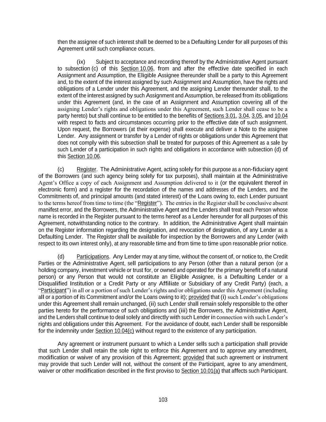 103 then the assignee of such interest shall be deemed to be a Defaulting Lender for all purposes of this Agreement until such compliance occurs. (ix) Subject to acceptance and recording thereof by the Administrative Agent pursuant to subsection (c) of this Section 10.06, from and after the effective date specified in each Assignment and Assumption, the Eligible Assignee thereunder shall be a party to this Agreement and, to the extent of the interest assigned by such Assignment and Assumption, have the rights and obligations of a Lender under this Agreement, and the assigning Lender thereunder shall, to the extent of the interest assigned by such Assignment and Assumption, be released from its obligations under this Agreement (and, in the case of an Assignment and Assumption covering all of the assigning Lender’s rights and obligations under this Agreement, such Lender shall cease to be a party hereto) but shall continue to be entitled to the benefits of Sections 3.01, 3.04, 3.05, and 10.04 with respect to facts and circumstances occurring prior to the effective date of such assignment. Upon request, the Borrowers (at their expense) shall execute and deliver a Note to the assignee Lender. Any assignment or transfer by a Lender of rights or obligations under this Agreement that does not comply with this subsection shall be treated for purposes of this Agreement as a sale by such Lender of a participation in such rights and obligations in accordance with subsection (d) of this Section 10.06. (c) Register. The Administrative Agent, acting solely for this purpose as a non-fiduciary agent of the Borrowers (and such agency being solely for tax purposes), shall maintain at the Administrative Agent’s Office a copy of each Assignment and Assumption delivered to it (or the equivalent thereof in electronic form) and a register for the recordation of the names and addresses of the Lenders, and the Commitments of, and principal amounts (and stated interest) of the Loans owing to, each Lender pursuant to the terms hereof from time to time (the “Register”). The entries in the Register shall be conclusive absent manifest error, and the Borrowers, the Administrative Agent and the Lenders shall treat each Person whose name is recorded in the Register pursuant to the terms hereof as a Lender hereunder for all purposes of this Agreement, notwithstanding notice to the contrary. In addition, the Administrative Agent shall maintain on the Register information regarding the designation, and revocation of designation, of any Lender as a Defaulting Lender. The Register shall be available for inspection by the Borrowers and any Lender (with respect to its own interest only), at any reasonable time and from time to time upon reasonable prior notice. (d) Participations. Any Lender may at any time, without the consent of, or notice to, the Credit Parties or the Administrative Agent, sell participations to any Person (other than a natural person (or a holding company, investment vehicle or trust for, or owned and operated for the primary benefit of a natural person) or any Person that would not constitute an Eligible Assignee, is a Defaulting Lender or a Disqualified Institution or a Credit Party or any Affiliate or Subsidiary of any Credit Party) (each, a “Participant”) in all or a portion of such Lender’s rights and/or obligations under this Agreement (including all or a portion of its Commitment and/or the Loans owing to it); provided that (i) such Lender’s obligations under this Agreement shall remain unchanged, (ii) such Lender shall remain solely responsible to the other parties hereto for the performance of such obligations and (iii) the Borrowers, the Administrative Agent, and the Lenders shall continue to deal solely and directly with such Lender in connection with such Lender’s rights and obligations under this Agreement. For the avoidance of doubt, each Lender shall be responsible for the indemnity under Section 10.04(c) without regard to the existence of any participation. Any agreement or instrument pursuant to which a Lender sells such a participation shall provide that such Lender shall retain the sole right to enforce this Agreement and to approve any amendment, modification or waiver of any provision of this Agreement; provided that such agreement or instrument may provide that such Lender will not, without the consent of the Participant, agree to any amendment, waiver or other modification described in the first proviso to Section 10.01(a) that affects such Participant.