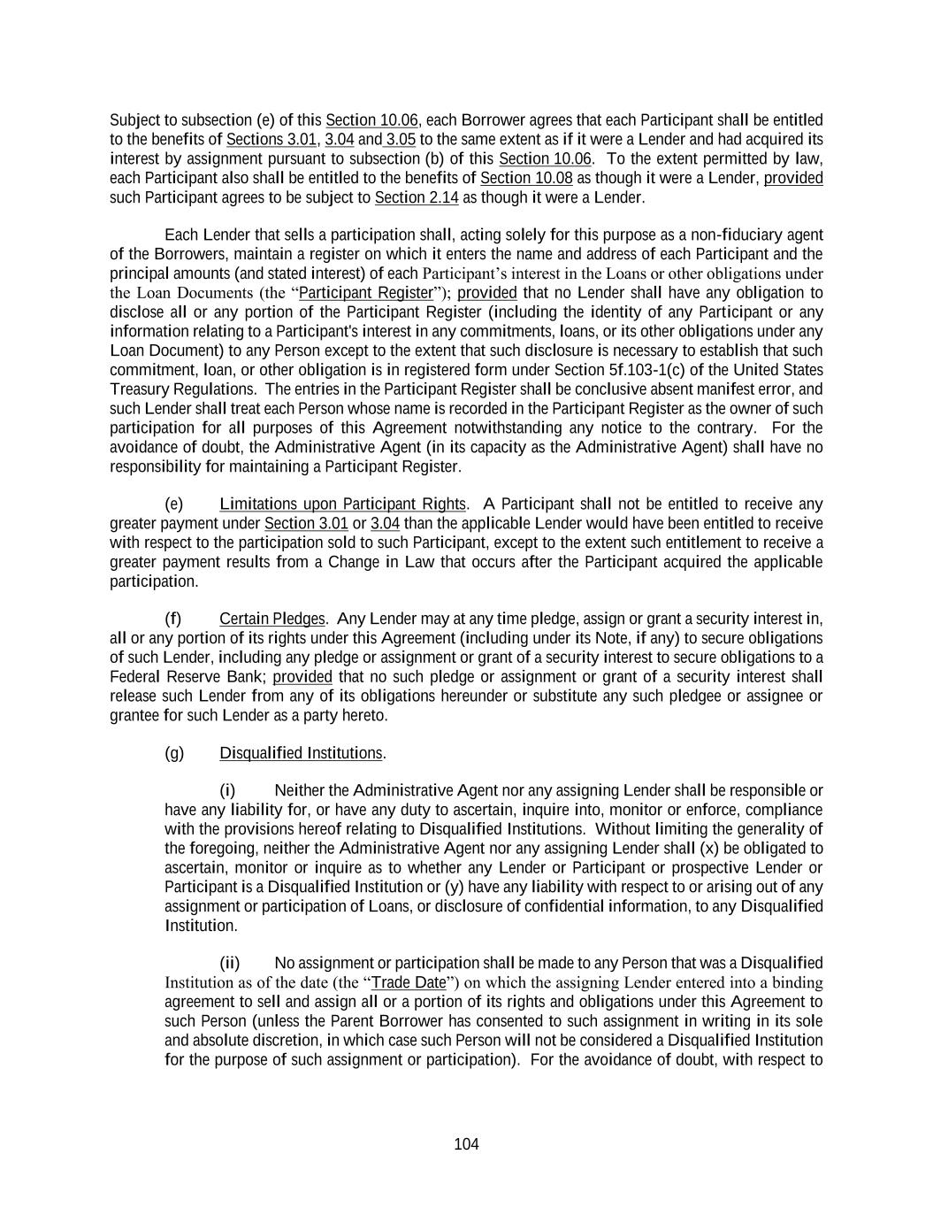 104 Subject to subsection (e) of this Section 10.06, each Borrower agrees that each Participant shall be entitled to the benefits of Sections 3.01, 3.04 and 3.05 to the same extent as if it were a Lender and had acquired its interest by assignment pursuant to subsection (b) of this Section 10.06. To the extent permitted by law, each Participant also shall be entitled to the benefits of Section 10.08 as though it were a Lender, provided such Participant agrees to be subject to Section 2.14 as though it were a Lender. Each Lender that sells a participation shall, acting solely for this purpose as a non-fiduciary agent of the Borrowers, maintain a register on which it enters the name and address of each Participant and the principal amounts (and stated interest) of each Participant’s interest in the Loans or other obligations under the Loan Documents (the “Participant Register”); provided that no Lender shall have any obligation to disclose all or any portion of the Participant Register (including the identity of any Participant or any information relating to a Participant's interest in any commitments, loans, or its other obligations under any Loan Document) to any Person except to the extent that such disclosure is necessary to establish that such commitment, loan, or other obligation is in registered form under Section 5f.103-1(c) of the United States Treasury Regulations. The entries in the Participant Register shall be conclusive absent manifest error, and such Lender shall treat each Person whose name is recorded in the Participant Register as the owner of such participation for all purposes of this Agreement notwithstanding any notice to the contrary. For the avoidance of doubt, the Administrative Agent (in its capacity as the Administrative Agent) shall have no responsibility for maintaining a Participant Register. (e) Limitations upon Participant Rights. A Participant shall not be entitled to receive any greater payment under Section 3.01 or 3.04 than the applicable Lender would have been entitled to receive with respect to the participation sold to such Participant, except to the extent such entitlement to receive a greater payment results from a Change in Law that occurs after the Participant acquired the applicable participation. (f) Certain Pledges. Any Lender may at any time pledge, assign or grant a security interest in, all or any portion of its rights under this Agreement (including under its Note, if any) to secure obligations of such Lender, including any pledge or assignment or grant of a security interest to secure obligations to a Federal Reserve Bank; provided that no such pledge or assignment or grant of a security interest shall release such Lender from any of its obligations hereunder or substitute any such pledgee or assignee or grantee for such Lender as a party hereto. (g) Disqualified Institutions. (i) Neither the Administrative Agent nor any assigning Lender shall be responsible or have any liability for, or have any duty to ascertain, inquire into, monitor or enforce, compliance with the provisions hereof relating to Disqualified Institutions. Without limiting the generality of the foregoing, neither the Administrative Agent nor any assigning Lender shall (x) be obligated to ascertain, monitor or inquire as to whether any Lender or Participant or prospective Lender or Participant is a Disqualified Institution or (y) have any liability with respect to or arising out of any assignment or participation of Loans, or disclosure of confidential information, to any Disqualified Institution. (ii) No assignment or participation shall be made to any Person that was a Disqualified Institution as of the date (the “Trade Date”) on which the assigning Lender entered into a binding agreement to sell and assign all or a portion of its rights and obligations under this Agreement to such Person (unless the Parent Borrower has consented to such assignment in writing in its sole and absolute discretion, in which case such Person will not be considered a Disqualified Institution for the purpose of such assignment or participation). For the avoidance of doubt, with respect to