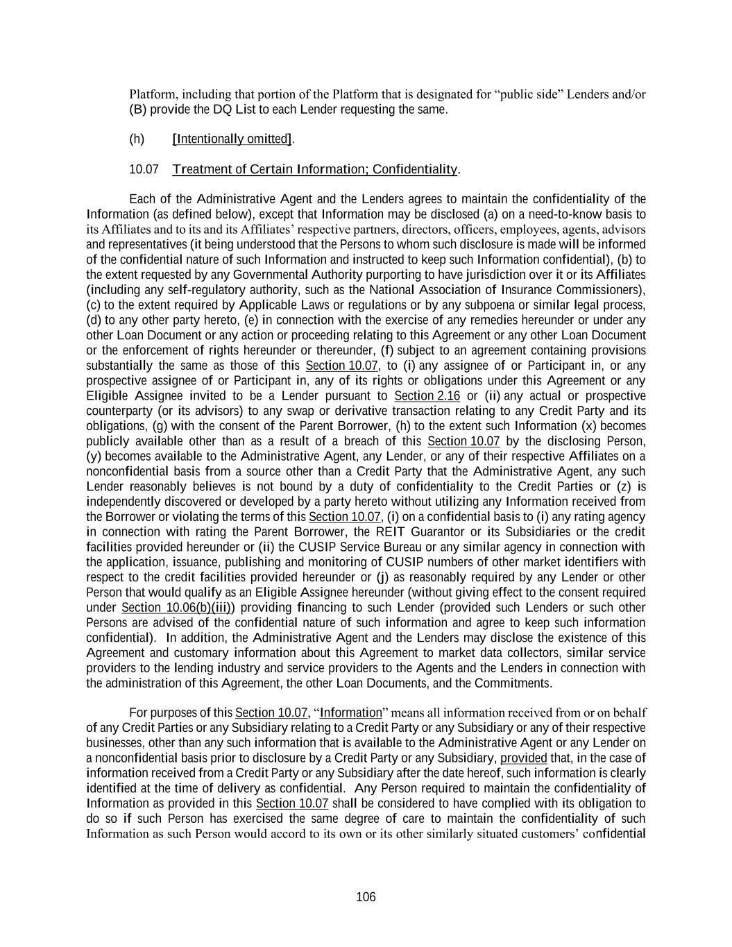 106 Platform, including that portion of the Platform that is designated for “public side” Lenders and/or (B) provide the DQ List to each Lender requesting the same. (h) [Intentionally omitted]. 10.07 Treatment of Certain Information; Confidentiality. Each of the Administrative Agent and the Lenders agrees to maintain the confidentiality of the Information (as defined below), except that Information may be disclosed (a) on a need-to-know basis to its Affiliates and to its and its Affiliates’ respective partners, directors, officers, employees, agents, advisors and representatives (it being understood that the Persons to whom such disclosure is made will be informed of the confidential nature of such Information and instructed to keep such Information confidential), (b) to the extent requested by any Governmental Authority purporting to have jurisdiction over it or its Affiliates (including any self-regulatory authority, such as the National Association of Insurance Commissioners), (c) to the extent required by Applicable Laws or regulations or by any subpoena or similar legal process, (d) to any other party hereto, (e) in connection with the exercise of any remedies hereunder or under any other Loan Document or any action or proceeding relating to this Agreement or any other Loan Document or the enforcement of rights hereunder or thereunder, (f) subject to an agreement containing provisions substantially the same as those of this Section 10.07, to (i) any assignee of or Participant in, or any prospective assignee of or Participant in, any of its rights or obligations under this Agreement or any Eligible Assignee invited to be a Lender pursuant to Section 2.16 or (ii) any actual or prospective counterparty (or its advisors) to any swap or derivative transaction relating to any Credit Party and its obligations, (g) with the consent of the Parent Borrower, (h) to the extent such Information (x) becomes publicly available other than as a result of a breach of this Section 10.07 by the disclosing Person, (y) becomes available to the Administrative Agent, any Lender, or any of their respective Affiliates on a nonconfidential basis from a source other than a Credit Party that the Administrative Agent, any such Lender reasonably believes is not bound by a duty of confidentiality to the Credit Parties or (z) is independently discovered or developed by a party hereto without utilizing any Information received from the Borrower or violating the terms of this Section 10.07, (i) on a confidential basis to (i) any rating agency in connection with rating the Parent Borrower, the REIT Guarantor or its Subsidiaries or the credit facilities provided hereunder or (ii) the CUSIP Service Bureau or any similar agency in connection with the application, issuance, publishing and monitoring of CUSIP numbers of other market identifiers with respect to the credit facilities provided hereunder or (j) as reasonably required by any Lender or other Person that would qualify as an Eligible Assignee hereunder (without giving effect to the consent required under Section 10.06(b)(iii)) providing financing to such Lender (provided such Lenders or such other Persons are advised of the confidential nature of such information and agree to keep such information confidential). In addition, the Administrative Agent and the Lenders may disclose the existence of this Agreement and customary information about this Agreement to market data collectors, similar service providers to the lending industry and service providers to the Agents and the Lenders in connection with the administration of this Agreement, the other Loan Documents, and the Commitments. For purposes of this Section 10.07, “Information” means all information received from or on behalf of any Credit Parties or any Subsidiary relating to a Credit Party or any Subsidiary or any of their respective businesses, other than any such information that is available to the Administrative Agent or any Lender on a nonconfidential basis prior to disclosure by a Credit Party or any Subsidiary, provided that, in the case of information received from a Credit Party or any Subsidiary after the date hereof, such information is clearly identified at the time of delivery as confidential. Any Person required to maintain the confidentiality of Information as provided in this Section 10.07 shall be considered to have complied with its obligation to do so if such Person has exercised the same degree of care to maintain the confidentiality of such Information as such Person would accord to its own or its other similarly situated customers’ confidential