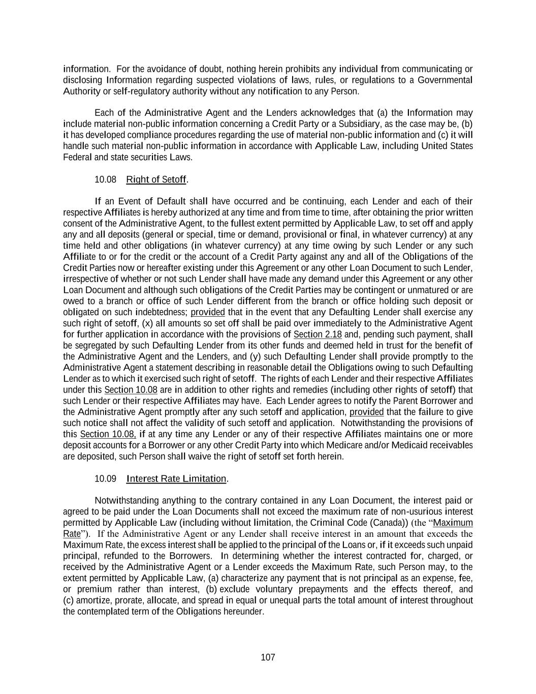 107 information. For the avoidance of doubt, nothing herein prohibits any individual from communicating or disclosing Information regarding suspected violations of laws, rules, or regulations to a Governmental Authority or self-regulatory authority without any notification to any Person. Each of the Administrative Agent and the Lenders acknowledges that (a) the Information may include material non-public information concerning a Credit Party or a Subsidiary, as the case may be, (b) it has developed compliance procedures regarding the use of material non-public information and (c) it will handle such material non-public information in accordance with Applicable Law, including United States Federal and state securities Laws. 10.08 Right of Setoff. If an Event of Default shall have occurred and be continuing, each Lender and each of their respective Affiliates is hereby authorized at any time and from time to time, after obtaining the prior written consent of the Administrative Agent, to the fullest extent permitted by Applicable Law, to set off and apply any and all deposits (general or special, time or demand, provisional or final, in whatever currency) at any time held and other obligations (in whatever currency) at any time owing by such Lender or any such Affiliate to or for the credit or the account of a Credit Party against any and all of the Obligations of the Credit Parties now or hereafter existing under this Agreement or any other Loan Document to such Lender, irrespective of whether or not such Lender shall have made any demand under this Agreement or any other Loan Document and although such obligations of the Credit Parties may be contingent or unmatured or are owed to a branch or office of such Lender different from the branch or office holding such deposit or obligated on such indebtedness; provided that in the event that any Defaulting Lender shall exercise any such right of setoff, (x) all amounts so set off shall be paid over immediately to the Administrative Agent for further application in accordance with the provisions of Section 2.18 and, pending such payment, shall be segregated by such Defaulting Lender from its other funds and deemed held in trust for the benefit of the Administrative Agent and the Lenders, and (y) such Defaulting Lender shall provide promptly to the Administrative Agent a statement describing in reasonable detail the Obligations owing to such Defaulting Lender as to which it exercised such right of setoff. The rights of each Lender and their respective Affiliates under this Section 10.08 are in addition to other rights and remedies (including other rights of setoff) that such Lender or their respective Affiliates may have. Each Lender agrees to notify the Parent Borrower and the Administrative Agent promptly after any such setoff and application, provided that the failure to give such notice shall not affect the validity of such setoff and application. Notwithstanding the provisions of this Section 10.08, if at any time any Lender or any of their respective Affiliates maintains one or more deposit accounts for a Borrower or any other Credit Party into which Medicare and/or Medicaid receivables are deposited, such Person shall waive the right of setoff set forth herein. 10.09 Interest Rate Limitation. Notwithstanding anything to the contrary contained in any Loan Document, the interest paid or agreed to be paid under the Loan Documents shall not exceed the maximum rate of non-usurious interest permitted by Applicable Law (including without limitation, the Criminal Code (Canada)) (the “Maximum Rate”). If the Administrative Agent or any Lender shall receive interest in an amount that exceeds the Maximum Rate, the excess interest shall be applied to the principal of the Loans or, if it exceeds such unpaid principal, refunded to the Borrowers. In determining whether the interest contracted for, charged, or received by the Administrative Agent or a Lender exceeds the Maximum Rate, such Person may, to the extent permitted by Applicable Law, (a) characterize any payment that is not principal as an expense, fee, or premium rather than interest, (b) exclude voluntary prepayments and the effects thereof, and (c) amortize, prorate, allocate, and spread in equal or unequal parts the total amount of interest throughout the contemplated term of the Obligations hereunder.