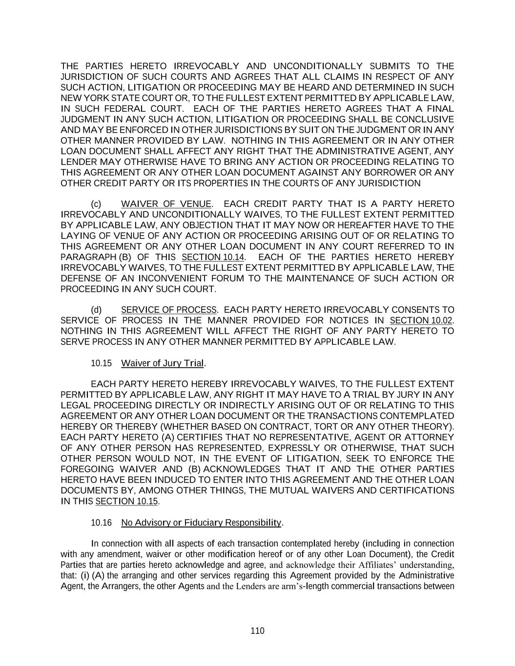 110 THE PARTIES HERETO IRREVOCABLY AND UNCONDITIONALLY SUBMITS TO THE JURISDICTION OF SUCH COURTS AND AGREES THAT ALL CLAIMS IN RESPECT OF ANY SUCH ACTION, LITIGATION OR PROCEEDING MAY BE HEARD AND DETERMINED IN SUCH NEW YORK STATE COURT OR, TO THE FULLEST EXTENT PERMITTED BY APPLICABLE LAW, IN SUCH FEDERAL COURT. EACH OF THE PARTIES HERETO AGREES THAT A FINAL JUDGMENT IN ANY SUCH ACTION, LITIGATION OR PROCEEDING SHALL BE CONCLUSIVE AND MAY BE ENFORCED IN OTHER JURISDICTIONS BY SUIT ON THE JUDGMENT OR IN ANY OTHER MANNER PROVIDED BY LAW. NOTHING IN THIS AGREEMENT OR IN ANY OTHER LOAN DOCUMENT SHALL AFFECT ANY RIGHT THAT THE ADMINISTRATIVE AGENT, ANY LENDER MAY OTHERWISE HAVE TO BRING ANY ACTION OR PROCEEDING RELATING TO THIS AGREEMENT OR ANY OTHER LOAN DOCUMENT AGAINST ANY BORROWER OR ANY OTHER CREDIT PARTY OR ITS PROPERTIES IN THE COURTS OF ANY JURISDICTION (c) WAIVER OF VENUE. EACH CREDIT PARTY THAT IS A PARTY HERETO IRREVOCABLY AND UNCONDITIONALLY WAIVES, TO THE FULLEST EXTENT PERMITTED BY APPLICABLE LAW, ANY OBJECTION THAT IT MAY NOW OR HEREAFTER HAVE TO THE LAYING OF VENUE OF ANY ACTION OR PROCEEDING ARISING OUT OF OR RELATING TO THIS AGREEMENT OR ANY OTHER LOAN DOCUMENT IN ANY COURT REFERRED TO IN PARAGRAPH (B) OF THIS SECTION 10.14. EACH OF THE PARTIES HERETO HEREBY IRREVOCABLY WAIVES, TO THE FULLEST EXTENT PERMITTED BY APPLICABLE LAW, THE DEFENSE OF AN INCONVENIENT FORUM TO THE MAINTENANCE OF SUCH ACTION OR PROCEEDING IN ANY SUCH COURT. (d) SERVICE OF PROCESS. EACH PARTY HERETO IRREVOCABLY CONSENTS TO SERVICE OF PROCESS IN THE MANNER PROVIDED FOR NOTICES IN SECTION 10.02. NOTHING IN THIS AGREEMENT WILL AFFECT THE RIGHT OF ANY PARTY HERETO TO SERVE PROCESS IN ANY OTHER MANNER PERMITTED BY APPLICABLE LAW. 10.15 Waiver of Jury Trial. EACH PARTY HERETO HEREBY IRREVOCABLY WAIVES, TO THE FULLEST EXTENT PERMITTED BY APPLICABLE LAW, ANY RIGHT IT MAY HAVE TO A TRIAL BY JURY IN ANY LEGAL PROCEEDING DIRECTLY OR INDIRECTLY ARISING OUT OF OR RELATING TO THIS AGREEMENT OR ANY OTHER LOAN DOCUMENT OR THE TRANSACTIONS CONTEMPLATED HEREBY OR THEREBY (WHETHER BASED ON CONTRACT, TORT OR ANY OTHER THEORY). EACH PARTY HERETO (A) CERTIFIES THAT NO REPRESENTATIVE, AGENT OR ATTORNEY OF ANY OTHER PERSON HAS REPRESENTED, EXPRESSLY OR OTHERWISE, THAT SUCH OTHER PERSON WOULD NOT, IN THE EVENT OF LITIGATION, SEEK TO ENFORCE THE FOREGOING WAIVER AND (B) ACKNOWLEDGES THAT IT AND THE OTHER PARTIES HERETO HAVE BEEN INDUCED TO ENTER INTO THIS AGREEMENT AND THE OTHER LOAN DOCUMENTS BY, AMONG OTHER THINGS, THE MUTUAL WAIVERS AND CERTIFICATIONS IN THIS SECTION 10.15. 10.16 No Advisory or Fiduciary Responsibility. In connection with all aspects of each transaction contemplated hereby (including in connection with any amendment, waiver or other modification hereof or of any other Loan Document), the Credit Parties that are parties hereto acknowledge and agree, and acknowledge their Affiliates’ understanding, that: (i) (A) the arranging and other services regarding this Agreement provided by the Administrative Agent, the Arrangers, the other Agents and the Lenders are arm’s-length commercial transactions between