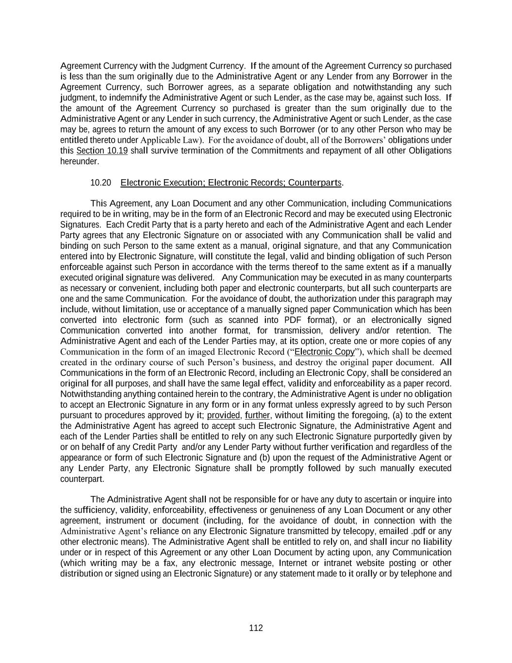 112 Agreement Currency with the Judgment Currency. If the amount of the Agreement Currency so purchased is less than the sum originally due to the Administrative Agent or any Lender from any Borrower in the Agreement Currency, such Borrower agrees, as a separate obligation and notwithstanding any such judgment, to indemnify the Administrative Agent or such Lender, as the case may be, against such loss. If the amount of the Agreement Currency so purchased is greater than the sum originally due to the Administrative Agent or any Lender in such currency, the Administrative Agent or such Lender, as the case may be, agrees to return the amount of any excess to such Borrower (or to any other Person who may be entitled thereto under Applicable Law). For the avoidance of doubt, all of the Borrowers’ obligations under this Section 10.19 shall survive termination of the Commitments and repayment of all other Obligations hereunder. 10.20 Electronic Execution; Electronic Records; Counterparts. This Agreement, any Loan Document and any other Communication, including Communications required to be in writing, may be in the form of an Electronic Record and may be executed using Electronic Signatures. Each Credit Party that is a party hereto and each of the Administrative Agent and each Lender Party agrees that any Electronic Signature on or associated with any Communication shall be valid and binding on such Person to the same extent as a manual, original signature, and that any Communication entered into by Electronic Signature, will constitute the legal, valid and binding obligation of such Person enforceable against such Person in accordance with the terms thereof to the same extent as if a manually executed original signature was delivered. Any Communication may be executed in as many counterparts as necessary or convenient, including both paper and electronic counterparts, but all such counterparts are one and the same Communication. For the avoidance of doubt, the authorization under this paragraph may include, without limitation, use or acceptance of a manually signed paper Communication which has been converted into electronic form (such as scanned into PDF format), or an electronically signed Communication converted into another format, for transmission, delivery and/or retention. The Administrative Agent and each of the Lender Parties may, at its option, create one or more copies of any Communication in the form of an imaged Electronic Record (“Electronic Copy”), which shall be deemed created in the ordinary course of such Person’s business, and destroy the original paper document. All Communications in the form of an Electronic Record, including an Electronic Copy, shall be considered an original for all purposes, and shall have the same legal effect, validity and enforceability as a paper record. Notwithstanding anything contained herein to the contrary, the Administrative Agent is under no obligation to accept an Electronic Signature in any form or in any format unless expressly agreed to by such Person pursuant to procedures approved by it; provided, further, without limiting the foregoing, (a) to the extent the Administrative Agent has agreed to accept such Electronic Signature, the Administrative Agent and each of the Lender Parties shall be entitled to rely on any such Electronic Signature purportedly given by or on behalf of any Credit Party and/or any Lender Party without further verification and regardless of the appearance or form of such Electronic Signature and (b) upon the request of the Administrative Agent or any Lender Party, any Electronic Signature shall be promptly followed by such manually executed counterpart. The Administrative Agent shall not be responsible for or have any duty to ascertain or inquire into the sufficiency, validity, enforceability, effectiveness or genuineness of any Loan Document or any other agreement, instrument or document (including, for the avoidance of doubt, in connection with the Administrative Agent’s reliance on any Electronic Signature transmitted by telecopy, emailed .pdf or any other electronic means). The Administrative Agent shall be entitled to rely on, and shall incur no liability under or in respect of this Agreement or any other Loan Document by acting upon, any Communication (which writing may be a fax, any electronic message, Internet or intranet website posting or other distribution or signed using an Electronic Signature) or any statement made to it orally or by telephone and