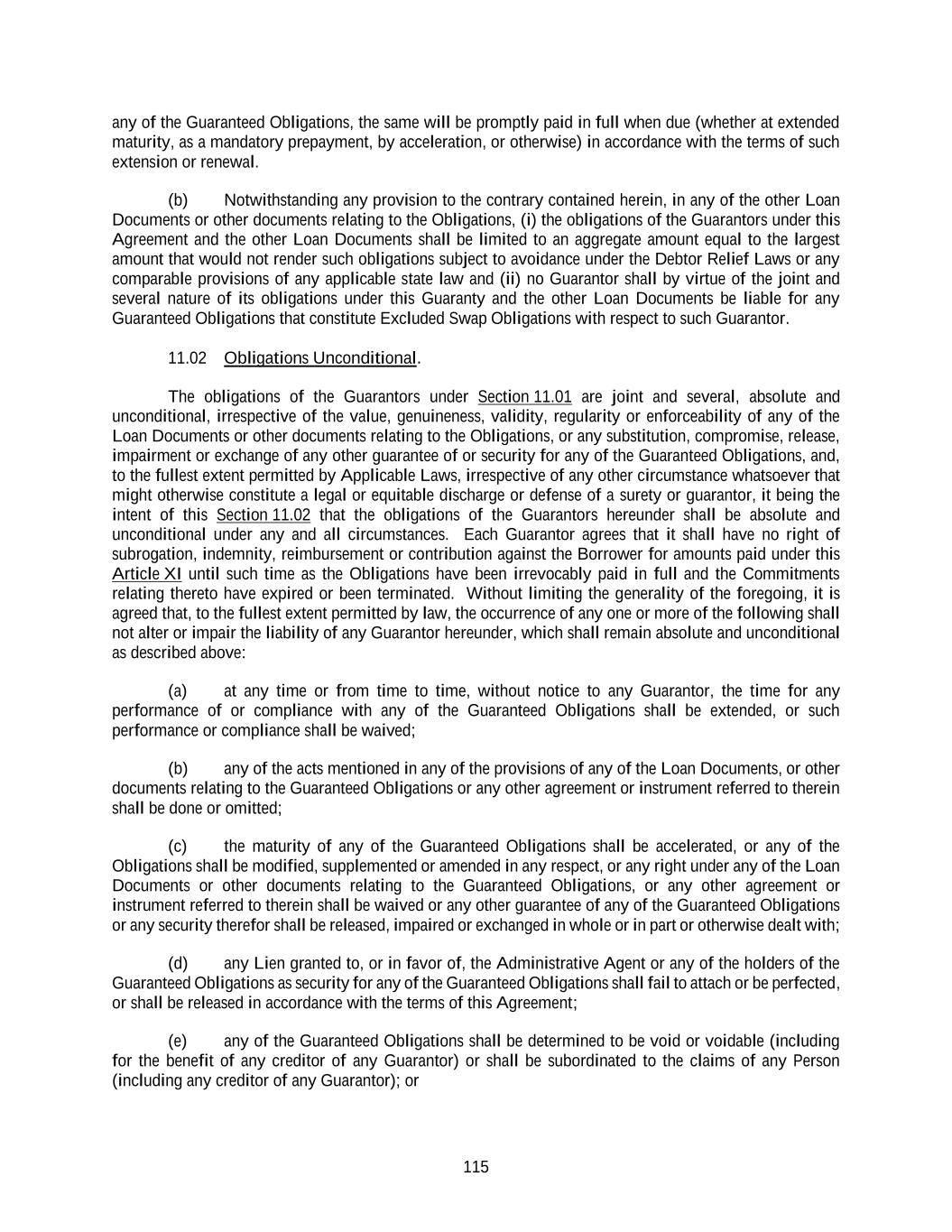 115 any of the Guaranteed Obligations, the same will be promptly paid in full when due (whether at extended maturity, as a mandatory prepayment, by acceleration, or otherwise) in accordance with the terms of such extension or renewal. (b) Notwithstanding any provision to the contrary contained herein, in any of the other Loan Documents or other documents relating to the Obligations, (i) the obligations of the Guarantors under this Agreement and the other Loan Documents shall be limited to an aggregate amount equal to the largest amount that would not render such obligations subject to avoidance under the Debtor Relief Laws or any comparable provisions of any applicable state law and (ii) no Guarantor shall by virtue of the joint and several nature of its obligations under this Guaranty and the other Loan Documents be liable for any Guaranteed Obligations that constitute Excluded Swap Obligations with respect to such Guarantor. 11.02 Obligations Unconditional. The obligations of the Guarantors under Section 11.01 are joint and several, absolute and unconditional, irrespective of the value, genuineness, validity, regularity or enforceability of any of the Loan Documents or other documents relating to the Obligations, or any substitution, compromise, release, impairment or exchange of any other guarantee of or security for any of the Guaranteed Obligations, and, to the fullest extent permitted by Applicable Laws, irrespective of any other circumstance whatsoever that might otherwise constitute a legal or equitable discharge or defense of a surety or guarantor, it being the intent of this Section 11.02 that the obligations of the Guarantors hereunder shall be absolute and unconditional under any and all circumstances. Each Guarantor agrees that it shall have no right of subrogation, indemnity, reimbursement or contribution against the Borrower for amounts paid under this Article XI until such time as the Obligations have been irrevocably paid in full and the Commitments relating thereto have expired or been terminated. Without limiting the generality of the foregoing, it is agreed that, to the fullest extent permitted by law, the occurrence of any one or more of the following shall not alter or impair the liability of any Guarantor hereunder, which shall remain absolute and unconditional as described above: (a) at any time or from time to time, without notice to any Guarantor, the time for any performance of or compliance with any of the Guaranteed Obligations shall be extended, or such performance or compliance shall be waived; (b) any of the acts mentioned in any of the provisions of any of the Loan Documents, or other documents relating to the Guaranteed Obligations or any other agreement or instrument referred to therein shall be done or omitted; (c) the maturity of any of the Guaranteed Obligations shall be accelerated, or any of the Obligations shall be modified, supplemented or amended in any respect, or any right under any of the Loan Documents or other documents relating to the Guaranteed Obligations, or any other agreement or instrument referred to therein shall be waived or any other guarantee of any of the Guaranteed Obligations or any security therefor shall be released, impaired or exchanged in whole or in part or otherwise dealt with; (d) any Lien granted to, or in favor of, the Administrative Agent or any of the holders of the Guaranteed Obligations as security for any of the Guaranteed Obligations shall fail to attach or be perfected, or shall be released in accordance with the terms of this Agreement; (e) any of the Guaranteed Obligations shall be determined to be void or voidable (including for the benefit of any creditor of any Guarantor) or shall be subordinated to the claims of any Person (including any creditor of any Guarantor); or
