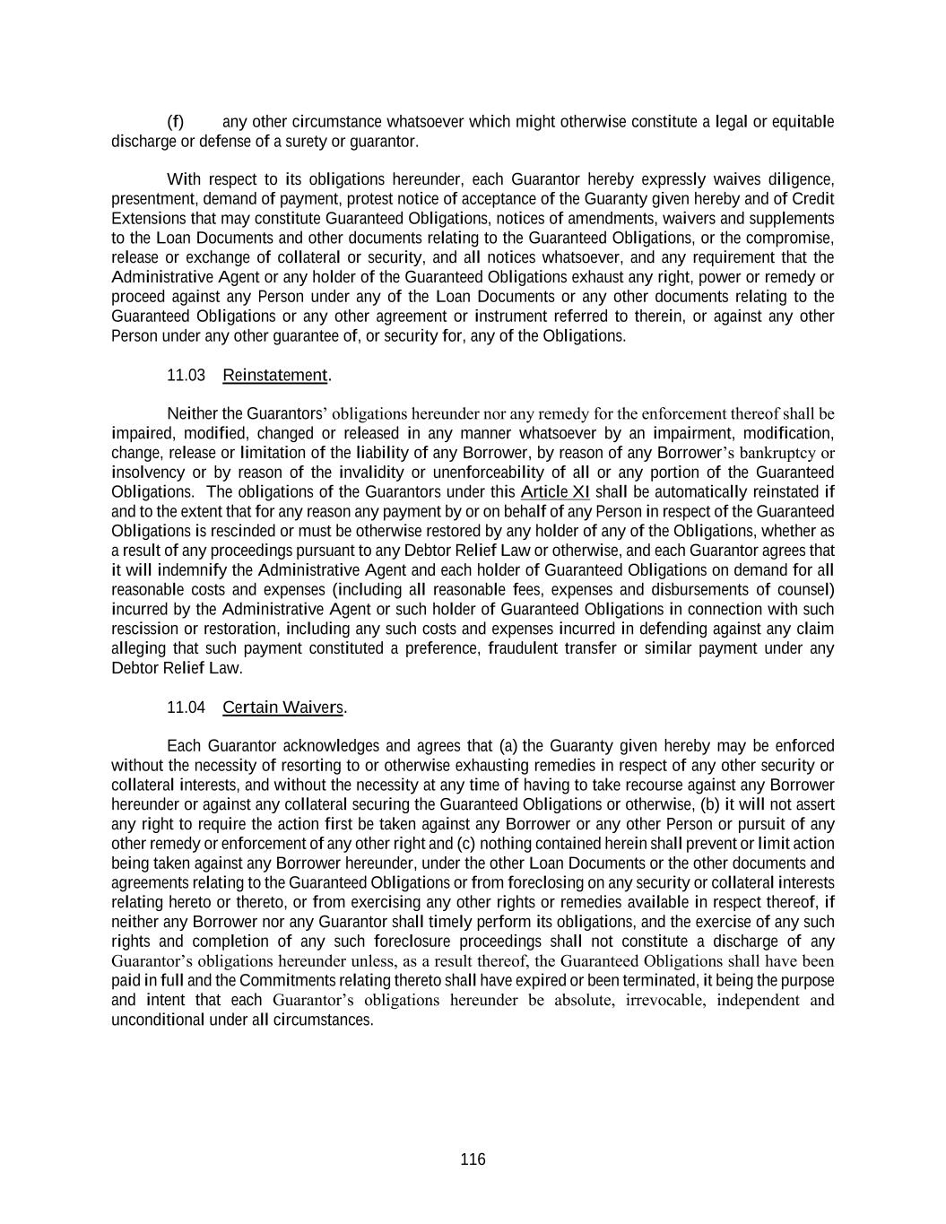 116 (f) any other circumstance whatsoever which might otherwise constitute a legal or equitable discharge or defense of a surety or guarantor. With respect to its obligations hereunder, each Guarantor hereby expressly waives diligence, presentment, demand of payment, protest notice of acceptance of the Guaranty given hereby and of Credit Extensions that may constitute Guaranteed Obligations, notices of amendments, waivers and supplements to the Loan Documents and other documents relating to the Guaranteed Obligations, or the compromise, release or exchange of collateral or security, and all notices whatsoever, and any requirement that the Administrative Agent or any holder of the Guaranteed Obligations exhaust any right, power or remedy or proceed against any Person under any of the Loan Documents or any other documents relating to the Guaranteed Obligations or any other agreement or instrument referred to therein, or against any other Person under any other guarantee of, or security for, any of the Obligations. 11.03 Reinstatement. Neither the Guarantors’ obligations hereunder nor any remedy for the enforcement thereof shall be impaired, modified, changed or released in any manner whatsoever by an impairment, modification, change, release or limitation of the liability of any Borrower, by reason of any Borrower’s bankruptcy or insolvency or by reason of the invalidity or unenforceability of all or any portion of the Guaranteed Obligations. The obligations of the Guarantors under this Article XI shall be automatically reinstated if and to the extent that for any reason any payment by or on behalf of any Person in respect of the Guaranteed Obligations is rescinded or must be otherwise restored by any holder of any of the Obligations, whether as a result of any proceedings pursuant to any Debtor Relief Law or otherwise, and each Guarantor agrees that it will indemnify the Administrative Agent and each holder of Guaranteed Obligations on demand for all reasonable costs and expenses (including all reasonable fees, expenses and disbursements of counsel) incurred by the Administrative Agent or such holder of Guaranteed Obligations in connection with such rescission or restoration, including any such costs and expenses incurred in defending against any claim alleging that such payment constituted a preference, fraudulent transfer or similar payment under any Debtor Relief Law. 11.04 Certain Waivers. Each Guarantor acknowledges and agrees that (a) the Guaranty given hereby may be enforced without the necessity of resorting to or otherwise exhausting remedies in respect of any other security or collateral interests, and without the necessity at any time of having to take recourse against any Borrower hereunder or against any collateral securing the Guaranteed Obligations or otherwise, (b) it will not assert any right to require the action first be taken against any Borrower or any other Person or pursuit of any other remedy or enforcement of any other right and (c) nothing contained herein shall prevent or limit action being taken against any Borrower hereunder, under the other Loan Documents or the other documents and agreements relating to the Guaranteed Obligations or from foreclosing on any security or collateral interests relating hereto or thereto, or from exercising any other rights or remedies available in respect thereof, if neither any Borrower nor any Guarantor shall timely perform its obligations, and the exercise of any such rights and completion of any such foreclosure proceedings shall not constitute a discharge of any Guarantor’s obligations hereunder unless, as a result thereof, the Guaranteed Obligations shall have been paid in full and the Commitments relating thereto shall have expired or been terminated, it being the purpose and intent that each Guarantor’s obligations hereunder be absolute, irrevocable, independent and unconditional under all circumstances.