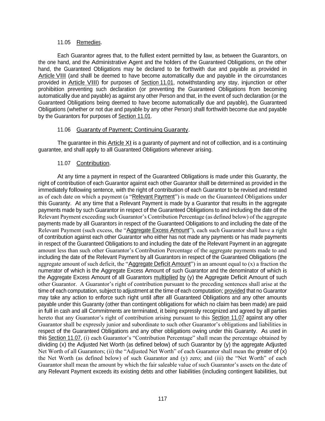 117 11.05 Remedies. Each Guarantor agrees that, to the fullest extent permitted by law, as between the Guarantors, on the one hand, and the Administrative Agent and the holders of the Guaranteed Obligations, on the other hand, the Guaranteed Obligations may be declared to be forthwith due and payable as provided in Article VIII (and shall be deemed to have become automatically due and payable in the circumstances provided in Article VIII) for purposes of Section 11.01, notwithstanding any stay, injunction or other prohibition preventing such declaration (or preventing the Guaranteed Obligations from becoming automatically due and payable) as against any other Person and that, in the event of such declaration (or the Guaranteed Obligations being deemed to have become automatically due and payable), the Guaranteed Obligations (whether or not due and payable by any other Person) shall forthwith become due and payable by the Guarantors for purposes of Section 11.01. 11.06 Guaranty of Payment; Continuing Guaranty. The guarantee in this Article XI is a guaranty of payment and not of collection, and is a continuing guarantee, and shall apply to all Guaranteed Obligations whenever arising. 11.07 Contribution. At any time a payment in respect of the Guaranteed Obligations is made under this Guaranty, the right of contribution of each Guarantor against each other Guarantor shall be determined as provided in the immediately following sentence, with the right of contribution of each Guarantor to be revised and restated as of each date on which a payment (a “Relevant Payment”) is made on the Guaranteed Obligations under this Guaranty. At any time that a Relevant Payment is made by a Guarantor that results in the aggregate payments made by such Guarantor in respect of the Guaranteed Obligations to and including the date of the Relevant Payment exceeding such Guarantor’s Contribution Percentage (as defined below) of the aggregate payments made by all Guarantors in respect of the Guaranteed Obligations to and including the date of the Relevant Payment (such excess, the “Aggregate Excess Amount”), each such Guarantor shall have a right of contribution against each other Guarantor who either has not made any payments or has made payments in respect of the Guaranteed Obligations to and including the date of the Relevant Payment in an aggregate amount less than such other Guarantor’s Contribution Percentage of the aggregate payments made to and including the date of the Relevant Payment by all Guarantors in respect of the Guaranteed Obligations (the aggregate amount of such deficit, the “Aggregate Deficit Amount”) in an amount equal to (x) a fraction the numerator of which is the Aggregate Excess Amount of such Guarantor and the denominator of which is the Aggregate Excess Amount of all Guarantors multiplied by (y) the Aggregate Deficit Amount of such other Guarantor. A Guarantor’s right of contribution pursuant to the preceding sentences shall arise at the time of each computation, subject to adjustment at the time of each computation; provided that no Guarantor may take any action to enforce such right until after all Guaranteed Obligations and any other amounts payable under this Guaranty (other than contingent obligations for which no claim has been made) are paid in full in cash and all Commitments are terminated, it being expressly recognized and agreed by all parties hereto that any Guarantor’s right of contribution arising pursuant to this Section 11.07 against any other Guarantor shall be expressly junior and subordinate to such other Guarantor’s obligations and liabilities in respect of the Guaranteed Obligations and any other obligations owing under this Guaranty. As used in this Section 11.07, (i) each Guarantor’s “Contribution Percentage” shall mean the percentage obtained by dividing (x) the Adjusted Net Worth (as defined below) of such Guarantor by (y) the aggregate Adjusted Net Worth of all Guarantors; (ii) the “Adjusted Net Worth” of each Guarantor shall mean the greater of (x) the Net Worth (as defined below) of such Guarantor and (y) zero; and (iii) the “Net Worth” of each Guarantor shall mean the amount by which the fair saleable value of such Guarantor’s assets on the date of any Relevant Payment exceeds its existing debts and other liabilities (including contingent liabilities, but