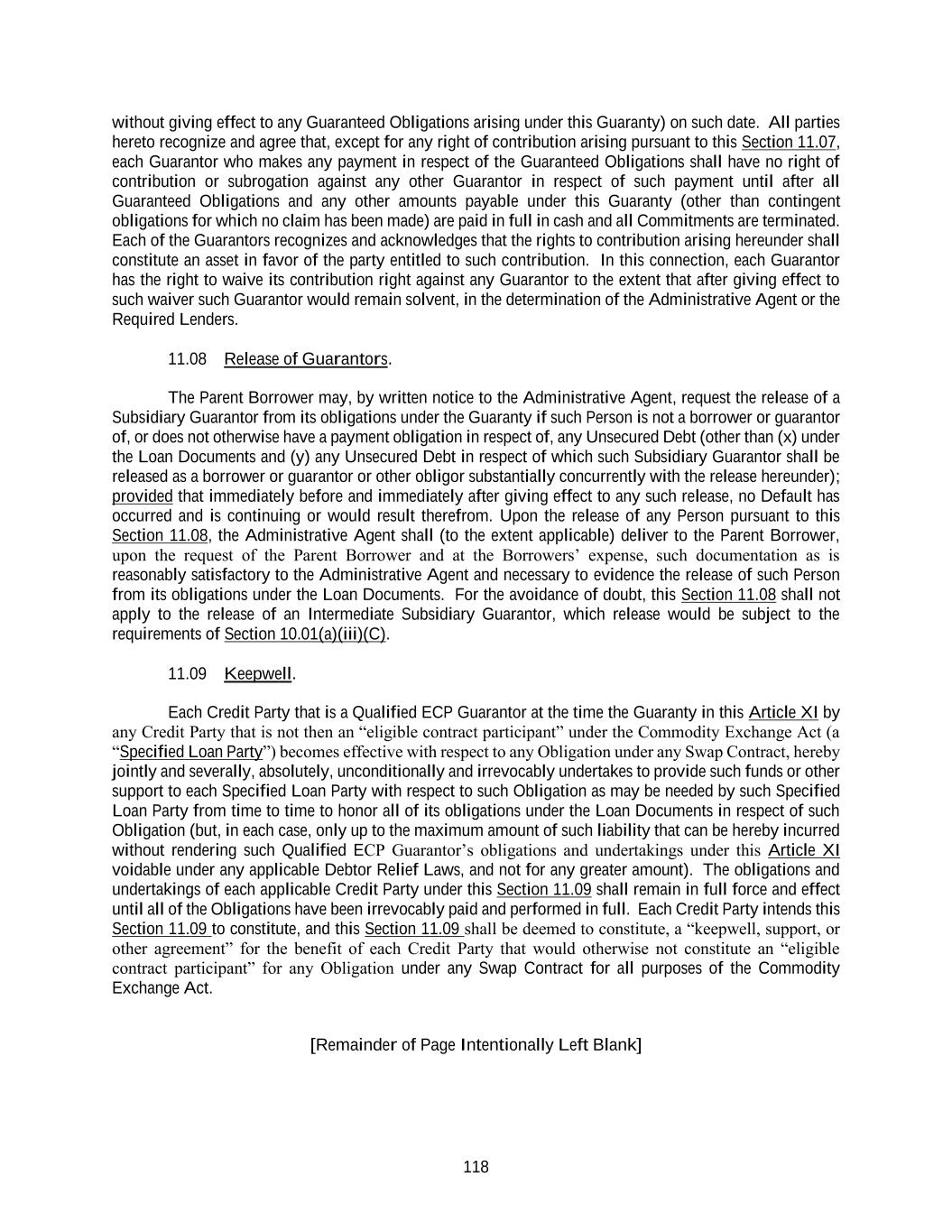 118 without giving effect to any Guaranteed Obligations arising under this Guaranty) on such date. All parties hereto recognize and agree that, except for any right of contribution arising pursuant to this Section 11.07, each Guarantor who makes any payment in respect of the Guaranteed Obligations shall have no right of contribution or subrogation against any other Guarantor in respect of such payment until after all Guaranteed Obligations and any other amounts payable under this Guaranty (other than contingent obligations for which no claim has been made) are paid in full in cash and all Commitments are terminated. Each of the Guarantors recognizes and acknowledges that the rights to contribution arising hereunder shall constitute an asset in favor of the party entitled to such contribution. In this connection, each Guarantor has the right to waive its contribution right against any Guarantor to the extent that after giving effect to such waiver such Guarantor would remain solvent, in the determination of the Administrative Agent or the Required Lenders. 11.08 Release of Guarantors. The Parent Borrower may, by written notice to the Administrative Agent, request the release of a Subsidiary Guarantor from its obligations under the Guaranty if such Person is not a borrower or guarantor of, or does not otherwise have a payment obligation in respect of, any Unsecured Debt (other than (x) under the Loan Documents and (y) any Unsecured Debt in respect of which such Subsidiary Guarantor shall be released as a borrower or guarantor or other obligor substantially concurrently with the release hereunder); provided that immediately before and immediately after giving effect to any such release, no Default has occurred and is continuing or would result therefrom. Upon the release of any Person pursuant to this Section 11.08, the Administrative Agent shall (to the extent applicable) deliver to the Parent Borrower, upon the request of the Parent Borrower and at the Borrowers’ expense, such documentation as is reasonably satisfactory to the Administrative Agent and necessary to evidence the release of such Person from its obligations under the Loan Documents. For the avoidance of doubt, this Section 11.08 shall not apply to the release of an Intermediate Subsidiary Guarantor, which release would be subject to the requirements of Section 10.01(a)(iii)(C). 11.09 Keepwell. Each Credit Party that is a Qualified ECP Guarantor at the time the Guaranty in this Article XI by any Credit Party that is not then an “eligible contract participant” under the Commodity Exchange Act (a “Specified Loan Party”) becomes effective with respect to any Obligation under any Swap Contract, hereby jointly and severally, absolutely, unconditionally and irrevocably undertakes to provide such funds or other support to each Specified Loan Party with respect to such Obligation as may be needed by such Specified Loan Party from time to time to honor all of its obligations under the Loan Documents in respect of such Obligation (but, in each case, only up to the maximum amount of such liability that can be hereby incurred without rendering such Qualified ECP Guarantor’s obligations and undertakings under this Article XI voidable under any applicable Debtor Relief Laws, and not for any greater amount). The obligations and undertakings of each applicable Credit Party under this Section 11.09 shall remain in full force and effect until all of the Obligations have been irrevocably paid and performed in full. Each Credit Party intends this Section 11.09 to constitute, and this Section 11.09 shall be deemed to constitute, a “keepwell, support, or other agreement” for the benefit of each Credit Party that would otherwise not constitute an “eligible contract participant” for any Obligation under any Swap Contract for all purposes of the Commodity Exchange Act. [Remainder of Page Intentionally Left Blank]