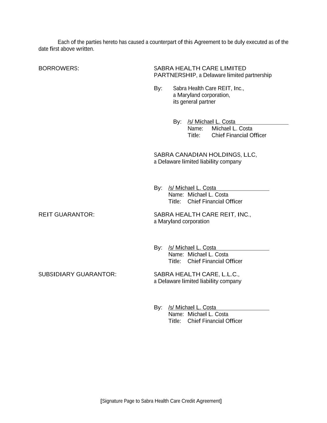 [Signature Page to Sabra Health Care Credit Agreement] Each of the parties hereto has caused a counterpart of this Agreement to be duly executed as of the date first above written. BORROWERS: SABRA HEALTH CARE LIMITED PARTNERSHIP, a Delaware limited partnership By: Sabra Health Care REIT, Inc., a Maryland corporation, its general partner By: /s/ Michael L. Costa Name: Michael L. Costa Title: Chief Financial Officer SABRA CANADIAN HOLDINGS, LLC, a Delaware limited liability company By: /s/ Michael L. Costa Name: Michael L. Costa Title: Chief Financial Officer REIT GUARANTOR: SABRA HEALTH CARE REIT, INC., a Maryland corporation By: /s/ Michael L. Costa Name: Michael L. Costa Title: Chief Financial Officer SUBSIDIARY GUARANTOR: SABRA HEALTH CARE, L.L.C., a Delaware limited liability company By: /s/ Michael L. Costa Name: Michael L. Costa Title: Chief Financial Officer