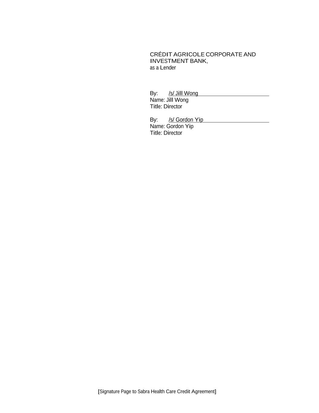 [Signature Page to Sabra Health Care Credit Agreement] CRÉDIT AGRICOLE CORPORATE AND INVESTMENT BANK, as a Lender By: /s/ Jill Wong Name: Jill Wong Title: Director By: /s/ Gordon Yip Name: Gordon Yip Title: Director