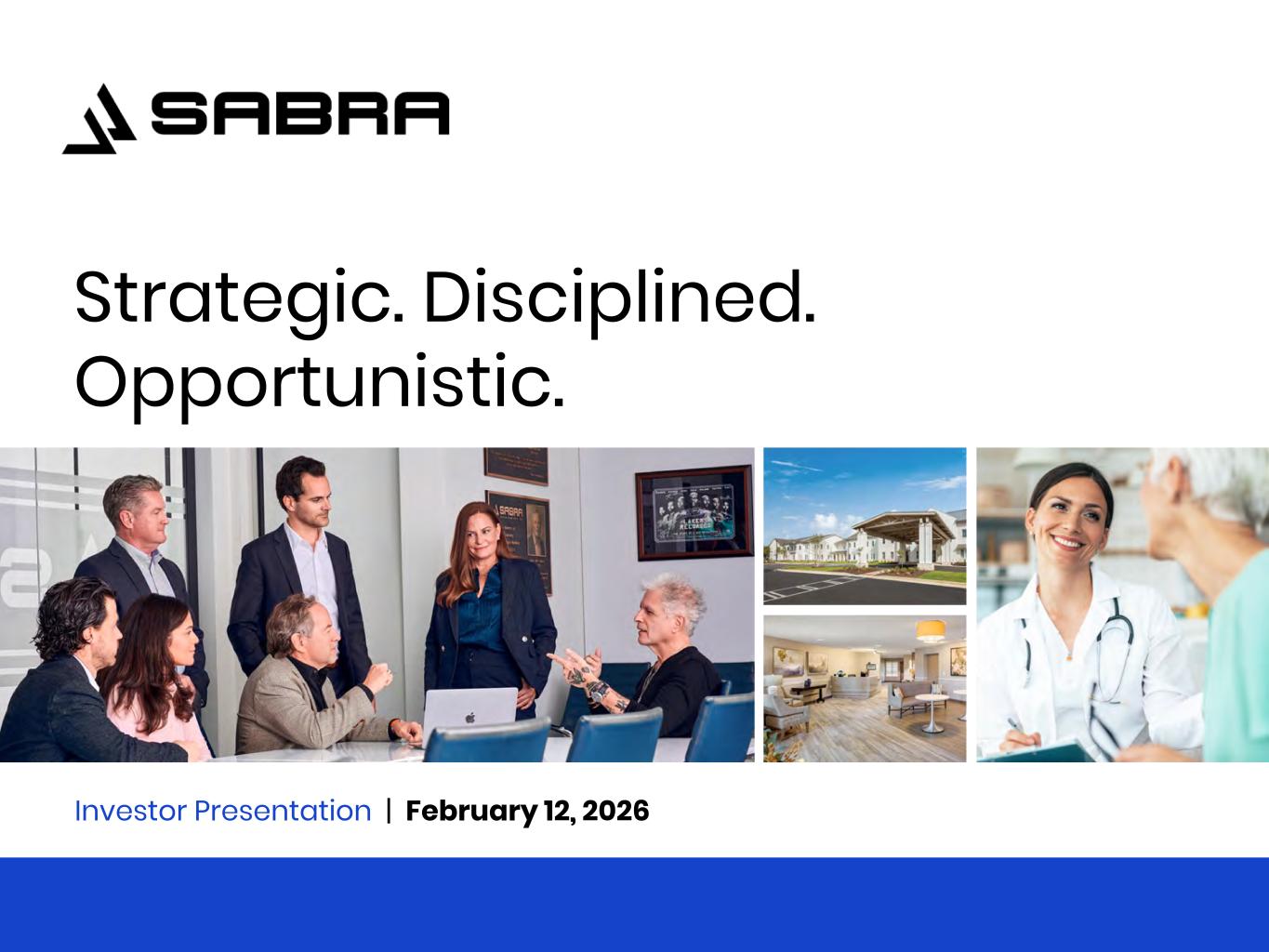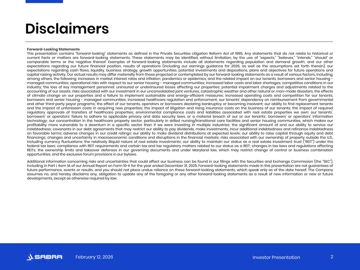 February 12, 2026 Investor Presentation Tenant and Borrower Information This presentation includes information (e.g., EBITDARM Coverage and Occupancy Percentage) regarding certain of our tenants that lease properties from us and our borrowers, most of which are not subject to SEC reporting requirements. The information related to our tenants and borrowers that is provided in this presentation has been provided by, or derived from information provided by, such tenants and borrowers. We have not independently verified this information. We have no reason to believe that such information is inaccurate in any material respect. We are providing this data for informational purposes only. Non-GAAP Financial Measures This presentation contains certain non-GAAP financial measures related to Sabra Health Care REIT, Inc., including Annualized Cash NOI, Net Debt to Adjusted EBITDA and funds from operations (FFO). These measures may be different than non-GAAP financial measures used by other companies, and the presentation of these measures is not intended to be considered in isolation or as a substitute for financial information prepared and presented in accordance with U.S. generally accepted accounting principles (GAAP). An explanation of these non-GAAP financial measures is included under “Definitions” in the Appendix, and reconciliations of these non-GAAP financial measures to the GAAP financial measures we consider most comparable are included on the Investors section of our website at https://ir.sabrahealth.com/investors/financials/quarterly-results. Disclaimers 3