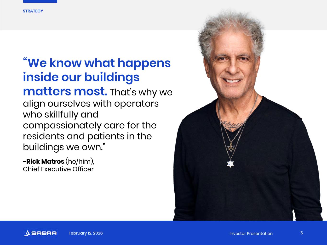 LOREM IPSUM Heading February 12, 2026 Investor Presentation Our passion for quality care and deep industry experience uniquely position Sabra to succeed in the dynamic healthcare real estate market. We have the size, know-how and resilient balance sheet necessary to deliver long-term value to shareholders. Uniquely Positioned to Thrive 4