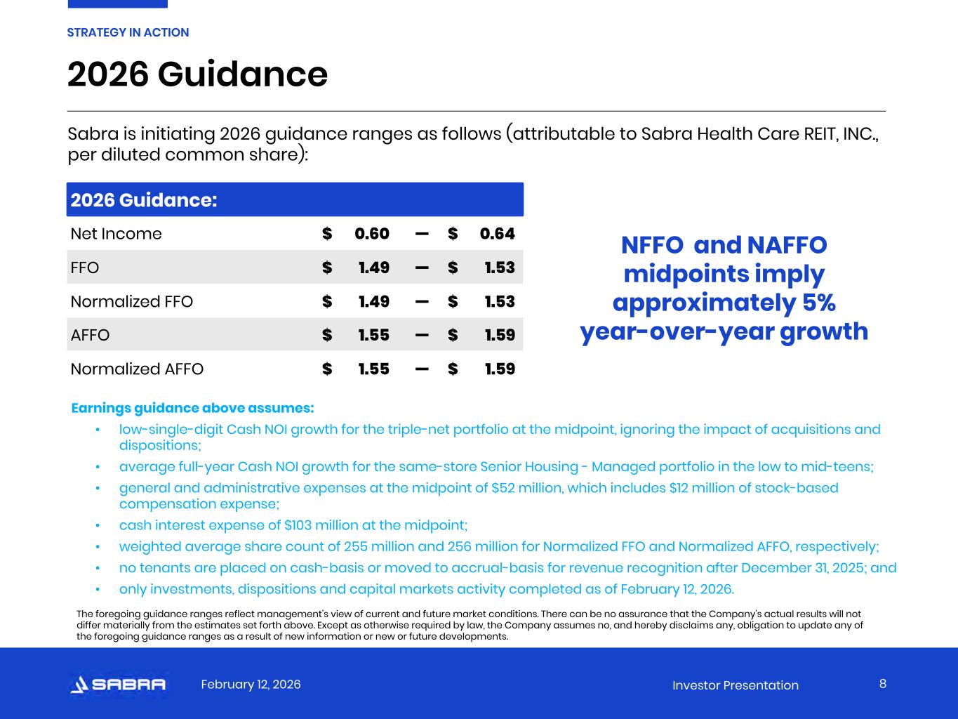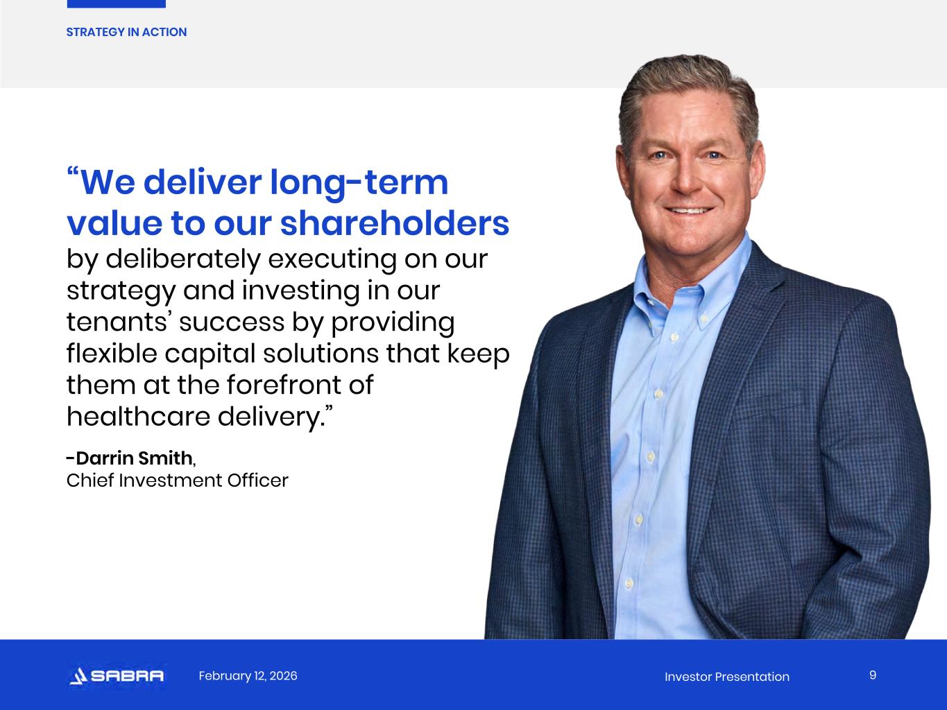 February 12, 2026 Investor Presentation 2026 Guidance 8 STRATEGY IN ACTION 2026 Guidance: Net Income $ 0.60 — $ 0.64 FFO $ 1.49 — $ 1.53 Normalized FFO $ 1.49 — $ 1.53 AFFO $ 1.55 — $ 1.59 Normalized AFFO $ 1.55 — $ 1.59 Earnings guidance above assumes: • low-single-digit Cash NOI growth for the triple-net portfolio at the midpoint, ignoring the impact of acquisitions and dispositions; • average full-year Cash NOI growth for the same-store Senior Housing - Managed portfolio in the low to mid-teens; • general and administrative expenses at the midpoint of $52 million, which includes $12 million of stock-based compensation expense; • cash interest expense of $103 million at the midpoint; • weighted average share count of 255 million and 256 million for Normalized FFO and Normalized AFFO, respectively; • no tenants are placed on cash-basis or moved to accrual-basis for revenue recognition after December 31, 2025; and • only investments, dispositions and capital markets activity completed as of February 12, 2026. Sabra is initiating 2026 guidance ranges as follows (attributable to Sabra Health Care REIT, INC., per diluted common share): The foregoing guidance ranges reflect management’s view of current and future market conditions. There can be no assurance that the Company’s actual results will not differ materially from the estimates set forth above. Except as otherwise required by law, the Company assumes no, and hereby disclaims any, obligation to update any of the foregoing guidance ranges as a result of new information or new or future developments. NFFO and NAFFO midpoints imply approximately 5% year-over-year growth