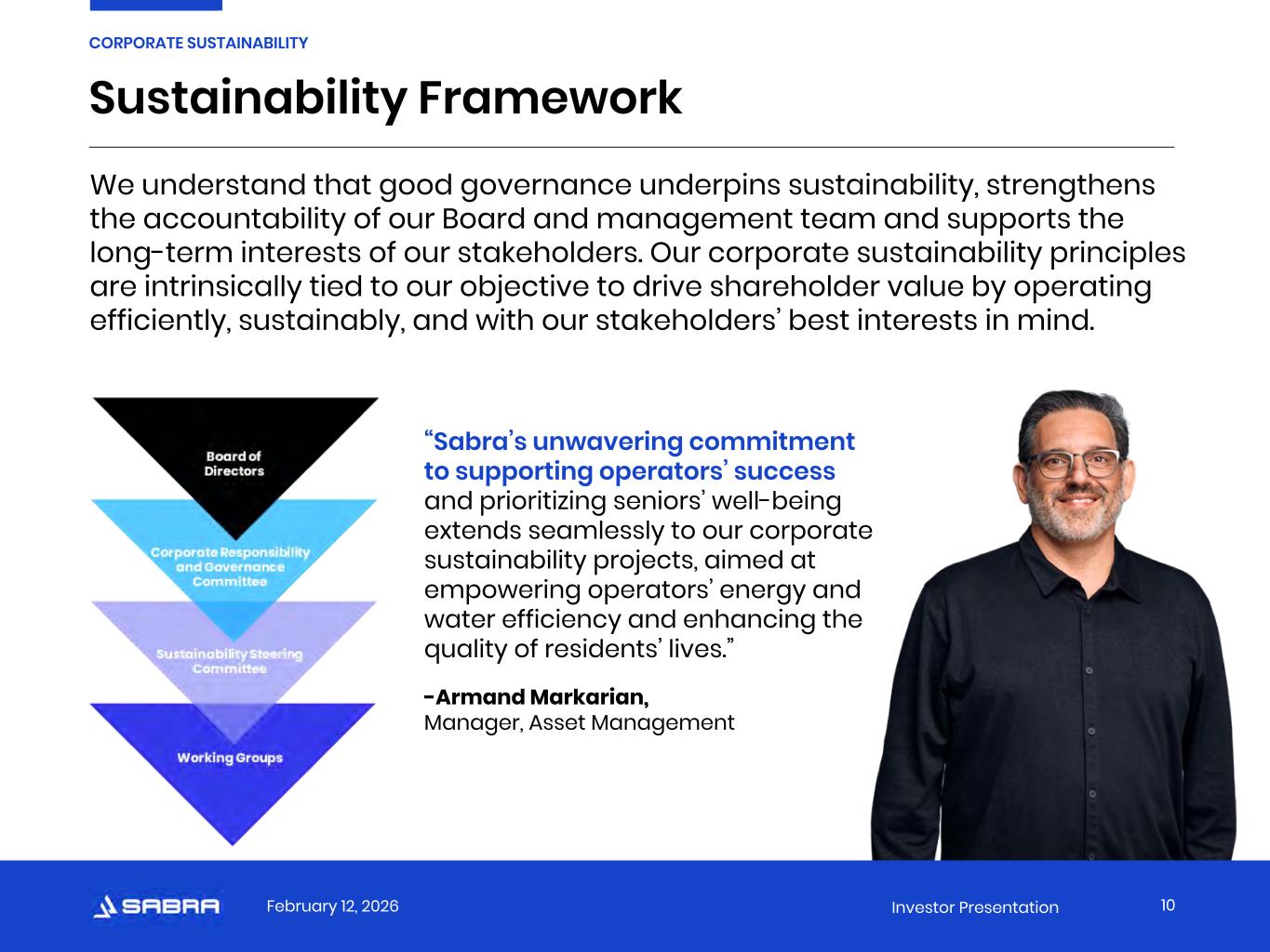 February 12, 2026 Investor Presentation Sustainability Framework “Sabra’s unwavering commitment to supporting operators’ success and prioritizing seniors’ well-being extends seamlessly to our corporate sustainability projects, aimed at empowering operators’ energy and water efficiency and enhancing the quality of residents’ lives.” -Armand Markarian, Manager, Asset Management 10 CORPORATE SUSTAINABILITY We understand that good governance underpins sustainability, strengthens the accountability of our Board and management team and supports the long-term interests of our stakeholders. Our corporate sustainability principles are intrinsically tied to our objective to drive shareholder value by operating efficiently, sustainably, and with our stakeholders’ best interests in mind.