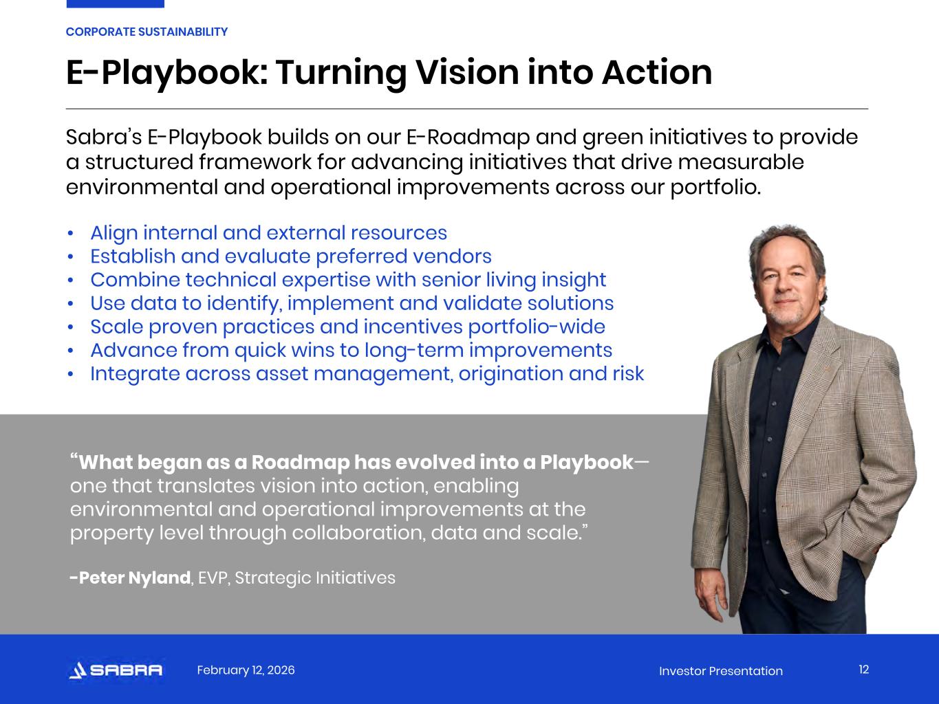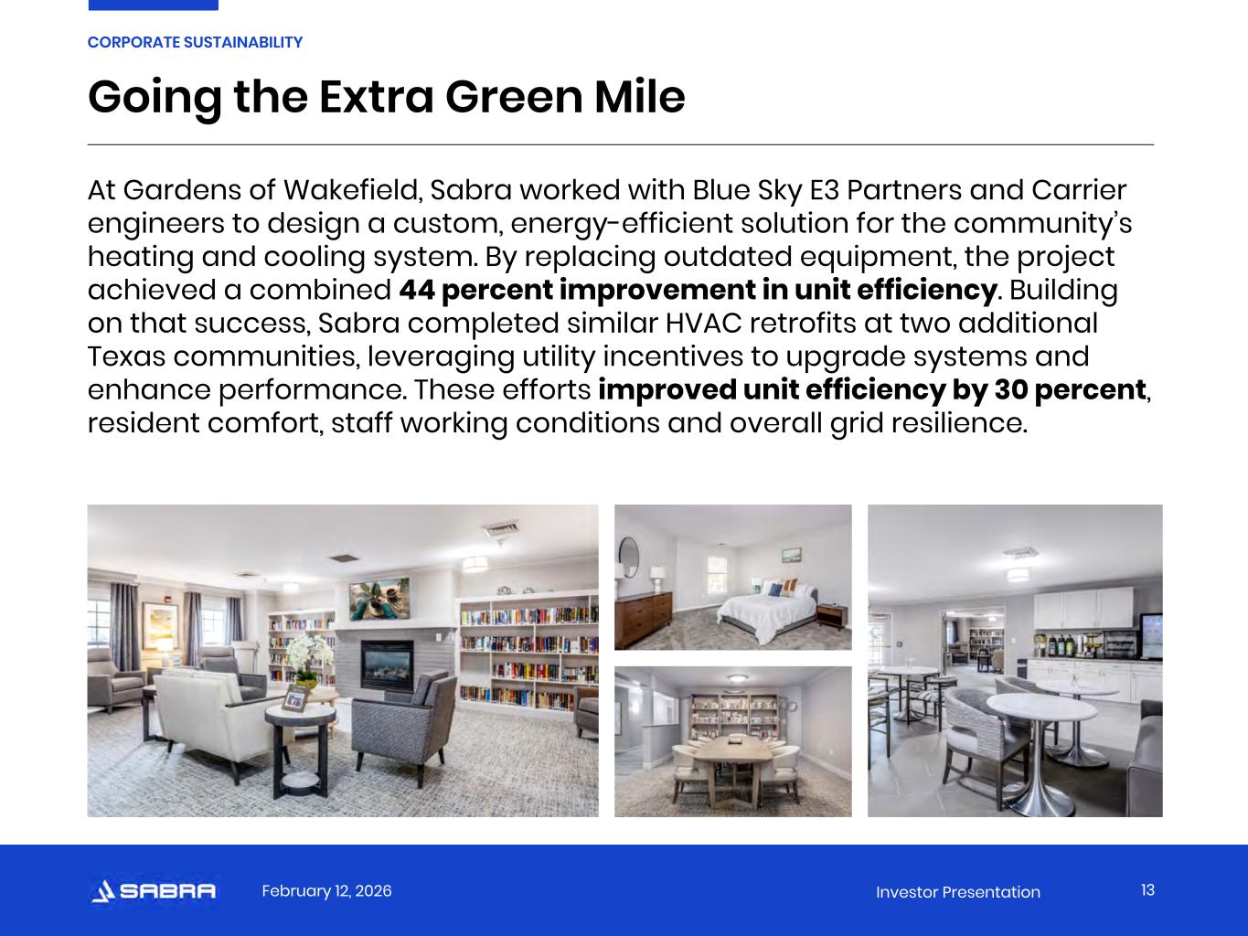 February 12, 2026 Investor Presentation E-Playbook: Turning Vision into Action 12 CORPORATE SUSTAINABILITY Sabra’s E-Playbook builds on our E-Roadmap and green initiatives to provide a structured framework for advancing initiatives that drive measurable environmental and operational improvements across our portfolio. • Align internal and external resources • Establish and evaluate preferred vendors • Combine technical expertise with senior living insight • Use data to identify, implement and validate solutions • Scale proven practices and incentives portfolio-wide • Advance from quick wins to long-term improvements • Integrate across asset management, origination and risk “What began as a Roadmap has evolved into a Playbook— one that translates vision into action, enabling environmental and operational improvements at the property level through collaboration, data and scale.” -Peter Nyland, EVP, Strategic Initiatives