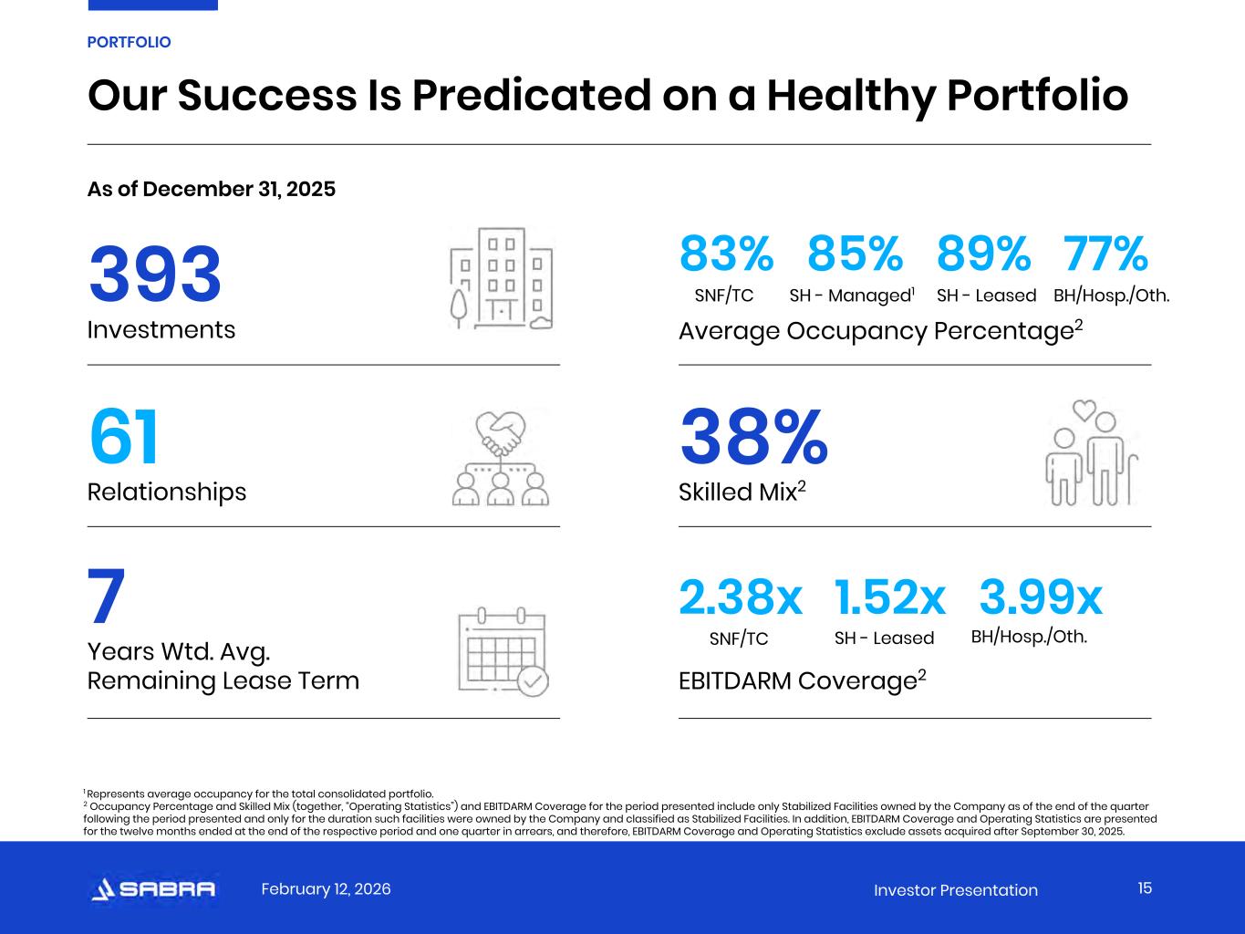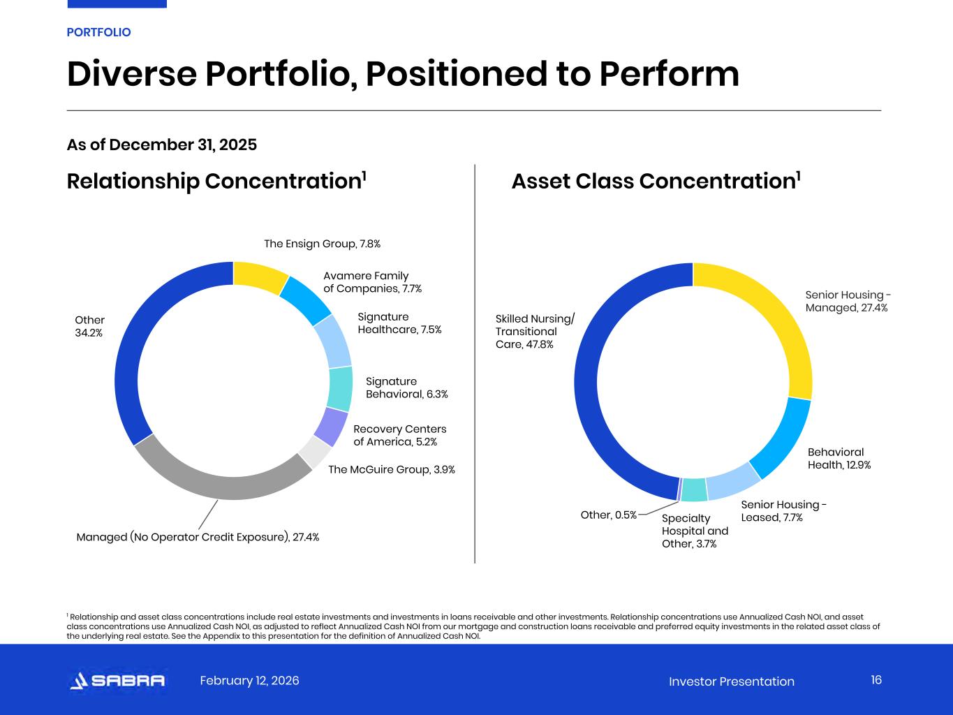 February 12, 2026 Investor Presentation Normalized FFO and Normalized AFFO.* Normalized FFO and Normalized AFFO represent FFO and AFFO, respectively, adjusted for certain income and expense items that the Company does not believe are indicative of its ongoing operating results. The Company considers Normalized FFO and Normalized AFFO to be useful measures to evaluate the Company’s operating results excluding these income and expense items to help investors compare the operating performance of the Company between periods or as compared to other companies. Normalized FFO and Normalized AFFO do not represent cash flows from operations or net income as defined by GAAP and should not be considered an alternative to those measures in evaluating the Company’s liquidity or operating performance. Normalized FFO and Normalized AFFO also do not consider the costs associated with capital expenditures related to the Company’s real estate assets nor do they purport to be indicative of cash available to fund the Company’s future cash requirements. Further, the Company’s computation of Normalized FFO and Normalized AFFO may not be comparable to Normalized FFO and Normalized AFFO reported by other real estate investment trusts that do not define FFO in accordance with the current Nareit definition or that interpret the current Nareit definition or define FFO and AFFO or Normalized FFO and Normalized AFFO differently than the Company does. Occupancy Percentage. Occupancy Percentage represents the facilities’ average operating occupancy for the period indicated. The percentages are calculated by dividing the actual census from the period presented by the available beds/units for the same period. Except for Senior Housing - Managed, Occupancy includes only Stabilized Facilities and excludes facilities for which data is not available or meaningful. Senior Housing. Senior Housing communities include independent living, assisted living, continuing care retirement and memory care communities. Senior Housing - Managed. Senior Housing communities operated by third-party property managers pursuant to property management agreements. Skilled Mix. Skilled Mix is defined as the total Medicare and non-Medicaid managed care patient revenue at Skilled Nursing/Transitional Care facilities divided by the total revenues at Skilled Nursing/Transitional Care facilities for the period indicated. Skilled Mix includes only Stabilized Facilities and excludes facilities for which data is not available or meaningful. Skilled Nursing/Transitional Care. Skilled Nursing/Transitional Care facilities include skilled nursing, transitional care, multi-license designation and mental health facilities. Specialty Hospitals and Other. Includes acute care, long-term acute care and rehabilitation hospitals, facilities that provide residential services, which may include assistance with activities of daily living, and other facilities not classified as Skilled Nursing/Transitional Care, Senior Housing or Behavioral Health. Stabilized Facility. At the time of acquisition, the Company classifies each facility as either stabilized or non-stabilized. In addition, the Company may classify a facility as non-stabilized after acquisition. Circumstances that could result in a facility being classified as non-stabilized include newly completed developments, facilities undergoing major renovations or additions, facilities being repositioned or transitioned to new operators, and significant transitions within the tenants’ business model. Such facilities are typically reclassified to stabilized upon the earlier of maintaining consistent performance or 24 months after the date of classification as non-stabilized. Stabilized Facilities generally exclude (i) facilities held for sale, (ii) strategic disposition candidates, (iii) facilities being transitioned to a new operator, (iv) facilities being transitioned from being leased by the Company to being operated by the Company and (v) leased facilities acquired during the three months preceding the period presented. * Non-GAAP Financial Measures: Reconciliations, definitions and important discussions regarding the usefulness and limitations of the Non-GAAP Financial Measures used in this presentation can be found at https://ir.sabrahealth.com/investors/financials/quarterly-results. APPENDIX Definitions 32