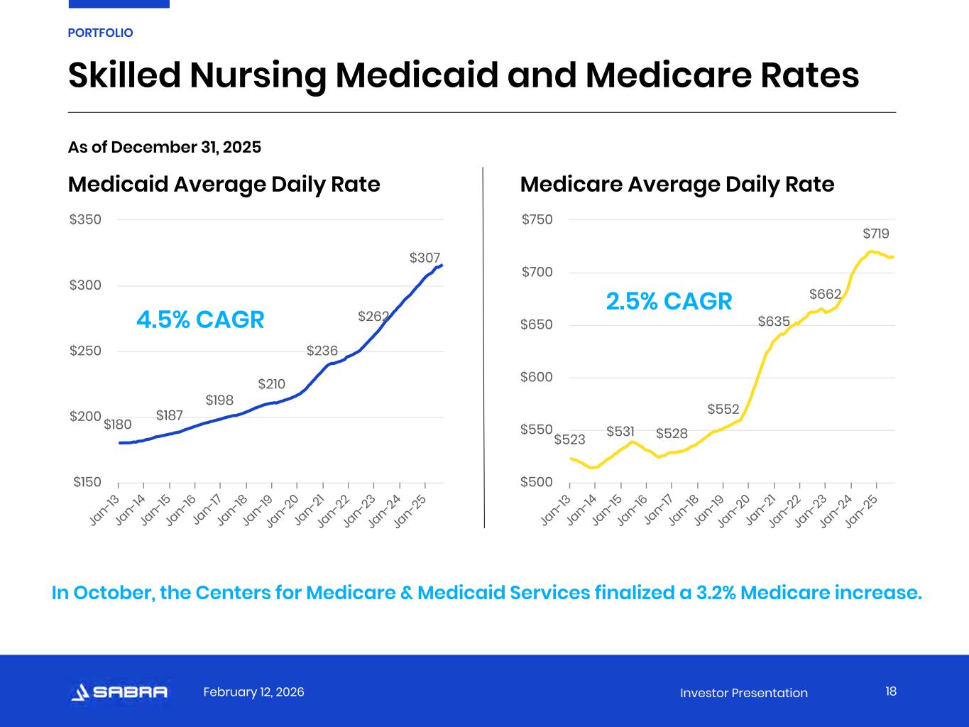 February 12, 2026 Investor Presentation Favorable Supply and Demand Trends 17 PORTFOLIO Source: Census.gov, AHCA, Care Compare Since 2000, the 85-or-older population has grown by 64%, compared to a 12% decline in skilled nursing beds over the same time frame. SNF Supply and Demand 1,780 1,757 1,725 1,712 1,706 1,703 1,697 1,695 1,693 1,675 1,628 1,594 1,571 4,399 4,641 4,946 5,296 5,600 5,880 6,055 6,304 6,468 6,590 6,467 6,677 7,047 SNF Beds (000s) Population 85 or older (000s) 2000 2001 2002 2003 2004 2005 2006 2007 2008 2009 2010 2011 2012 2013 2014 2015 2016 2017 2018 2019 2020 2021 2022 2023 2024 2025 — 1,000 2,000 3,000 4,000 5,000 6,000 7,000 8,000