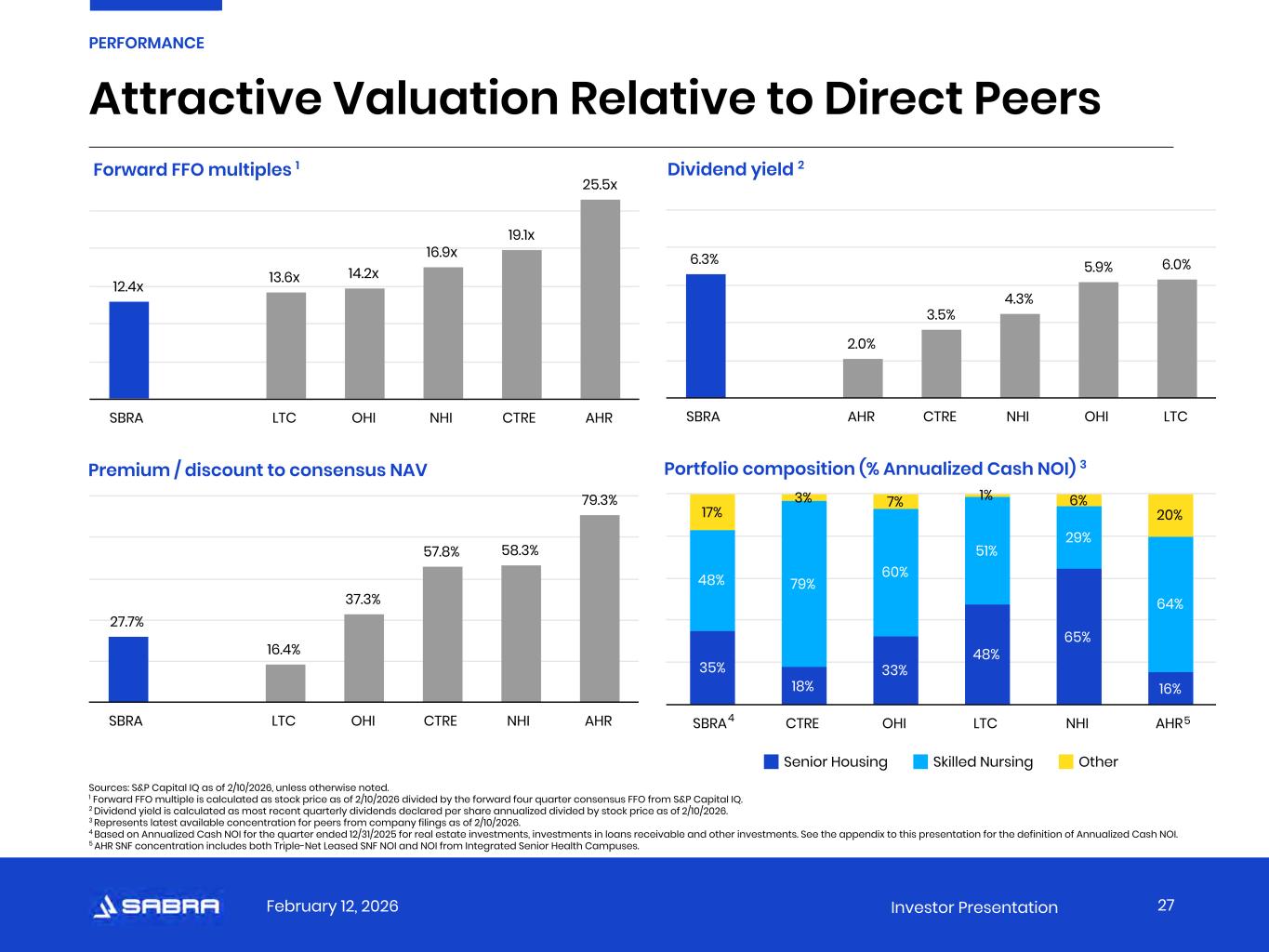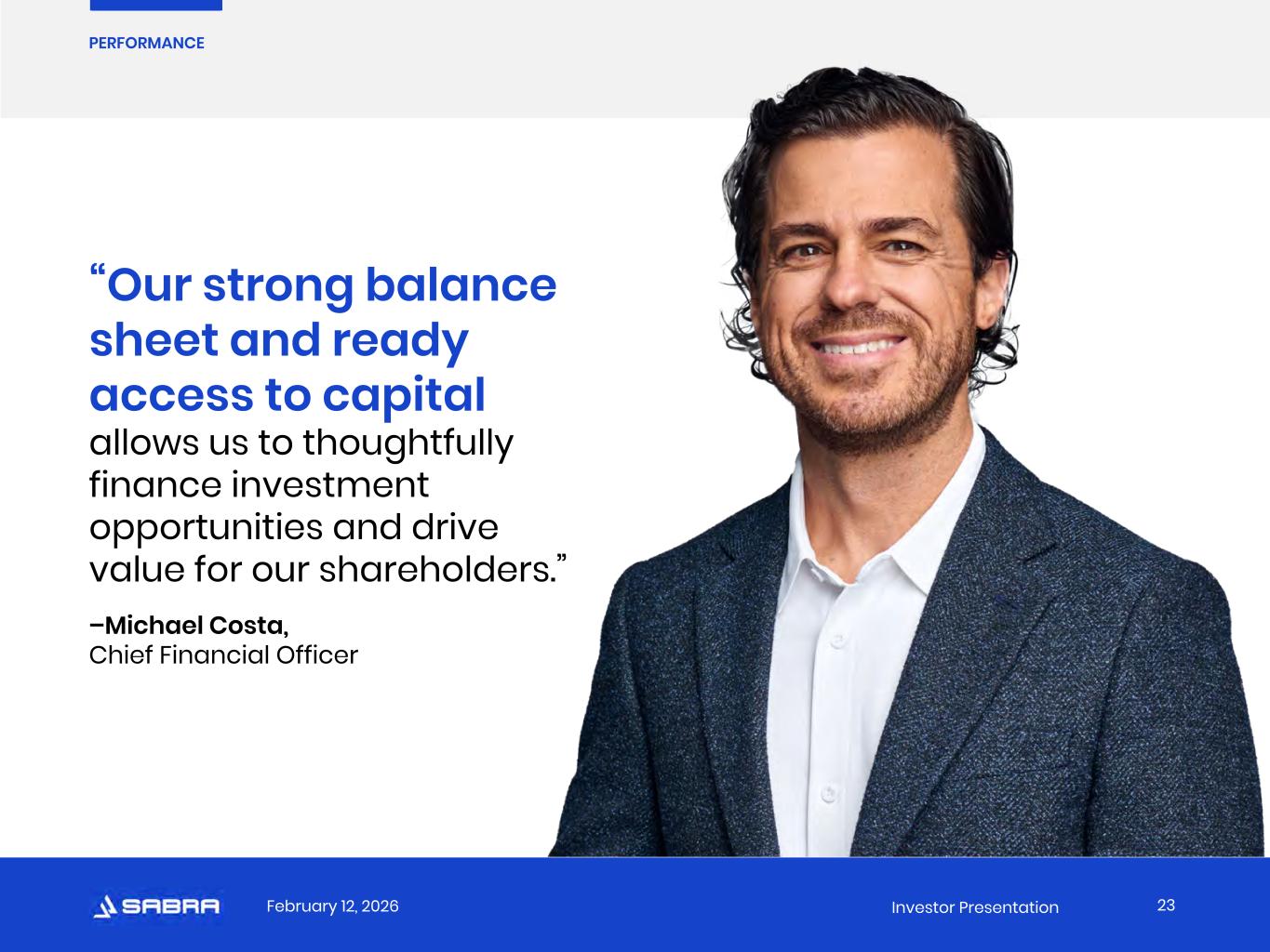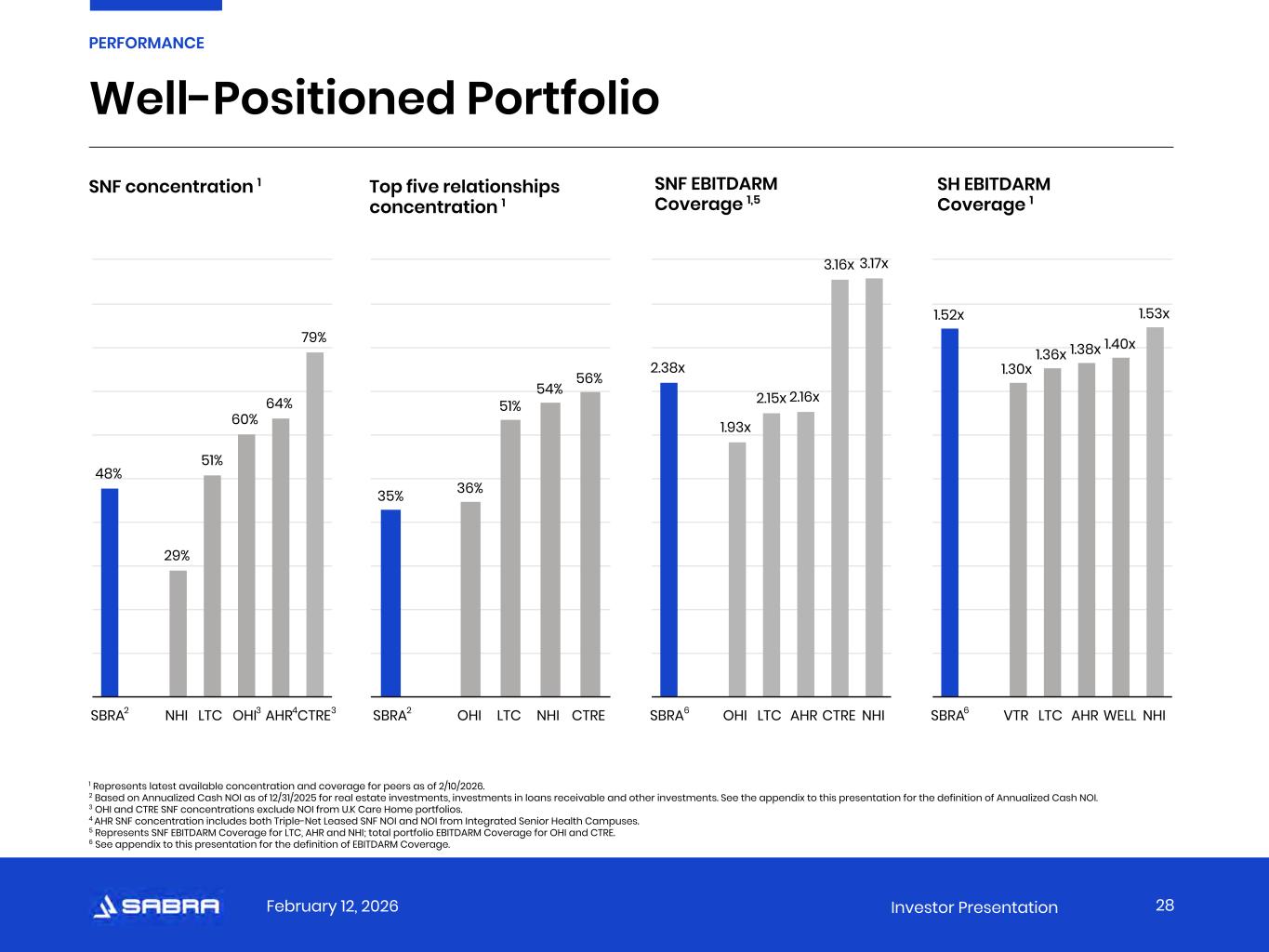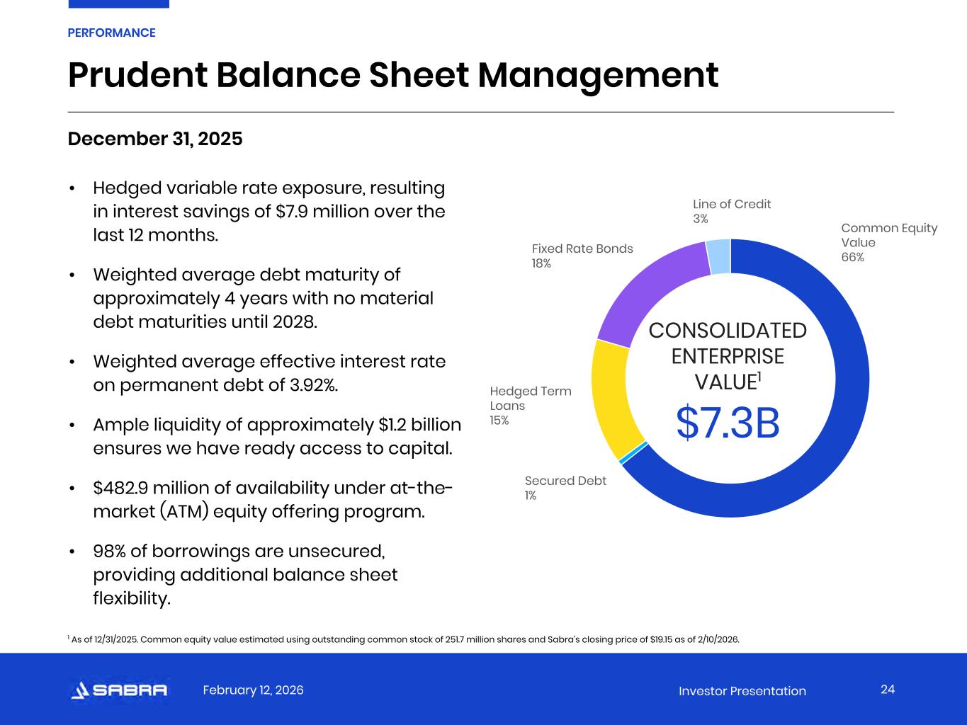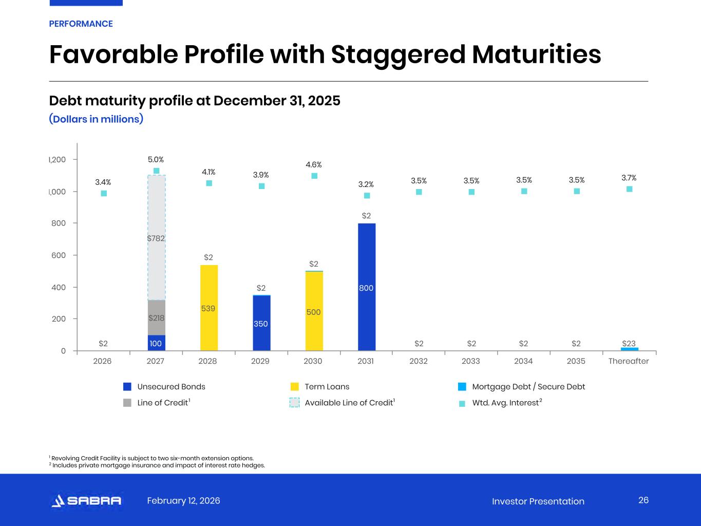 February 12, 2026 Investor Presentation   Sabra 4Q 25 1 Investment-Grade peers range 2 Net Debt to Adjusted EBITDA 5.00x 3 0.40x - 5.28x Interest Coverage Ratio 4.72x 4.30x - 9.22x Debt as a % of Asset Value 37% 18% - 39% Secured Debt as a % of Asset Value 1% 0% - 7% Investment-Grade Credit Metrics 1 Key credit statistics (except Net Debt to Adjusted EBITDA) are calculated in accordance with the credit agreement relating to the revolving credit facility and the indentures relating to our senior unsecured notes. In addition, key credit statistics give effect to dispositions and acquisitions completed after the period presented as though such dispositions and acquisitions occurred at the beginning of the period. 2 Investment-Grade Peers consists of WELL, VTR, OHI, NHI and CTRE. The metrics used to calculate Investment-Grade peers range are sourced from the most recent public filings with the SEC and may not be calculated in a manner identical to Sabra’s metrics. 3 Based on the annualized trailing three-month period ended as of the date indicated. 25 PERFORMANCE We continue to focus on strengthening our balance sheet and portfolio.