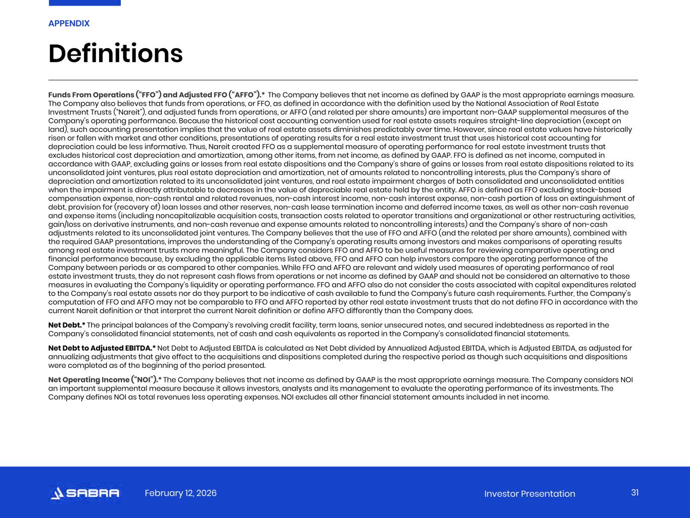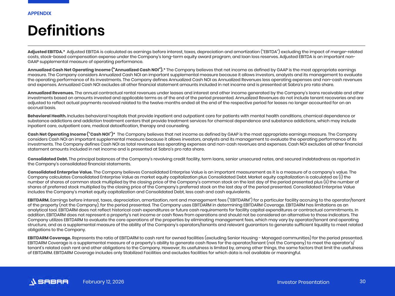 February 12, 2026 Investor Presentation Adjusted EBITDA.* Adjusted EBITDA is calculated as earnings before interest, taxes, depreciation and amortization (“EBITDA”) excluding the impact of merger-related costs, stock-based compensation expense under the Company’s long-term equity award program, and loan loss reserves. Adjusted EBITDA is an important non- GAAP supplemental measure of operating performance. Annualized Cash Net Operating Income (“Annualized Cash NOI”).* The Company believes that net income as defined by GAAP is the most appropriate earnings measure. The Company considers Annualized Cash NOI an important supplemental measure because it allows investors, analysts and its management to evaluate the operating performance of its investments. The Company defines Annualized Cash NOI as Annualized Revenues less operating expenses and non-cash revenues and expenses. Annualized Cash NOI excludes all other financial statement amounts included in net income and is presented at Sabra’s pro rata share. Annualized Revenues. The annual contractual rental revenues under leases and interest and other income generated by the Company’s loans receivable and other investments based on amounts invested and applicable terms as of the end of the period presented. Annualized Revenues do not include tenant recoveries and are adjusted to reflect actual payments received related to the twelve months ended at the end of the respective period for leases no longer accounted for on an accrual basis. Behavioral Health. Includes behavioral hospitals that provide inpatient and outpatient care for patients with mental health conditions, chemical dependence or substance addictions and addiction treatment centers that provide treatment services for chemical dependence and substance addictions, which may include inpatient care, outpatient care, medical detoxification, therapy and counseling. Cash Net Operating Income (“Cash NOI”)* The Company believes that net income as defined by GAAP is the most appropriate earnings measure. The Company considers Cash NOI an important supplemental measure because it allows investors, analysts and its management to evaluate the operating performance of its investments. The Company defines Cash NOI as total revenues less operating expenses and non-cash revenues and expenses. Cash NOI excludes all other financial statement amounts included in net income and is presented at Sabra’s pro rata share. Consolidated Debt. The principal balances of the Company’s revolving credit facility, term loans, senior unsecured notes, and secured indebtedness as reported in the Company’s consolidated financial statements. Consolidated Enterprise Value. The Company believes Consolidated Enterprise Value is an important measurement as it is a measure of a company’s value. The Company calculates Consolidated Enterprise Value as market equity capitalization plus Consolidated Debt. Market equity capitalization is calculated as (i) the number of shares of common stock multiplied by the closing price of the Company’s common stock on the last day of the period presented plus (ii) the number of shares of preferred stock multiplied by the closing price of the Company’s preferred stock on the last day of the period presented. Consolidated Enterprise Value includes the Company’s market equity capitalization and Consolidated Debt, less cash and cash equivalents. EBITDARM. Earnings before interest, taxes, depreciation, amortization, rent and management fees (“EBITDARM”) for a particular facility accruing to the operator/tenant of the property (not the Company), for the period presented. The Company uses EBITDARM in determining EBITDARM Coverage. EBITDARM has limitations as an analytical tool. EBITDARM does not reflect historical cash expenditures or future cash requirements for facility capital expenditures or contractual commitments. In addition, EBITDARM does not represent a property’s net income or cash flows from operations and should not be considered an alternative to those indicators. The Company utilizes EBITDARM to evaluate the core operations of the properties by eliminating management fees, which may vary by operator/tenant and operating structure, and as a supplemental measure of the ability of the Company’s operators/tenants and relevant guarantors to generate sufficient liquidity to meet related obligations to the Company. EBITDARM Coverage. Represents the ratio of EBITDARM to cash rent for owned facilities (excluding Senior Housing - Managed communities) for the period presented. EBITDARM Coverage is a supplemental measure of a property’s ability to generate cash flows for the operator/tenant (not the Company) to meet the operator’s/ tenant’s related cash rent and other obligations to the Company. However, its usefulness is limited by, among other things, the same factors that limit the usefulness of EBITDARM. EBITDARM Coverage includes only Stabilized Facilities and excludes facilities for which data is not available or meaningful. Definitions 30 APPENDIX