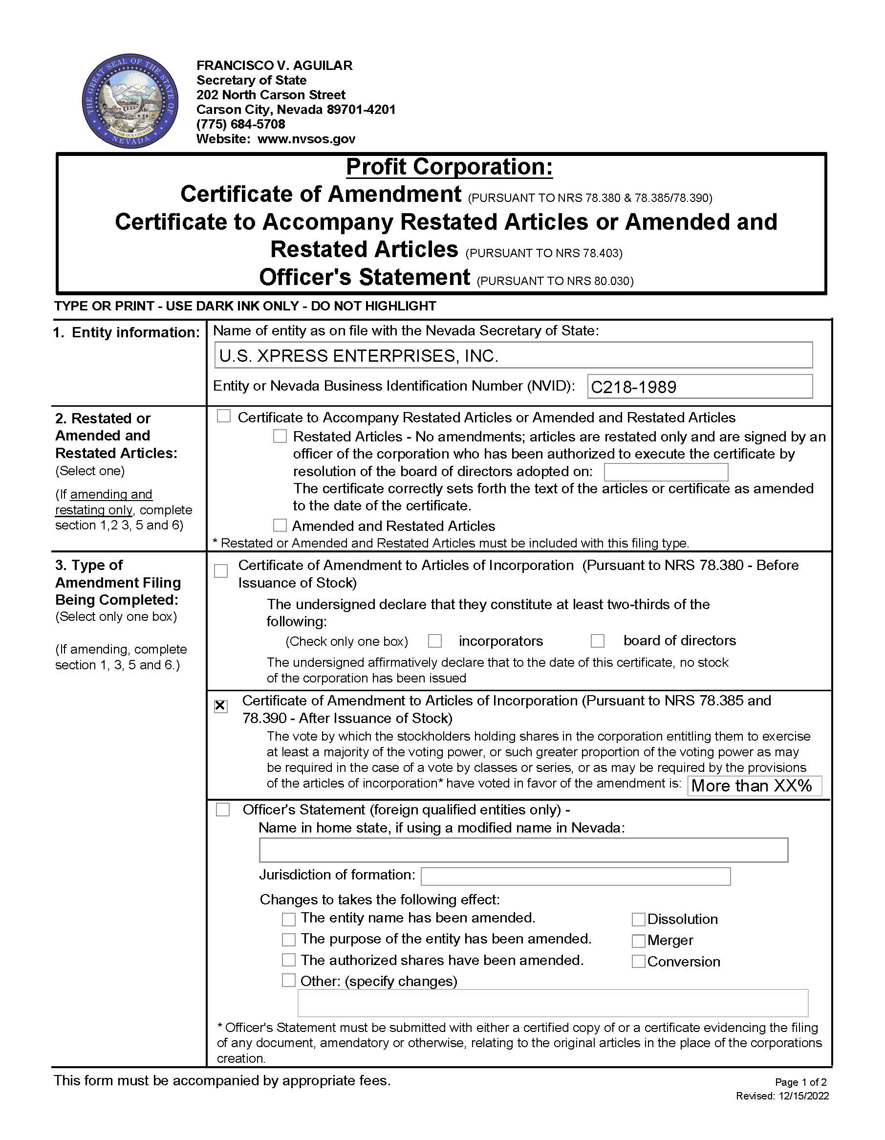 FRANCISCO V. AGUILAR Secretary of State 202 North Carson Street Carson City, Nevada 89701-4201 (775) 684-5708Website: www.nvsos.gov Profit Corporation: Certificate of Amendment (PURSUANT TO NRS 78.380 & 78.385/78.390) Certificate to Accompany Restated Articles or Amended and Restated Articles (PURSUANT TO NRS 78.403) Officer's Statement (PURSUANT TO NRS 80.030) TYPE OR PRINT -USE DARK INK ONLY - DO NOT HIGHLIGHT Page 1 of 2 Revised: 12/15/2022 1.Entity information: U.S. XPRESS ENTERPRISES, INC. Name of entity as on file with the Nevada Secretary of State: This form must be accompanied by appropriate fees. Certificate to Accompany Restated Articles or Amended and Restated Articles Certificate of Amendment to Articles of Incorporation (Pursuant to NRS 78.385 and 78.390 - After Issuance of Stock) The vote by which the stockholders holding shares in the corporation entitling them to exercise at least a majority of the voting power, or such greater proportion of the voting power as may be required in the case of a vote by classes or series, or as may be required by the provisions of the articles of incorporation* have voted in favor of the amendment is: More than XX% Certificate of Amendment to Articles of Incorporation (Pursuant to NRS 78.380 - Before Issuance of Stock) The undersigned declare that they constitute at least two-thirds of the following: (Check only one box) incorporators board of directors The undersigned affirmatively declare that to the date of this certificate, no stock of the corporation has been issued Officer's Statement (foreign qualified entities only) -Name in home state, if using a modified name in Nevada: Jurisdiction of formation: Changes to takes the following effect: The entity name has been amended. The purpose of the entity has been amended. The authorized shares have been amended. Other: (specify changes) *Officer's Statement must be submitted with either a certified copy of or a certificate evidencing the filing of any document, amendatory or otherwise, relating to the original articles in the place of the corporations creation. Dissolution Merger Conversion 3.Type of Amendment Filing Being Completed:(Select only one box) (If amending, complete section 1, 3, 5 and 6.) 2.Restated or Amended and Restated Articles:(Select one) (If amending and restating only, complete section 1,2 3, 5 and 6) Amended and Restated Articles *Restated or Amended and Restated Articles must be included with this filing type. Entity or Nevada Business Identification Number (NVID): C218-1989 Restated Articles - No amendments; articles are restated only and are signed by an officer of the corporation who has been authorized to execute the certificate by resolution of the board of directors adopted on: The certificate correctly sets forth the text of the articles or certificate as amended to the date of the certificate.