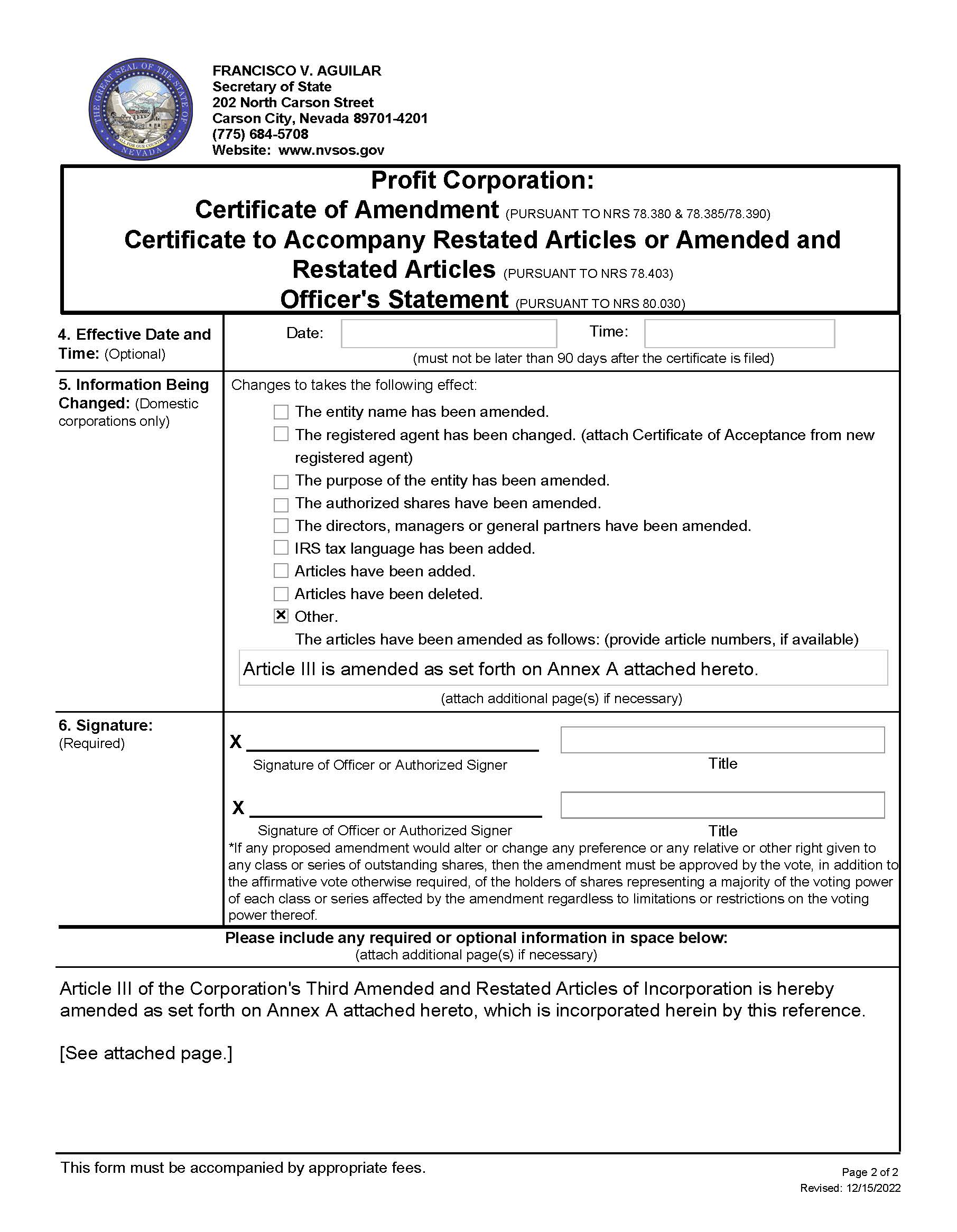 FRANCISCO V. AGUILAR Secretary of State 202 North Carson Street Carson City, Nevada 89701-4201 (775) 684-5708 Website: www.nvsos.gov Profit Corporation: Certificate of Amendment (PURSUANT TO NRS 78.380 & 78.385/78.390) Certificate to Accompany Restated Articles or Amended and Restated Articles (PURSUANT TO NRS 78.403) Officer's Statement (PURSUANT TO NRS 80.030) Time: Date: 4.Effective Date and Time: (Optional) (must not be later than 90 days after the certificate is filed) 5.Information Being Changed (Domestic corporations only) Changes to takes the following effect: The entity name has been amended. The registered agent has been changed. (attach Certificate of Acceptance from new registered agent) The purpose of the entity has been amended. The authorized shares have been amended. The directors, managers or general partners have been amended. IRS tax language has been added. Articles have been added. Articles have been deleted. Other. The articles have been amended as follows: (provide article numbers, if available) (attach additional page(s) if necessary) Article III is amended as set forth on Annex A attached hereto. 6.Signature: (Required) X  Signature of Officer or Authorized Signer Title X  Signature of Officer or Authorized Signer Title *If any proposed amendment would alter or change any preference or any relative or other right given to any class or series of outstanding shares, then the amendment must be approved by the vote, in addition to the affirmative vote otherwise required, of the holders of shares representing a majority of the voting power of each class or series affected by the amendment regardless to limitations or restrictions on the voting power thereof. Please include any required or optional information in space below: (attach additional page(s) if necessary) Article III of the Corporation's Third Amended and Restated Articles of Incorporation is hereby amended as set forth on Annex A attached hereto, which is incorporated herein by this reference.  [See attached page.] This form must be accompanied by appropriate fees. Page 2 of 2 Revised: 12/15/2022