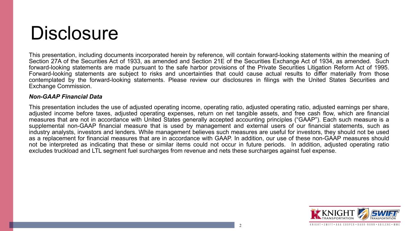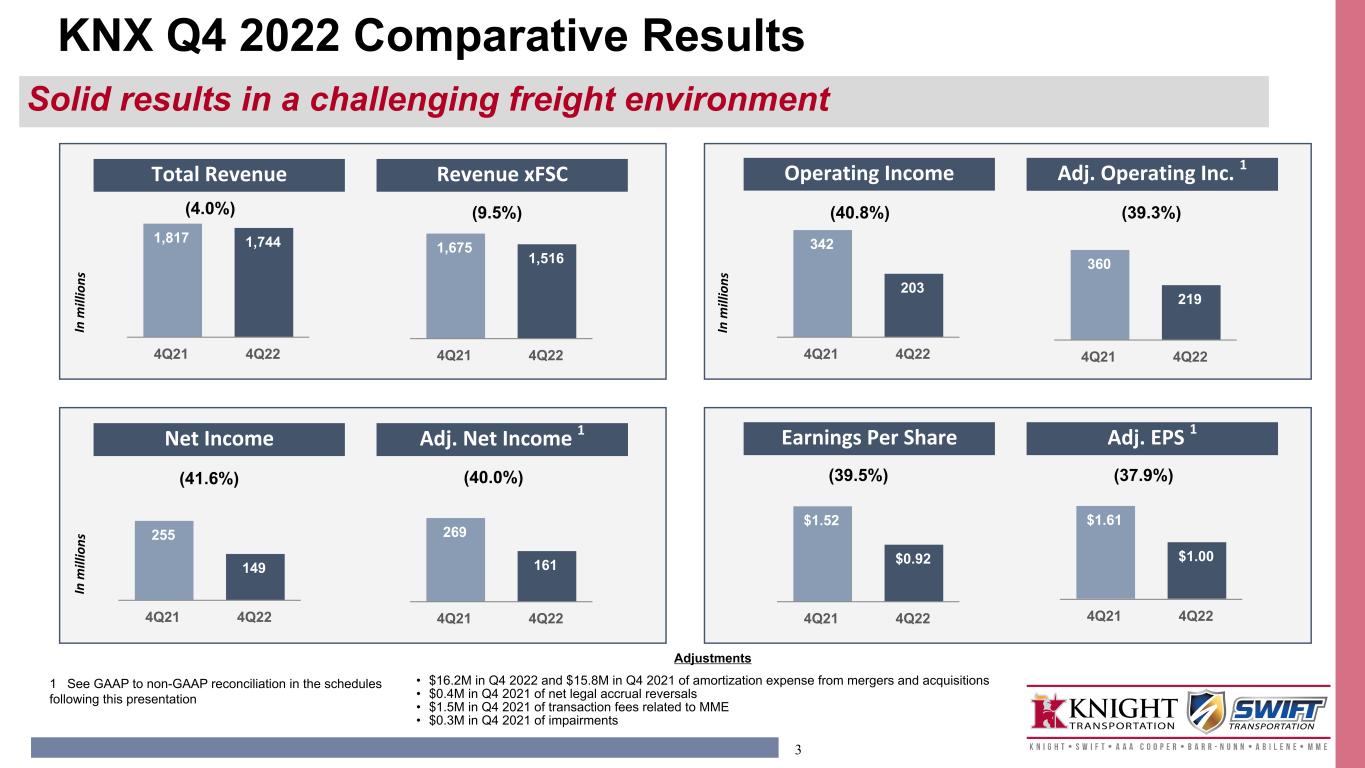 2 Disclosure This presentation, including documents incorporated herein by reference, will contain forward-looking statements within the meaning of Section 27A of the Securities Act of 1933, as amended and Section 21E of the Securities Exchange Act of 1934, as amended. Such forward-looking statements are made pursuant to the safe harbor provisions of the Private Securities Litigation Reform Act of 1995. Forward-looking statements are subject to risks and uncertainties that could cause actual results to differ materially from those contemplated by the forward-looking statements. Please review our disclosures in filings with the United States Securities and Exchange Commission. Non-GAAP Financial Data This presentation includes the use of adjusted operating income, operating ratio, adjusted operating ratio, adjusted earnings per share, adjusted income before taxes, adjusted operating expenses, return on net tangible assets, and free cash flow, which are financial measures that are not in accordance with United States generally accepted accounting principles (“GAAP”). Each such measure is a supplemental non-GAAP financial measure that is used by management and external users of our financial statements, such as industry analysts, investors and lenders. While management believes such measures are useful for investors, they should not be used as a replacement for financial measures that are in accordance with GAAP. In addition, our use of these non-GAAP measures should not be interpreted as indicating that these or similar items could not occur in future periods. In addition, adjusted operating ratio excludes truckload and LTL segment fuel surcharges from revenue and nets these surcharges against fuel expense.