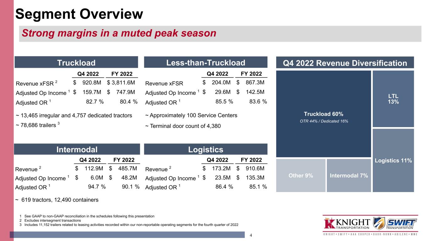 3 Adjustments • $16.2M in Q4 2022 and $15.8M in Q4 2021 of amortization expense from mergers and acquisitions • $0.4M in Q4 2021 of net legal accrual reversals • $1.5M in Q4 2021 of transaction fees related to MME • $0.3M in Q4 2021 of impairments 1 See GAAP to non-GAAP reconciliation in the schedules following this presentation KNX Q4 2022 Comparative Results 1,817 1,744 4Q21 4Q22 Total Revenue (4.0%) 1,675 1,516 4Q21 4Q22 Revenue xFSC (9.5%) 342 203 4Q21 4Q22 Operating Income (40.8%) 360 219 4Q21 4Q22 Adj. Operating Inc. 1 (39.3%) 255 149 4Q21 4Q22 Net Income (41.6%) 269 161 4Q21 4Q22 Adj. Net Income 1 (40.0%) $1.52 $0.92 4Q21 4Q22 Earnings Per Share (39.5%) $1.61 $1.00 4Q21 4Q22 Adj. EPS 1 (37.9%) In m ill io ns In m ill io ns In m ill io ns Solid results in a challenging freight environment