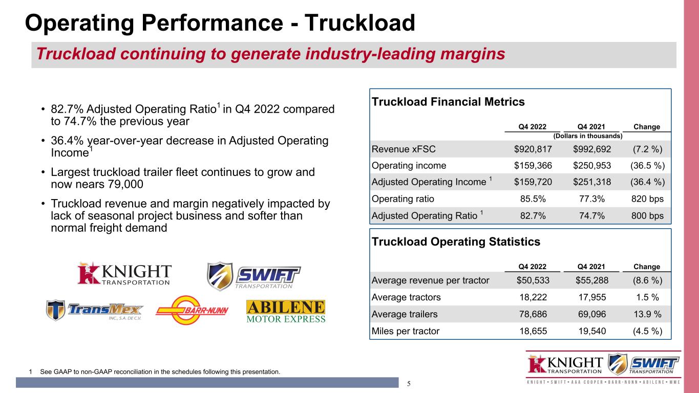 4 Truckload 981.5 57.3 % LTL 224.2 13.1 % Logistics 247.3 14.4 % Intermodal 132.9 7.8 % Other 128.1 7.5 % 1714 1 See GAAP to non-GAAP reconciliation in the schedules following this presentation 2 Excludes intersegment transactions 3 Includes 11,152 trailers related to leasing activities recorded within our non-reportable operating segments for the fourth quarter of 2022 Truckload Q4 2022 FY 2022 Revenue xFSR 2 $ 920.8 M $ 3,811.6 M Adjusted Op Income 1 $ 159.7 M $ 747.9 M Adjusted OR 1 82.7 % 80.4 % ~ 13,465 irregular and 4,757 dedicated tractors ~ 78,686 trailers 3 Intermodal Q4 2022 FY 2022 Revenue 2 $ 112.9 M $ 485.7 M Adjusted Op Income 1 $ 6.0 M $ 48.2 M Adjusted OR 1 94.7 % 90.1 % ~ 619 tractors, 12,490 containers Logistics Q4 2022 FY 2022 Revenue 2 $ 173.2 M $ 910.6 M Adjusted Op Income 1 $ 23.5 M $ 135.3 M Adjusted OR 1 86.4 % 85.1 % Less-than-Truckload Q4 2022 FY 2022 Revenue xFSR $ 204.0 M $ 867.3 M Adjusted Op Income 1 $ 29.6 M $ 142.5 M Adjusted OR 1 85.5 % 83.6 % ~ Approximately 100 Service Centers ~ Terminal door count of 4,380 Q4 2022 Revenue Diversification Truckload 60% LTL 13% Logistics 11% Other 9% Intermodal 7% Segment Overview Strong margins in a muted peak season OTR 44% / Dedicated 16%