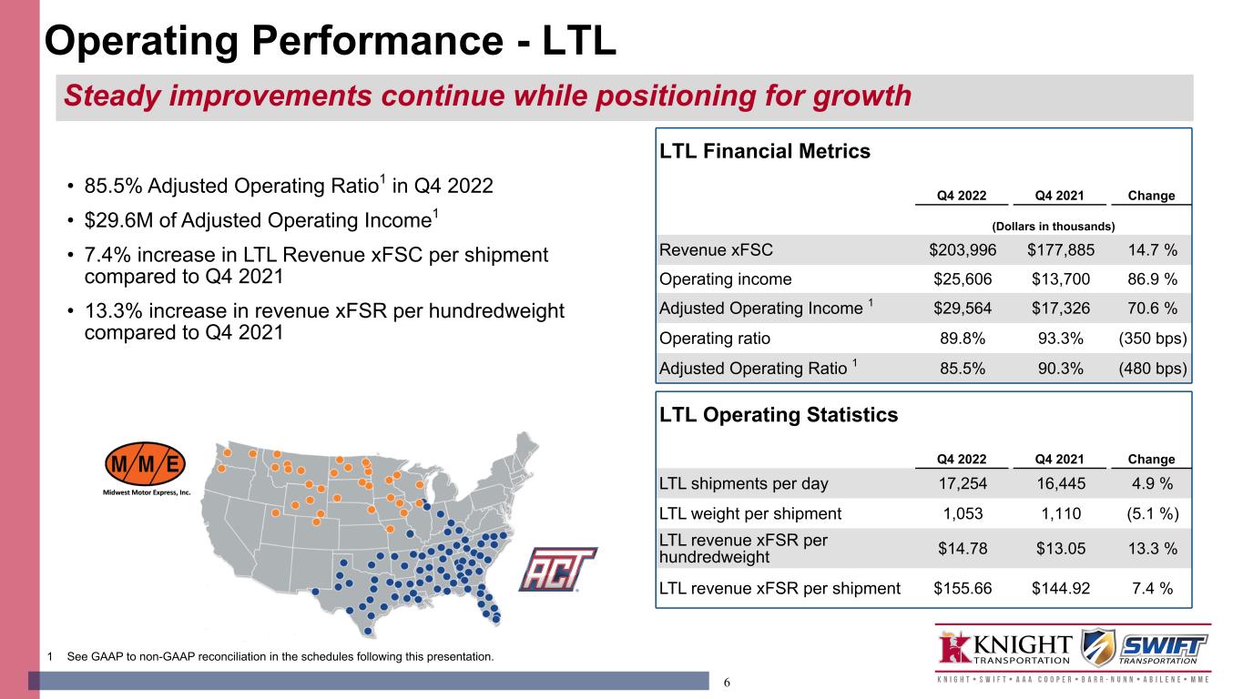 5 • 82.7% Adjusted Operating Ratio1 in Q4 2022 compared to 74.7% the previous year • 36.4% year-over-year decrease in Adjusted Operating Income1 • Largest truckload trailer fleet continues to grow and now nears 79,000 • Truckload revenue and margin negatively impacted by lack of seasonal project business and softer than normal freight demand 1 See GAAP to non-GAAP reconciliation in the schedules following this presentation. Truckload Operating Statistics Q4 2022 Q4 2021 Change Average revenue per tractor $50,533 $55,288 (8.6 %) Average tractors 18,222 17,955 1.5 % Average trailers 78,686 69,096 13.9 % Miles per tractor 18,655 19,540 (4.5 %) Truckload Financial Metrics Q4 2022 Q4 2021 Change (Dollars in thousands) Revenue xFSC $920,817 $992,692 (7.2 %) Operating income $159,366 $250,953 (36.5 %) Adjusted Operating Income 1 $159,720 $251,318 (36.4 %) Operating ratio 85.5% 77.3% 820 bps Adjusted Operating Ratio 1 82.7% 74.7% 800 bps Operating Performance - Truckload Truckload continuing to generate industry-leading margins