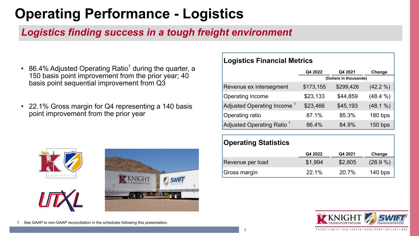 6 • 85.5% Adjusted Operating Ratio1 in Q4 2022 • $29.6M of Adjusted Operating Income1 • 7.4% increase in LTL Revenue xFSC per shipment compared to Q4 2021 • 13.3% increase in revenue xFSR per hundredweight compared to Q4 2021 LTL Operating Statistics Q4 2022 Q4 2021 Change LTL shipments per day 17,254 16,445 4.9 % LTL weight per shipment 1,053 1,110 (5.1 %) LTL revenue xFSR per hundredweight $14.78 $13.05 13.3 % LTL revenue xFSR per shipment $155.66 $144.92 7.4 % 1 See GAAP to non-GAAP reconciliation in the schedules following this presentation. LTL Financial Metrics Q4 2022 Q4 2021 Change (Dollars in thousands) Revenue xFSC $203,996 $177,885 14.7 % Operating income $25,606 $13,700 86.9 % Adjusted Operating Income 1 $29,564 $17,326 70.6 % Operating ratio 89.8% 93.3% (350 bps) Adjusted Operating Ratio 1 85.5% 90.3% (480 bps) Operating Performance - LTL Steady improvements continue while positioning for growth