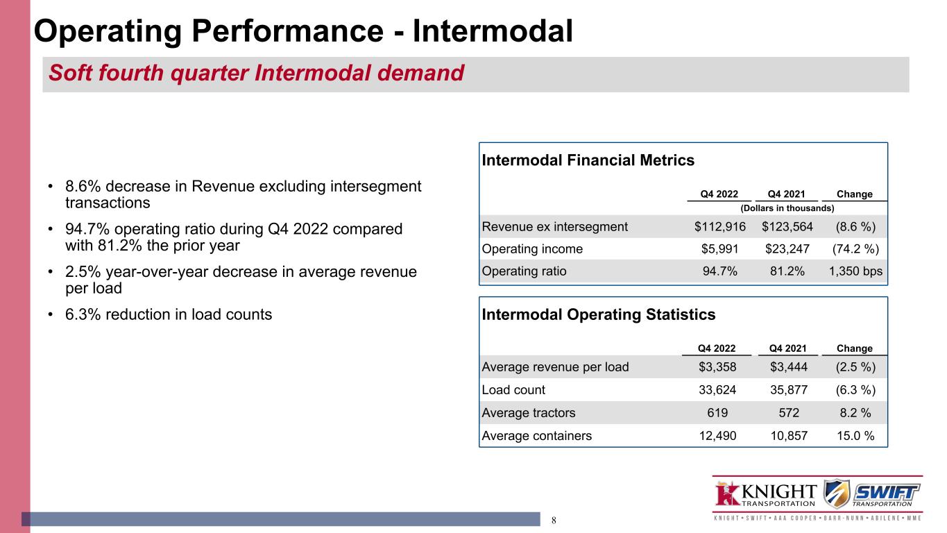 7 • 86.4% Adjusted Operating Ratio1 during the quarter, a 150 basis point improvement from the prior year; 40 basis point sequential improvement from Q3 • 22.1% Gross margin for Q4 representing a 140 basis point improvement from the prior year 1 See GAAP to non-GAAP reconciliation in the schedules following this presentation. Operating Statistics Q4 2022 Q4 2021 Change Revenue per load $1,994 $2,805 (28.9 %) Gross margin 22.1% 20.7% 140 bps Logistics Financial Metrics Q4 2022 Q4 2021 Change (Dollars in thousands) Revenue ex intersegment $173,155 $299,426 (42.2 %) Operating income $23,133 $44,859 (48.4 %) Adjusted Operating Income 1 $23,466 $45,193 (48.1 %) Operating ratio 87.1% 85.3% 180 bps Adjusted Operating Ratio 1 86.4% 84.9% 150 bps Operating Performance - Logistics Logistics finding success in a tough freight environment