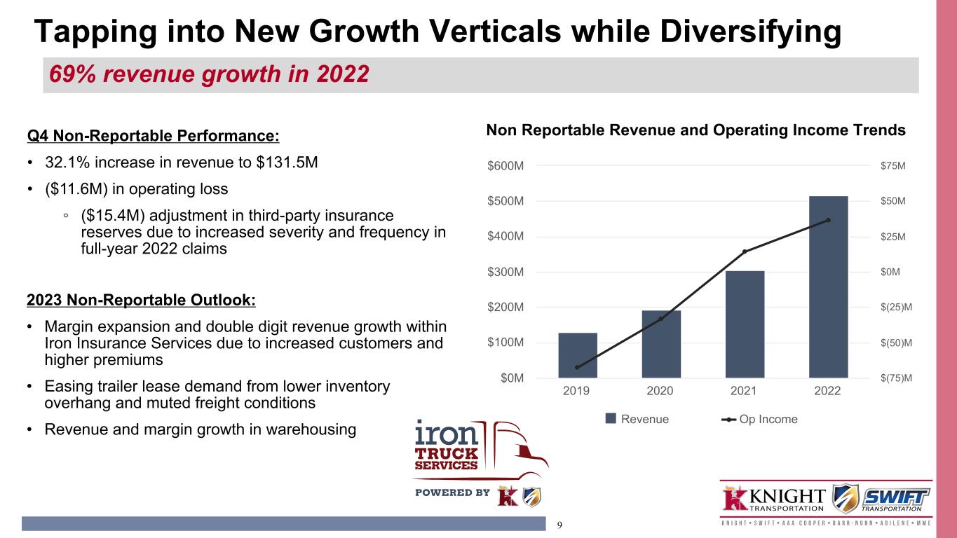 8 • 8.6% decrease in Revenue excluding intersegment transactions • 94.7% operating ratio during Q4 2022 compared with 81.2% the prior year • 2.5% year-over-year decrease in average revenue per load • 6.3% reduction in load counts Intermodal Operating Statistics Q4 2022 Q4 2021 Change Average revenue per load $3,358 $3,444 (2.5 %) Load count 33,624 35,877 (6.3 %) Average tractors 619 572 8.2 % Average containers 12,490 10,857 15.0 % Intermodal Financial Metrics Q4 2022 Q4 2021 Change (Dollars in thousands) Revenue ex intersegment $112,916 $123,564 (8.6 %) Operating income $5,991 $23,247 (74.2 %) Operating ratio 94.7% 81.2% 1,350 bps Operating Performance - Intermodal Soft fourth quarter Intermodal demand