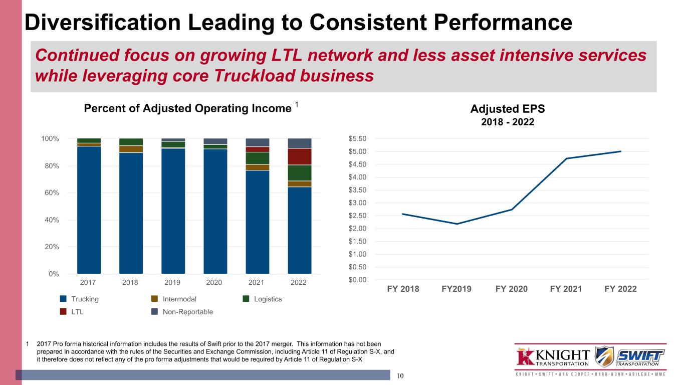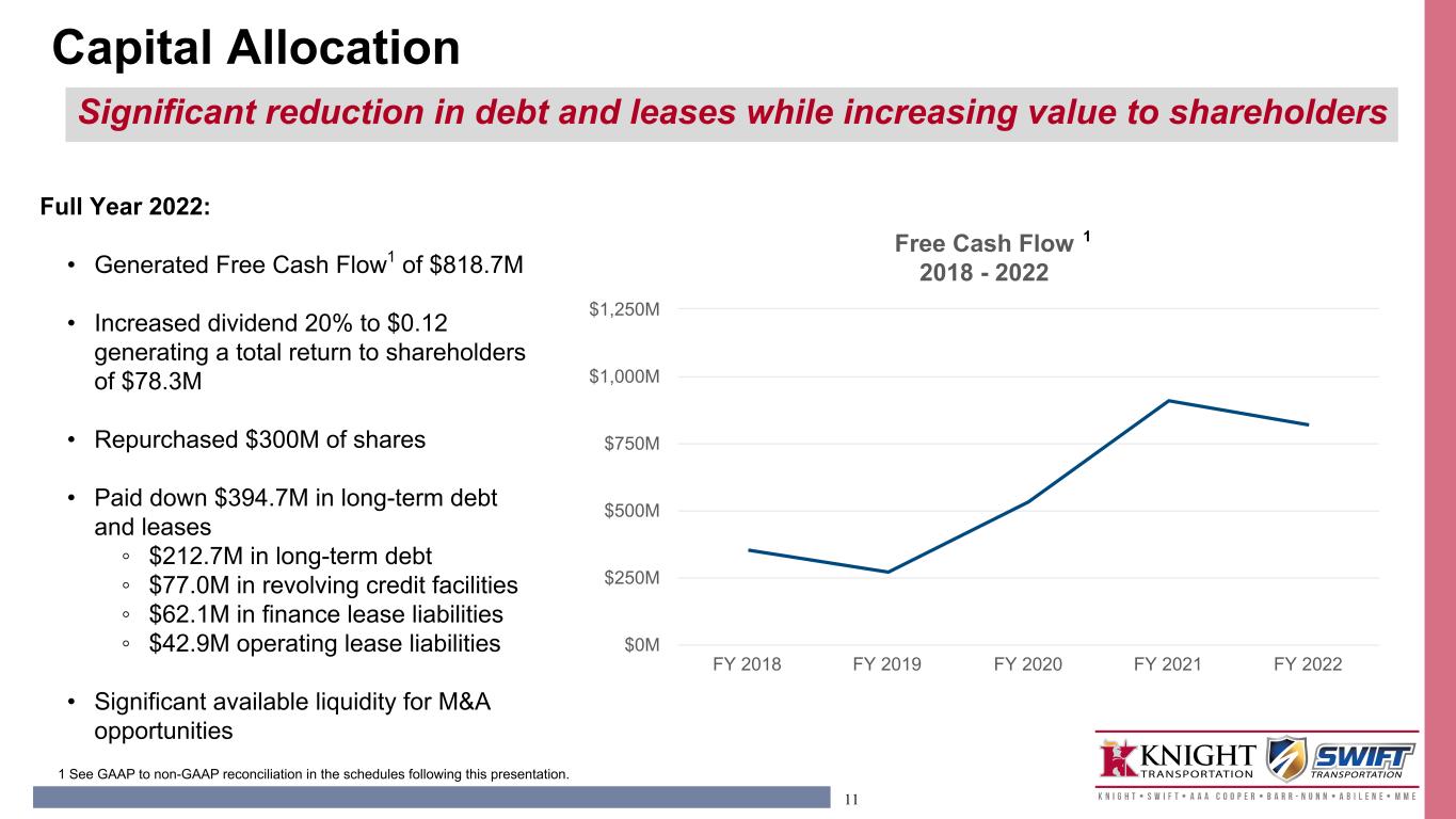10 Trucking Intermodal Logistics LTL Non-Reportable 2017 2018 2019 2020 2021 2022 0% 20% 40% 60% 80% 100% FY 2018 FY2019 FY 2020 FY 2021 FY 2022 $0.00 $0.50 $1.00 $1.50 $2.00 $2.50 $3.00 $3.50 $4.00 $4.50 $5.00 $5.50 Percent of Adjusted Operating Income 1 Adjusted EPS 2018 - 2022 1 2017 Pro forma historical information includes the results of Swift prior to the 2017 merger. This information has not been prepared in accordance with the rules of the Securities and Exchange Commission, including Article 11 of Regulation S-X, and it therefore does not reflect any of the pro forma adjustments that would be required by Article 11 of Regulation S-X Diversification Leading to Consistent Performance Continued focus on growing LTL network and less asset intensive services while leveraging core Truckload business
