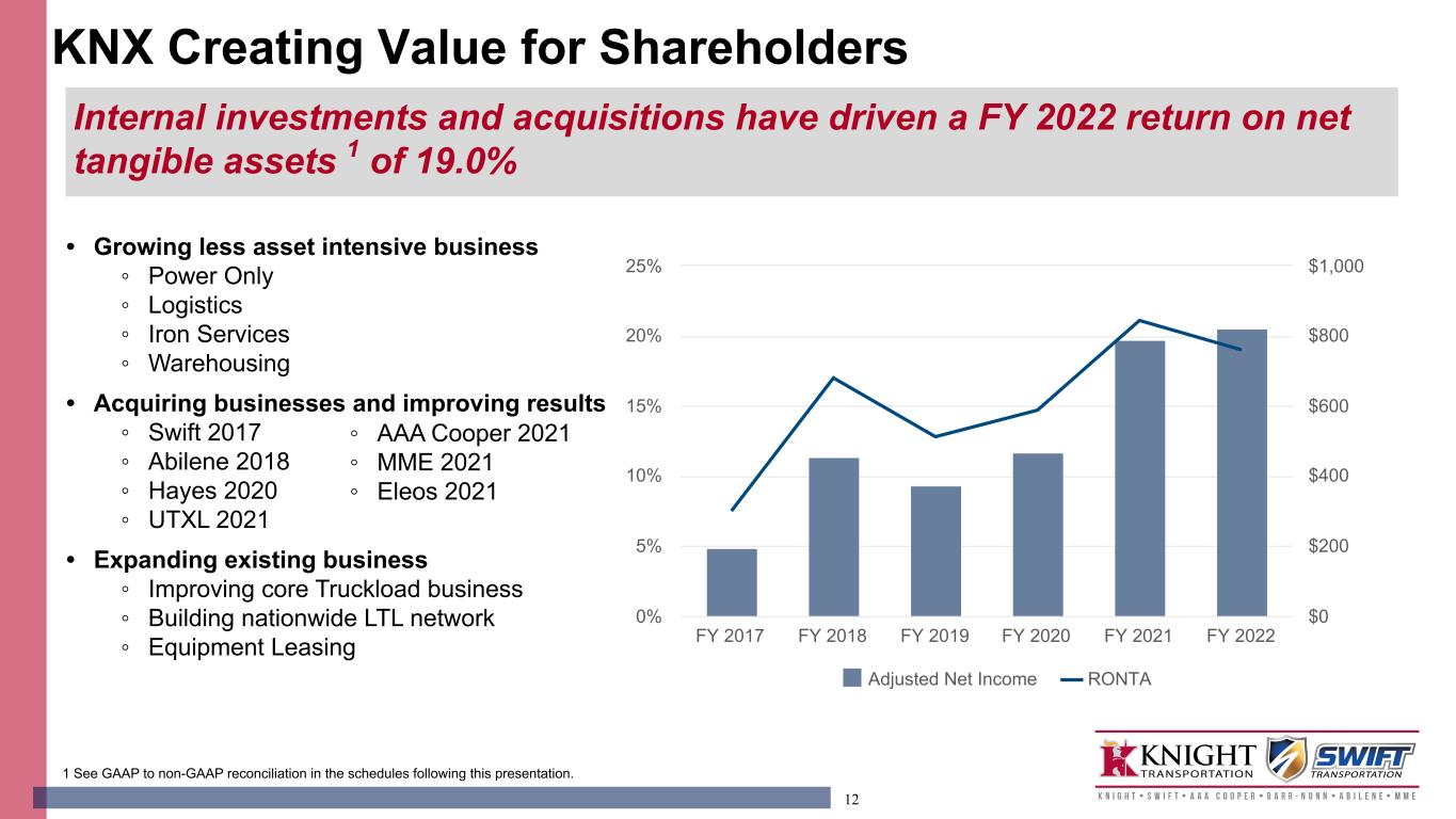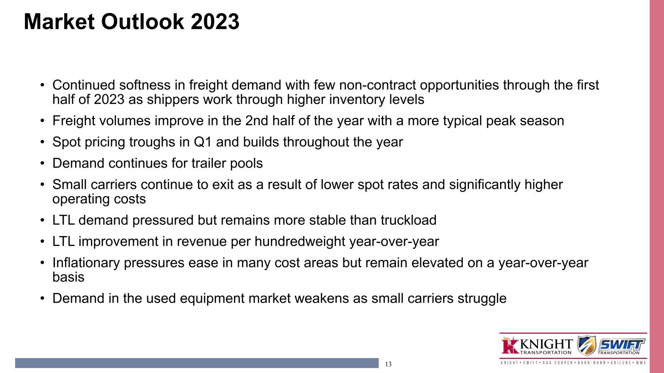 12 • Growing less asset intensive business ◦ Power Only ◦ Logistics ◦ Iron Services ◦ Warehousing • Acquiring businesses and improving results ◦ Swift 2017 ◦ Abilene 2018 ◦ Hayes 2020 ◦ UTXL 2021 • Expanding existing business ◦ Improving core Truckload business ◦ Building nationwide LTL network ◦ Equipment Leasing 1 See GAAP to non-GAAP reconciliation in the schedules following this presentation. Adjusted Net Income RONTA FY 2017 FY 2018 FY 2019 FY 2020 FY 2021 FY 2022 0% 5% 10% 15% 20% 25% $0 $200 $400 $600 $800 $1,000 KNX Creating Value for Shareholders Internal investments and acquisitions have driven a FY 2022 return on net tangible assets 1 of 19.0% ◦ AAA Cooper 2021 ◦ MME 2021 ◦ Eleos 2021