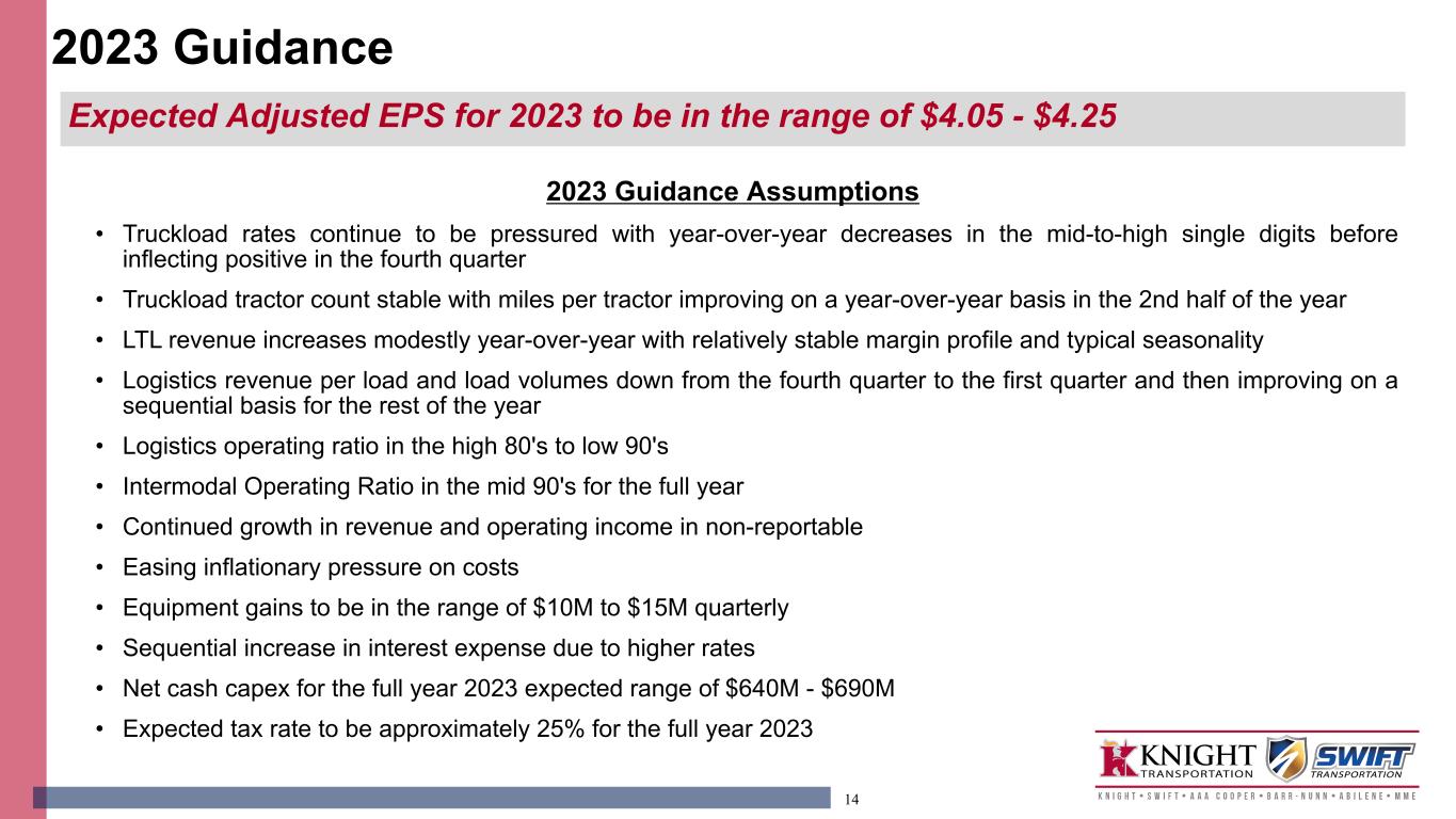 13 • Continued softness in freight demand with few non-contract opportunities through the first half of 2023 as shippers work through higher inventory levels • Freight volumes improve in the 2nd half of the year with a more typical peak season • Spot pricing troughs in Q1 and builds throughout the year • Demand continues for trailer pools • Small carriers continue to exit as a result of lower spot rates and significantly higher operating costs • LTL demand pressured but remains more stable than truckload • LTL improvement in revenue per hundredweight year-over-year • Inflationary pressures ease in many cost areas but remain elevated on a year-over-year basis • Demand in the used equipment market weakens as small carriers struggle Market Outlook 2023