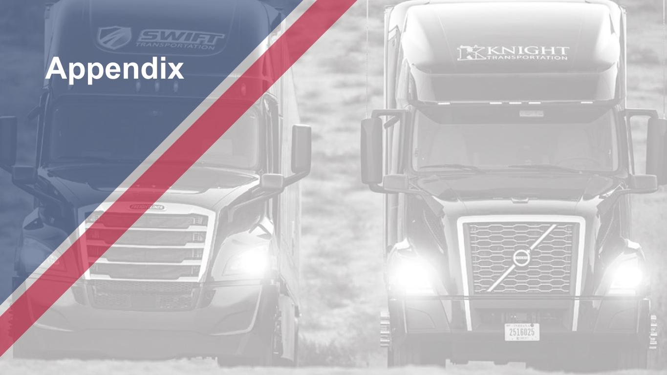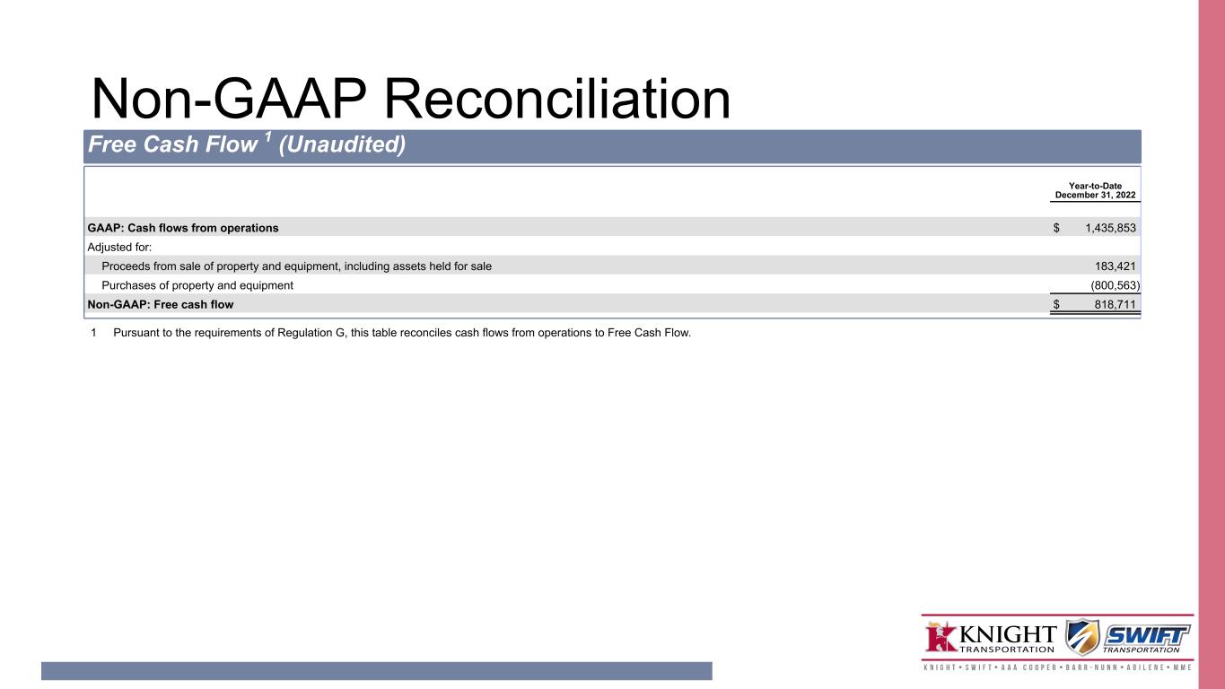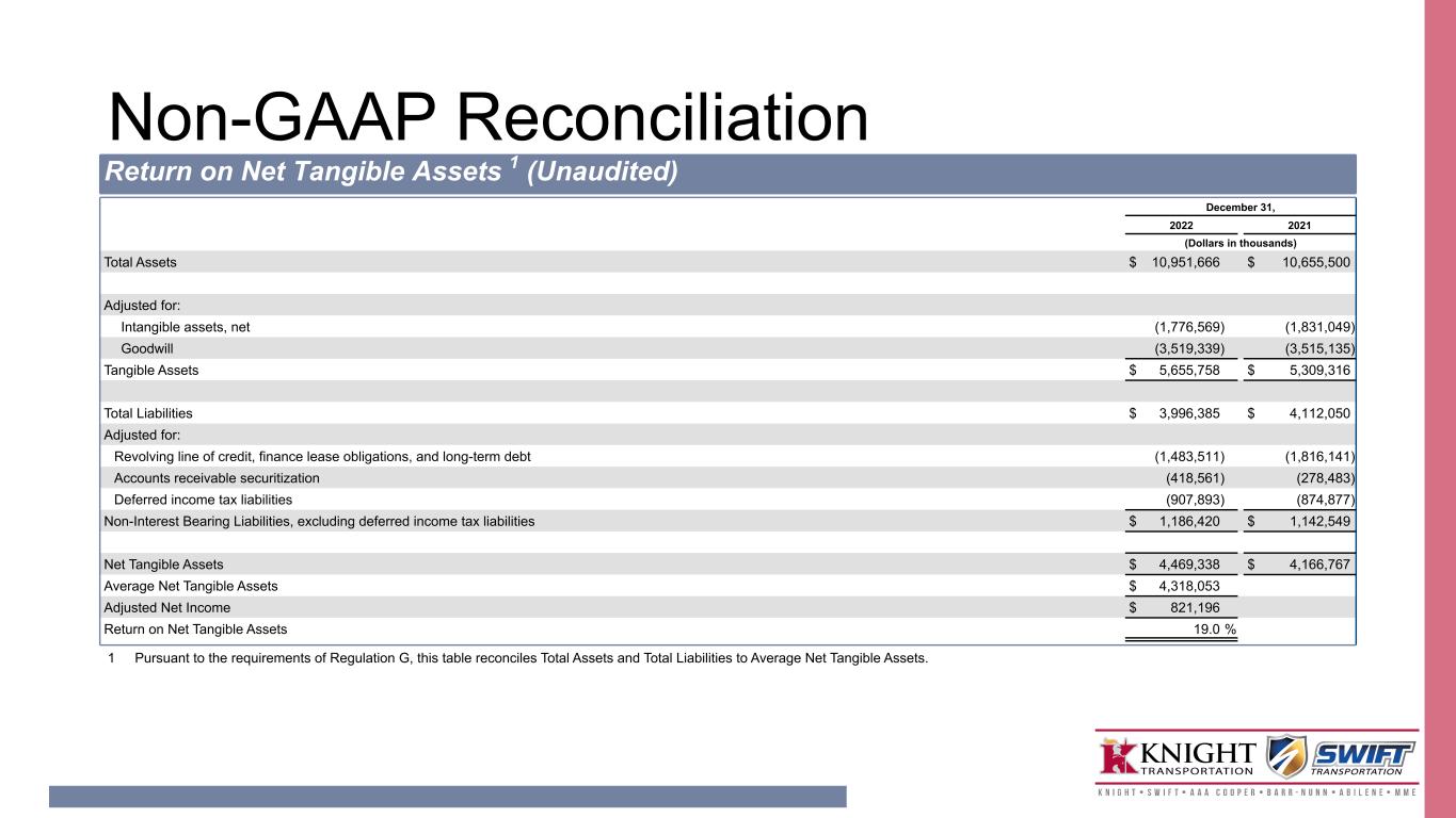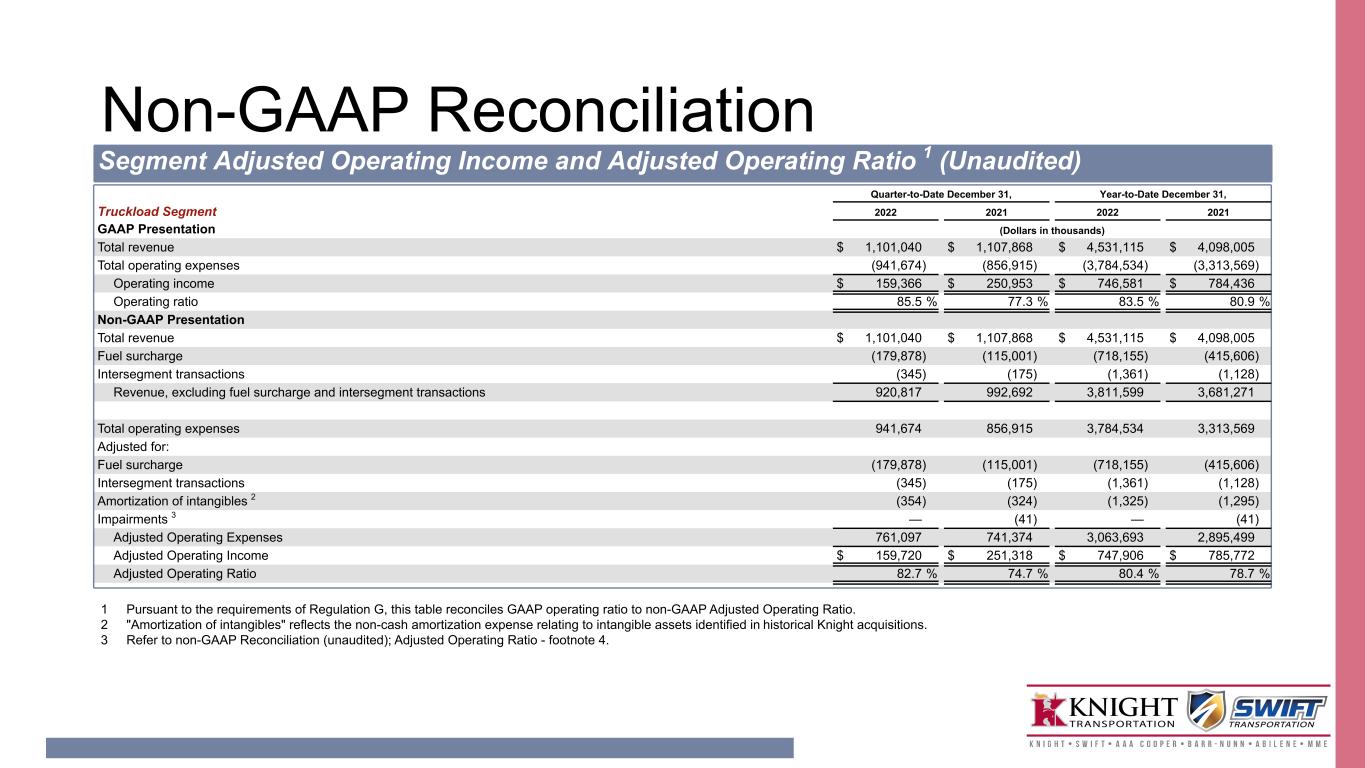 Non-GAAP Reconciliation Segment Adjusted Operating Income and Adjusted Operating Ratio 1 (Unaudited) Quarter-to-Date December 31, Year-to-Date December 31, Truckload Segment 2022 2021 2022 2021 GAAP Presentation (Dollars in thousands) Total revenue $ 1,101,040 $ 1,107,868 $ 4,531,115 $ 4,098,005 Total operating expenses (941,674) (856,915) (3,784,534) (3,313,569) Operating income $ 159,366 $ 250,953 $ 746,581 $ 784,436 Operating ratio 85.5 % 77.3 % 83.5 % 80.9 % Non-GAAP Presentation Total revenue $ 1,101,040 $ 1,107,868 $ 4,531,115 $ 4,098,005 Fuel surcharge (179,878) (115,001) (718,155) (415,606) Intersegment transactions (345) (175) (1,361) (1,128) Revenue, excluding fuel surcharge and intersegment transactions 920,817 992,692 3,811,599 3,681,271 Total operating expenses 941,674 856,915 3,784,534 3,313,569 Adjusted for: Fuel surcharge (179,878) (115,001) (718,155) (415,606) Intersegment transactions (345) (175) (1,361) (1,128) Amortization of intangibles 2 (354) (324) (1,325) (1,295) Impairments 3 — (41) — (41) Adjusted Operating Expenses 761,097 741,374 3,063,693 2,895,499 Adjusted Operating Income $ 159,720 $ 251,318 $ 747,906 $ 785,772 Adjusted Operating Ratio 82.7 % 74.7 % 80.4 % 78.7 % 1 Pursuant to the requirements of Regulation G, this table reconciles GAAP operating ratio to non-GAAP Adjusted Operating Ratio. 2 "Amortization of intangibles" reflects the non-cash amortization expense relating to intangible assets identified in historical Knight acquisitions. 3 Refer to non-GAAP Reconciliation (unaudited); Adjusted Operating Ratio - footnote 4.