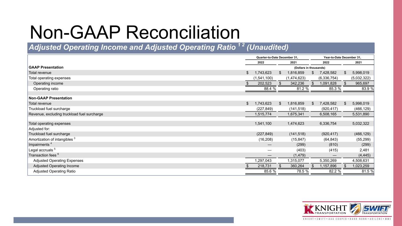 Non-GAAP Reconciliation Adjusted Operating Income and Adjusted Operating Ratio 1 2 (Unaudited) Quarter-to-Date December 31, Year-to-Date December 31, 2022 2021 2022 2021 GAAP Presentation (Dollars in thousands) Total revenue $ 1,743,623 $ 1,816,859 $ 7,428,582 $ 5,998,019 Total operating expenses (1,541,100) (1,474,623) (6,336,754) (5,032,322) Operating income $ 202,523 $ 342,236 $ 1,091,828 $ 965,697 Operating ratio 88.4 % 81.2 % 85.3 % 83.9 % Non-GAAP Presentation Total revenue $ 1,743,623 $ 1,816,859 $ 7,428,582 $ 5,998,019 Truckload fuel surcharge (227,849) (141,518) (920,417) (466,129) Revenue, excluding truckload fuel surcharge 1,515,774 1,675,341 6,508,165 5,531,890 Total operating expenses 1,541,100 1,474,623 6,336,754 5,032,322 Adjusted for: Truckload fuel surcharge (227,849) (141,518) (920,417) (466,129) Amortization of intangibles 3 (16,208) (15,847) (64,843) (55,299) Impairments 4 — (299) (810) (299) Legal accruals 5 — (403) (415) 2,481 Transaction fees 6 — (1,479) — (4,445) Adjusted Operating Expenses 1,297,043 1,315,077 5,350,269 4,508,631 Adjusted Operating Income $ 218,731 $ 360,264 $ 1,157,896 $ 1,023,259 Adjusted Operating Ratio 85.6 % 78.5 % 82.2 % 81.5 %