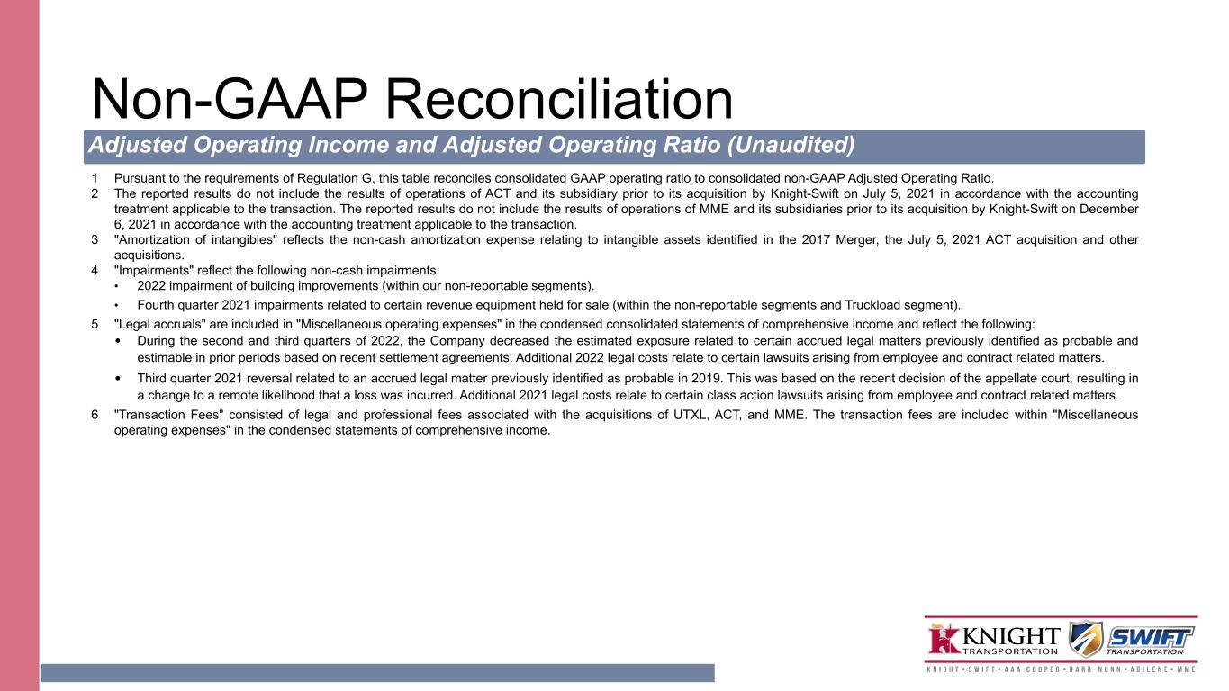 Non-GAAP Reconciliation Adjusted Operating Income and Adjusted Operating Ratio (Unaudited) 1 Pursuant to the requirements of Regulation G, this table reconciles consolidated GAAP operating ratio to consolidated non-GAAP Adjusted Operating Ratio. 2 The reported results do not include the results of operations of ACT and its subsidiary prior to its acquisition by Knight-Swift on July 5, 2021 in accordance with the accounting treatment applicable to the transaction. The reported results do not include the results of operations of MME and its subsidiaries prior to its acquisition by Knight-Swift on December 6, 2021 in accordance with the accounting treatment applicable to the transaction. 3 "Amortization of intangibles" reflects the non-cash amortization expense relating to intangible assets identified in the 2017 Merger, the July 5, 2021 ACT acquisition and other acquisitions. 4 "Impairments" reflect the following non-cash impairments: • 2022 impairment of building improvements (within our non-reportable segments). • Fourth quarter 2021 impairments related to certain revenue equipment held for sale (within the non-reportable segments and Truckload segment). 5 "Legal accruals" are included in "Miscellaneous operating expenses" in the condensed consolidated statements of comprehensive income and reflect the following: • During the second and third quarters of 2022, the Company decreased the estimated exposure related to certain accrued legal matters previously identified as probable and estimable in prior periods based on recent settlement agreements. Additional 2022 legal costs relate to certain lawsuits arising from employee and contract related matters. • Third quarter 2021 reversal related to an accrued legal matter previously identified as probable in 2019. This was based on the recent decision of the appellate court, resulting in a change to a remote likelihood that a loss was incurred. Additional 2021 legal costs relate to certain class action lawsuits arising from employee and contract related matters. 6 "Transaction Fees" consisted of legal and professional fees associated with the acquisitions of UTXL, ACT, and MME. The transaction fees are included within "Miscellaneous operating expenses" in the condensed statements of comprehensive income.