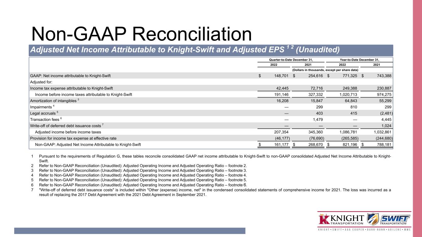 Non-GAAP Reconciliation Adjusted Net Income Attributable to Knight-Swift and Adjusted EPS 1 2 (Unaudited) Quarter-to-Date December 31, Year-to-Date December 31, 2022 2021 2022 2021 (Dollars in thousands, except per share data) GAAP: Net income attributable to Knight-Swift $ 148,701 $ 254,616 $ 771,325 $ 743,388 Adjusted for: Income tax expense attributable to Knight-Swift 42,445 72,716 249,388 230,887 Income before income taxes attributable to Knight-Swift 191,146 327,332 1,020,713 974,275 Amortization of intangibles 3 16,208 15,847 64,843 55,299 Impairments 4 — 299 810 299 Legal accruals 5 — 403 415 (2,481) Transaction fees 6 — 1,479 — 4,445 Write-off of deferred debt issuance costs 7 — — — 1,024 Adjusted income before income taxes 207,354 345,360 1,086,781 1,032,861 Provision for income tax expense at effective rate (46,177) (76,690) (265,585) (244,680) Non-GAAP: Adjusted Net Income Attributable to Knight-Swift $ 161,177 $ 268,670 $ 821,196 $ 788,181 1 Pursuant to the requirements of Regulation G, these tables reconcile consolidated GAAP net income attributable to Knight-Swift to non-GAAP consolidated Adjusted Net Income Attributable to Knight- Swift. 2 Refer to Non-GAAP Reconciliation (Unaudited): Adjusted Operating Income and Adjusted Operating Ratio – footnote 2. 3 Refer to Non-GAAP Reconciliation (Unaudited): Adjusted Operating Income and Adjusted Operating Ratio – footnote 3. 4 Refer to Non-GAAP Reconciliation (Unaudited): Adjusted Operating Income and Adjusted Operating Ratio – footnote 4. 5 Refer to Non-GAAP Reconciliation (Unaudited): Adjusted Operating Income and Adjusted Operating Ratio – footnote 5. 6 Refer to Non-GAAP Reconciliation (Unaudited): Adjusted Operating Income and Adjusted Operating Ratio – footnote 6. 7 "Write-off of deferred debt issuance costs" is included within "Other (expense) income, net" in the condensed consolidated statements of comprehensive income for 2021. The loss was incurred as a result of replacing the 2017 Debt Agreement with the 2021 Debt Agreement in September 2021.