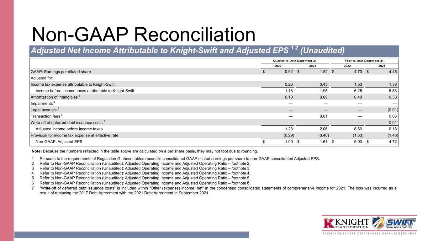 Non-GAAP Reconciliation Adjusted Net Income Attributable to Knight-Swift and Adjusted EPS 1 2 (Unaudited) Quarter-to-Date December 31, Year-to-Date December 31, 2022 2021 2022 2021 GAAP: Earnings per diluted share $ 0.92 $ 1.52 $ 4.73 $ 4.45 Adjusted for: Income tax expense attributable to Knight-Swift 0.26 0.43 1.53 1.38 Income before income taxes attributable to Knight-Swift 1.18 1.96 6.25 5.83 Amortization of intangibles 3 0.10 0.09 0.40 0.33 Impairments 4 — — — — Legal accruals 5 — — — (0.01) Transaction fees 6 — 0.01 — 0.03 Write-off of deferred debt issuance costs 7 — — — 0.01 Adjusted income before income taxes 1.28 2.06 6.66 6.18 Provision for income tax expense at effective rate (0.29) (0.46) (1.63) (1.46) Non-GAAP: Adjusted EPS $ 1.00 $ 1.61 $ 5.03 $ 4.72 Note: Because the numbers reflected in the table above are calculated on a per share basis, they may not foot due to rounding. 1 Pursuant to the requirements of Regulation G, these tables reconcile consolidated GAAP diluted earnings per share to non-GAAP consolidated Adjusted EPS. 2 Refer to Non-GAAP Reconciliation (Unaudited): Adjusted Operating Income and Adjusted Operating Ratio – footnote 2. 3 Refer to Non-GAAP Reconciliation (Unaudited): Adjusted Operating Income and Adjusted Operating Ratio – footnote 3. 4 Refer to Non-GAAP Reconciliation (Unaudited): Adjusted Operating Income and Adjusted Operating Ratio – footnote 4. 5 Refer to Non-GAAP Reconciliation (Unaudited): Adjusted Operating Income and Adjusted Operating Ratio – footnote 5. 6 Refer to Non-GAAP Reconciliation (Unaudited): Adjusted Operating Income and Adjusted Operating Ratio – footnote 6. 7 "Write-off of deferred debt issuance costs" is included within "Other (expense) income, net" in the condensed consolidated statements of comprehensive income for 2021. The loss was incurred as a result of replacing the 2017 Debt Agreement with the 2021 Debt Agreement in September 2021.