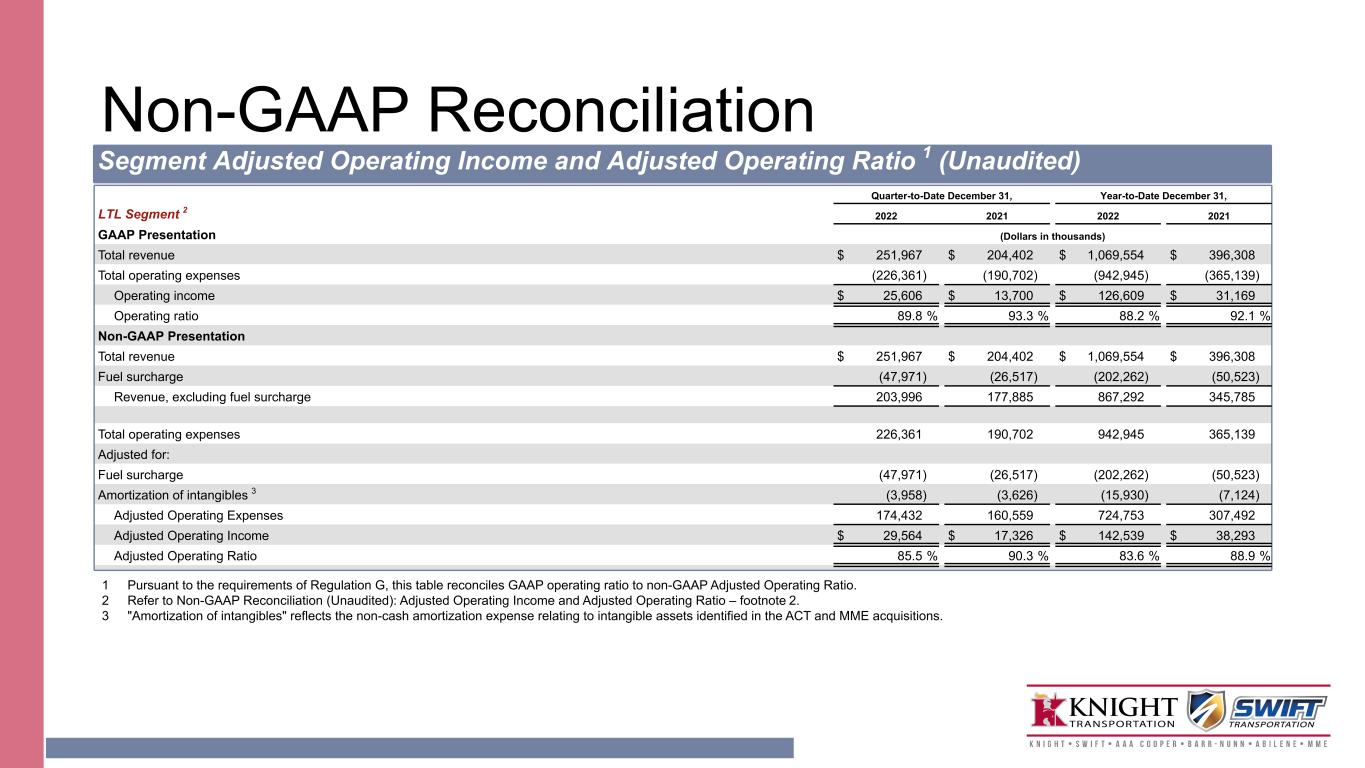 Non-GAAP Reconciliation Segment Adjusted Operating Income and Adjusted Operating Ratio 1 (Unaudited) Quarter-to-Date December 31, Year-to-Date December 31, LTL Segment 2 2022 2021 2022 2021 GAAP Presentation (Dollars in thousands) Total revenue $ 251,967 $ 204,402 $ 1,069,554 $ 396,308 Total operating expenses (226,361) (190,702) (942,945) (365,139) Operating income $ 25,606 $ 13,700 $ 126,609 $ 31,169 Operating ratio 89.8 % 93.3 % 88.2 % 92.1 % Non-GAAP Presentation Total revenue $ 251,967 $ 204,402 $ 1,069,554 $ 396,308 Fuel surcharge (47,971) (26,517) (202,262) (50,523) Revenue, excluding fuel surcharge 203,996 177,885 867,292 345,785 Total operating expenses 226,361 190,702 942,945 365,139 Adjusted for: Fuel surcharge (47,971) (26,517) (202,262) (50,523) Amortization of intangibles 3 (3,958) (3,626) (15,930) (7,124) Adjusted Operating Expenses 174,432 160,559 724,753 307,492 Adjusted Operating Income $ 29,564 $ 17,326 $ 142,539 $ 38,293 Adjusted Operating Ratio 85.5 % 90.3 % 83.6 % 88.9 % 1 Pursuant to the requirements of Regulation G, this table reconciles GAAP operating ratio to non-GAAP Adjusted Operating Ratio. 2 Refer to Non-GAAP Reconciliation (Unaudited): Adjusted Operating Income and Adjusted Operating Ratio – footnote 2. 3 "Amortization of intangibles" reflects the non-cash amortization expense relating to intangible assets identified in the ACT and MME acquisitions.