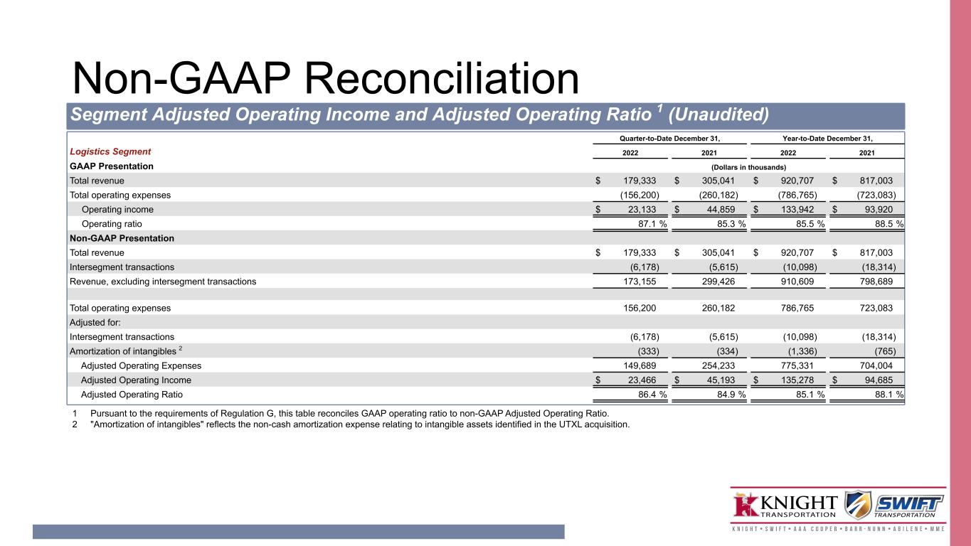 Non-GAAP Reconciliation Quarter-to-Date December 31, Year-to-Date December 31, Logistics Segment 2022 2021 2022 2021 GAAP Presentation (Dollars in thousands) Total revenue $ 179,333 $ 305,041 $ 920,707 $ 817,003 Total operating expenses (156,200) (260,182) (786,765) (723,083) Operating income $ 23,133 $ 44,859 $ 133,942 $ 93,920 Operating ratio 87.1 % 85.3 % 85.5 % 88.5 % Non-GAAP Presentation Total revenue $ 179,333 $ 305,041 $ 920,707 $ 817,003 Intersegment transactions (6,178) (5,615) (10,098) (18,314) Revenue, excluding intersegment transactions 173,155 299,426 910,609 798,689 Total operating expenses 156,200 260,182 786,765 723,083 Adjusted for: Intersegment transactions (6,178) (5,615) (10,098) (18,314) Amortization of intangibles 2 (333) (334) (1,336) (765) Adjusted Operating Expenses 149,689 254,233 775,331 704,004 Adjusted Operating Income $ 23,466 $ 45,193 $ 135,278 $ 94,685 Adjusted Operating Ratio 86.4 % 84.9 % 85.1 % 88.1 % Segment Adjusted Operating Income and Adjusted Operating Ratio 1 (Unaudited) 1 Pursuant to the requirements of Regulation G, this table reconciles GAAP operating ratio to non-GAAP Adjusted Operating Ratio. 2 "Amortization of intangibles" reflects the non-cash amortization expense relating to intangible assets identified in the UTXL acquisition.