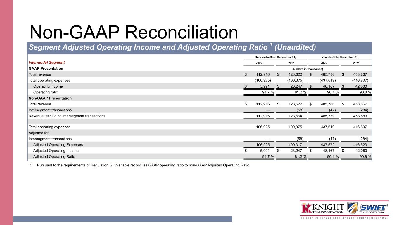 Non-GAAP Reconciliation Segment Adjusted Operating Income and Adjusted Operating Ratio 1 (Unaudited) Quarter-to-Date December 31, Year-to-Date December 31, Intermodal Segment 2022 2021 2022 2021 GAAP Presentation (Dollars in thousands) Total revenue $ 112,916 $ 123,622 $ 485,786 $ 458,867 Total operating expenses (106,925) (100,375) (437,619) (416,807) Operating income $ 5,991 $ 23,247 $ 48,167 $ 42,060 Operating ratio 94.7 % 81.2 % 90.1 % 90.8 % Non-GAAP Presentation Total revenue $ 112,916 $ 123,622 $ 485,786 $ 458,867 Intersegment transactions — (58) (47) (284) Revenue, excluding intersegment transactions 112,916 123,564 485,739 458,583 Total operating expenses 106,925 100,375 437,619 416,807 Adjusted for: Intersegment transactions — (58) (47) (284) Adjusted Operating Expenses 106,925 100,317 437,572 416,523 Adjusted Operating Income $ 5,991 $ 23,247 $ 48,167 $ 42,060 Adjusted Operating Ratio 94.7 % 81.2 % 90.1 % 90.8 % 1 Pursuant to the requirements of Regulation G, this table reconciles GAAP operating ratio to non-GAAP Adjusted Operating Ratio.