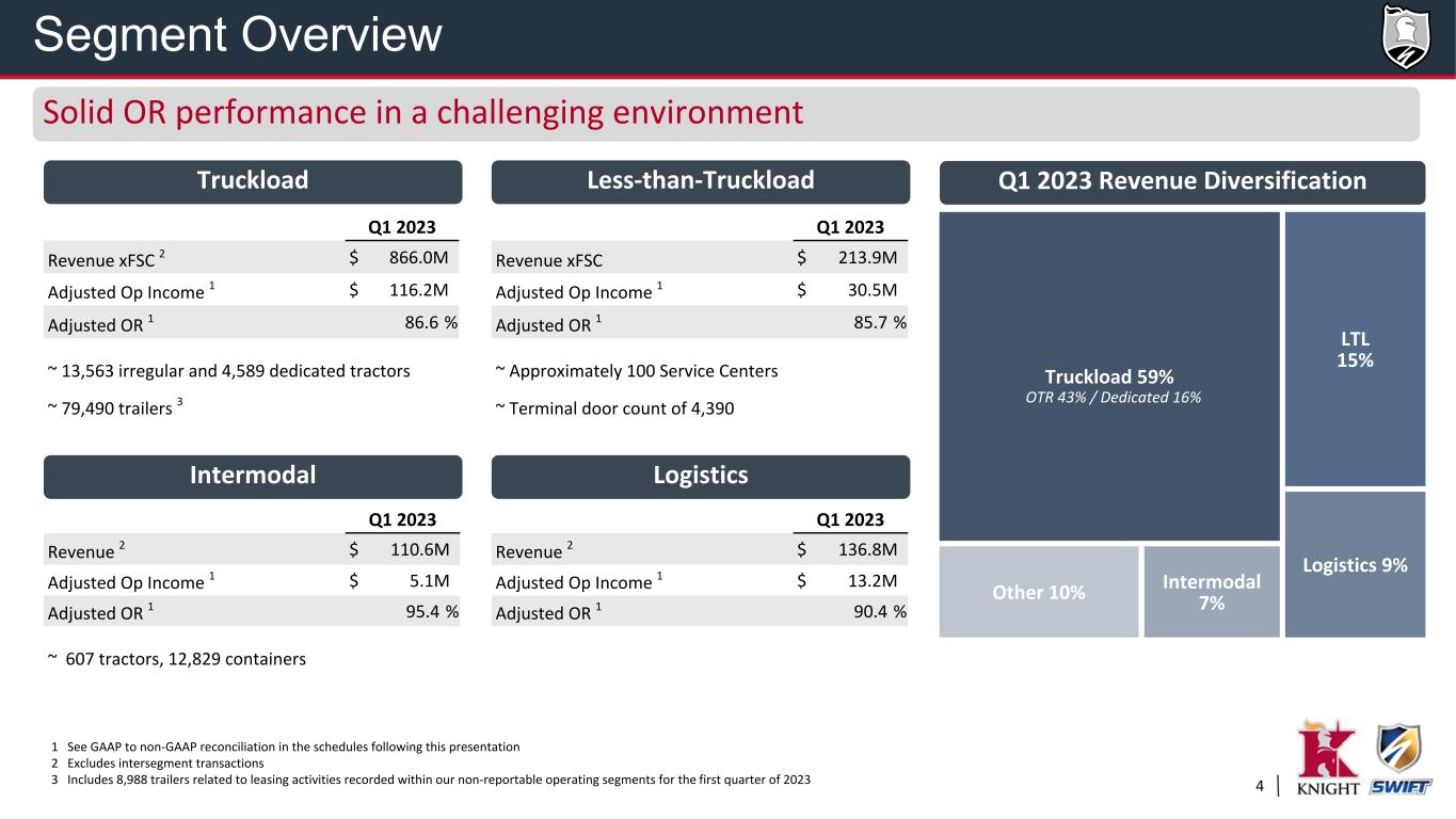 3 Adjustments • $16.2M in Q1 2023 and $16.2M in Q1 2022 of amortization expense from mergers and acquisitions • $0.3M decrease and $5.1M increase in legal accrual related to settlements in Q1 2023 and Q1 2022, respectively • $0.8M in Q1 2022 of impairments • $1.5M in Q1 2023 of transaction fees • $1.5M in Q1 2023 of severance expense 1 See GAAP to non-GAAP reconciliation in the schedules following this presentation KNX Q1 2023 Comparative Results 1,827 1,637 1Q22 1Q23 Total Revenue (10.4%) 1,648 1,450 1Q22 1Q23 Revenue xFSC (12.0%) 298 145 1Q22 1Q23 Operating Income (51.4%) 320 164 1Q22 1Q23 Adj. Operating Inc. 1 (48.9%) 208 104 1Q22 1Q23 Net Income (49.9%) 225 118 1Q22 1Q23 Adj. Net Income 1 (47.3%) $1.25 $0.64 1Q22 1Q23 Earnings Per Share (48.8%) $1.35 $0.73 1Q22 1Q23 Adj. EPS 1 (45.8%) In m ill io ns In m ill io ns In m ill io ns Strong margins as we navigate challenging freight environment Creating Value To Drive Growth Leveraging our scale, technology, and talented people to help our customers solve large, complex supply chain challenges
