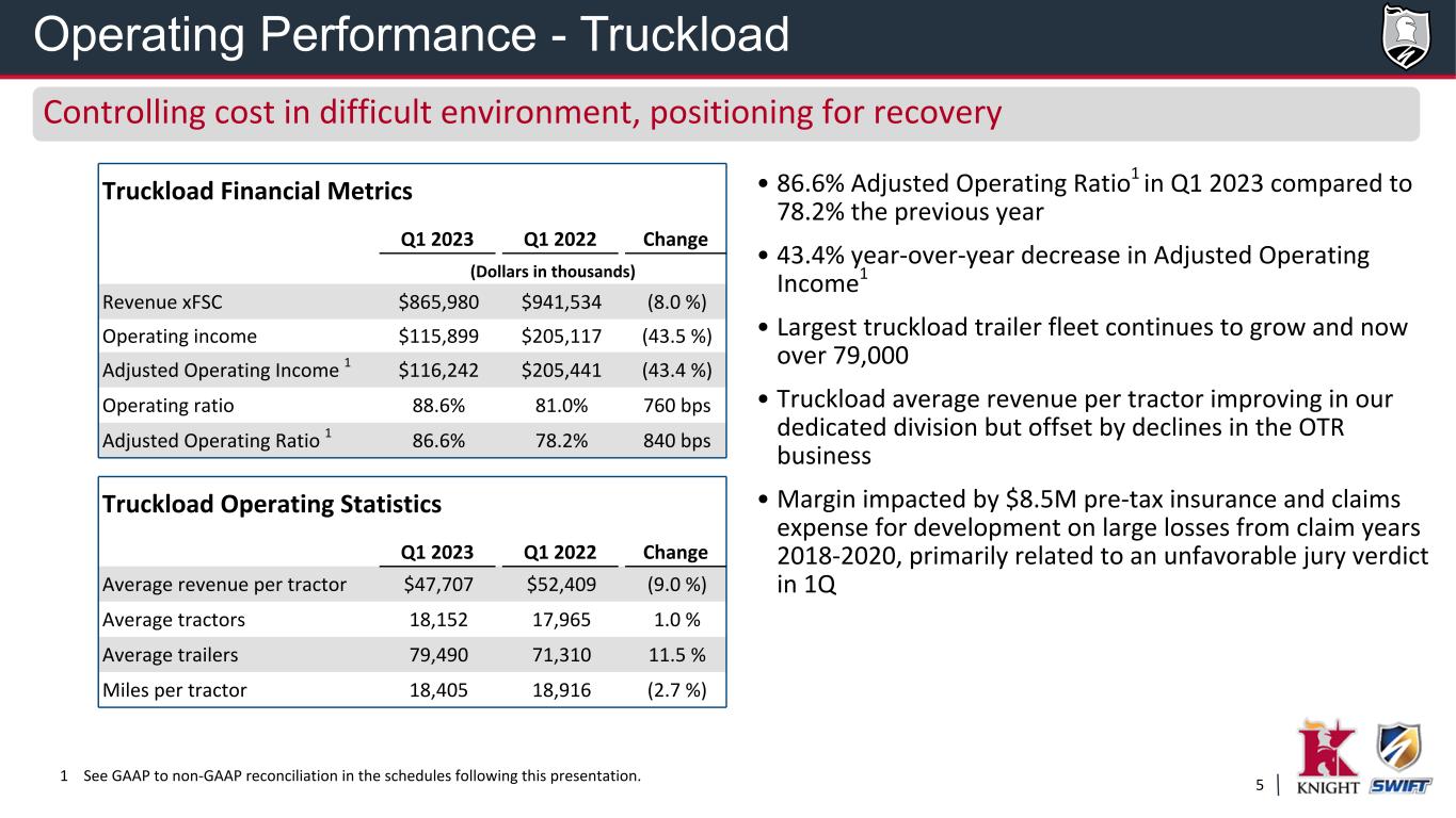 4 Truckload 981.5 57.3 % LTL 224.2 13.1 % Logistics 247.3 14.4 % Intermodal 132.9 7.8 % Other 128.1 7.5 % 1714 1 See GAAP to non-GAAP reconciliation in the schedules following this presentation 2 Excludes intersegment transactions 3 Includes 8,988 trailers related to leasing activities recorded within our non-reportable operating segments for the first quarter of 2023 Q1 2023 Revenue xFSC 2 $ 866.0 M Adjusted Op Income 1 $ 116.2 M Adjusted OR 1 86.6 % ~ 13,563 irregular and 4,589 dedicated tractors ~ 79,490 trailers 3 Q1 2023 Revenue 2 $ 110.6 M Adjusted Op Income 1 $ 5.1 M Adjusted OR 1 95.4 % ~ 607 tractors, 12,829 containers Q1 2023 Revenue 2 $ 136.8 M Adjusted Op Income 1 $ 13.2 M Adjusted OR 1 90.4 % Q1 2023 Revenue xFSC $ 213.9 M Adjusted Op Income 1 $ 30.5 M Adjusted OR 1 85.7 % ~ Approximately 100 Service Centers ~ Terminal door count of 4,390 Truckload 59% LTL 15% Logistics 9% Other 10% Intermodal 7% OTR 43% / Dedicated 16% Segment Overview Solid OR performance in a challenging environment Truckload Less-than-Truckload Intermodal Logistics Q1 2023 Revenue Diversification
