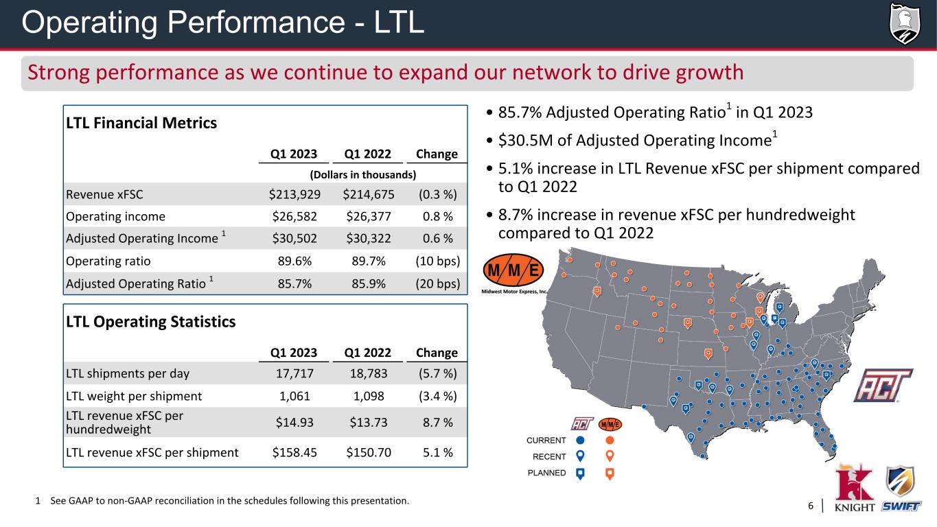 5 • 86.6% Adjusted Operating Ratio1 in Q1 2023 compared to 78.2% the previous year • 43.4% year-over-year decrease in Adjusted Operating Income1 • Largest truckload trailer fleet continues to grow and now over 79,000 • Truckload average revenue per tractor improving in our dedicated division but offset by declines in the OTR business • Margin impacted by $8.5M pre-tax insurance and claims expense for development on large losses from claim years 2018-2020, primarily related to an unfavorable jury verdict in 1Q 1 See GAAP to non-GAAP reconciliation in the schedules following this presentation. Truckload Operating Statistics Q1 2023 Q1 2022 Change Average revenue per tractor $47,707 $52,409 (9.0 %) Average tractors 18,152 17,965 1.0 % Average trailers 79,490 71,310 11.5 % Miles per tractor 18,405 18,916 (2.7 %) Truckload Financial Metrics Q1 2023 Q1 2022 Change (Dollars in thousands) Revenue xFSC $865,980 $941,534 (8.0 %) Operating income $115,899 $205,117 (43.5 %) Adjusted Operating Income 1 $116,242 $205,441 (43.4 %) Operating ratio 88.6% 81.0% 760 bps Adjusted Operating Ratio 1 86.6% 78.2% 840 bps Controlling cost in difficult environment, positioning for recovery Operating Performance - Truckload