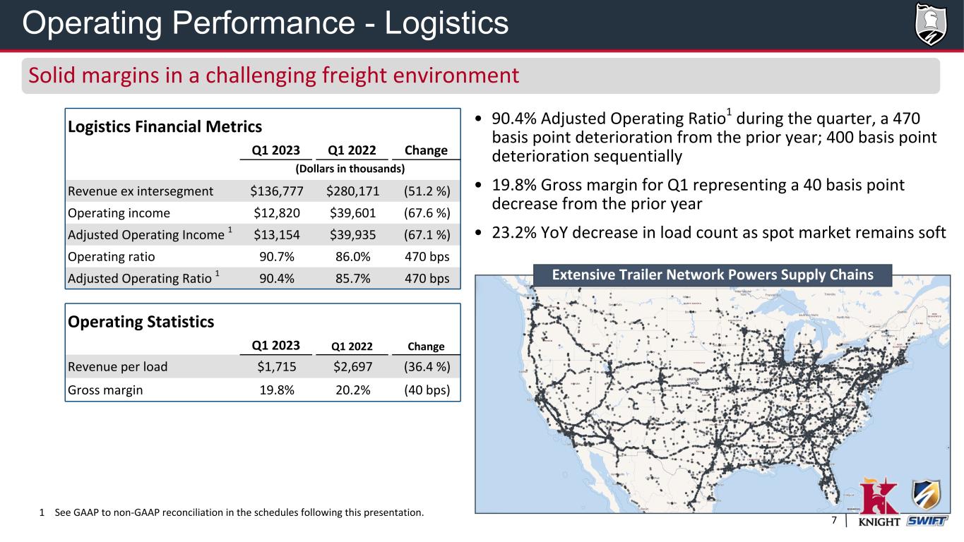 6 • 85.7% Adjusted Operating Ratio1 in Q1 2023 • $30.5M of Adjusted Operating Income1 • 5.1% increase in LTL Revenue xFSC per shipment compared to Q1 2022 • 8.7% increase in revenue xFSC per hundredweight compared to Q1 2022 LTL Operating Statistics Q1 2023 Q1 2022 Change LTL shipments per day 17,717 18,783 (5.7 %) LTL weight per shipment 1,061 1,098 (3.4 %) LTL revenue xFSC per hundredweight $14.93 $13.73 8.7 % LTL revenue xFSC per shipment $158.45 $150.70 5.1 % 1 See GAAP to non-GAAP reconciliation in the schedules following this presentation. LTL Financial Metrics Q1 2023 Q1 2022 Change (Dollars in thousands) Revenue xFSC $213,929 $214,675 (0.3 %) Operating income $26,582 $26,377 0.8 % Adjusted Operating Income 1 $30,502 $30,322 0.6 % Operating ratio 89.6% 89.7% (10 bps) Adjusted Operating Ratio 1 85.7% 85.9% (20 bps) Operating Performance - LTL Strong performance as we continue to expand our network to drive growth
